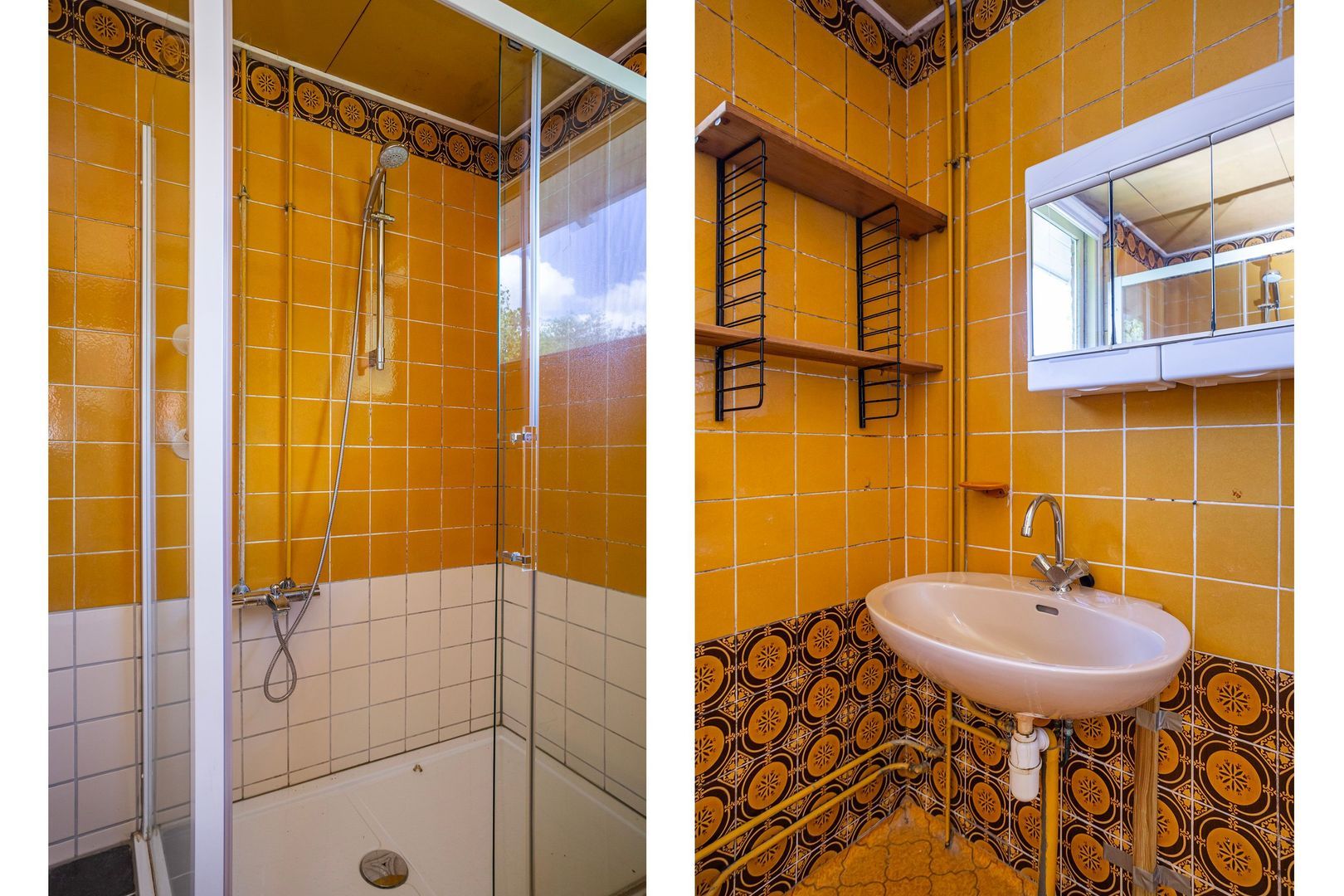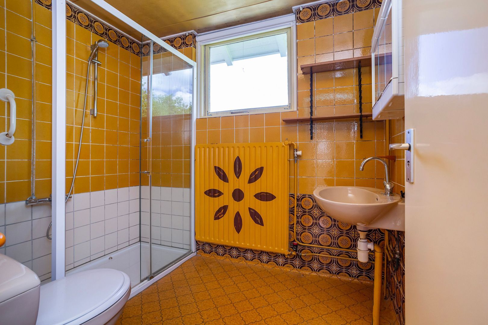 De badkamer met douche, wc en wastafel.