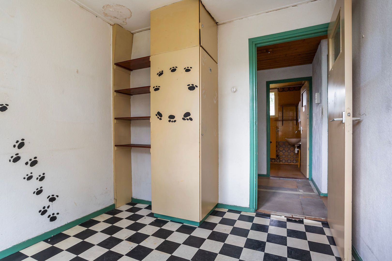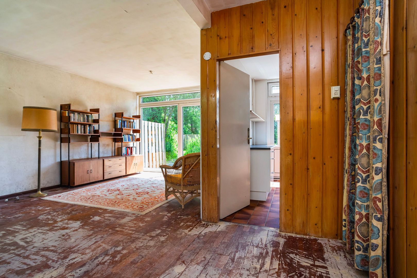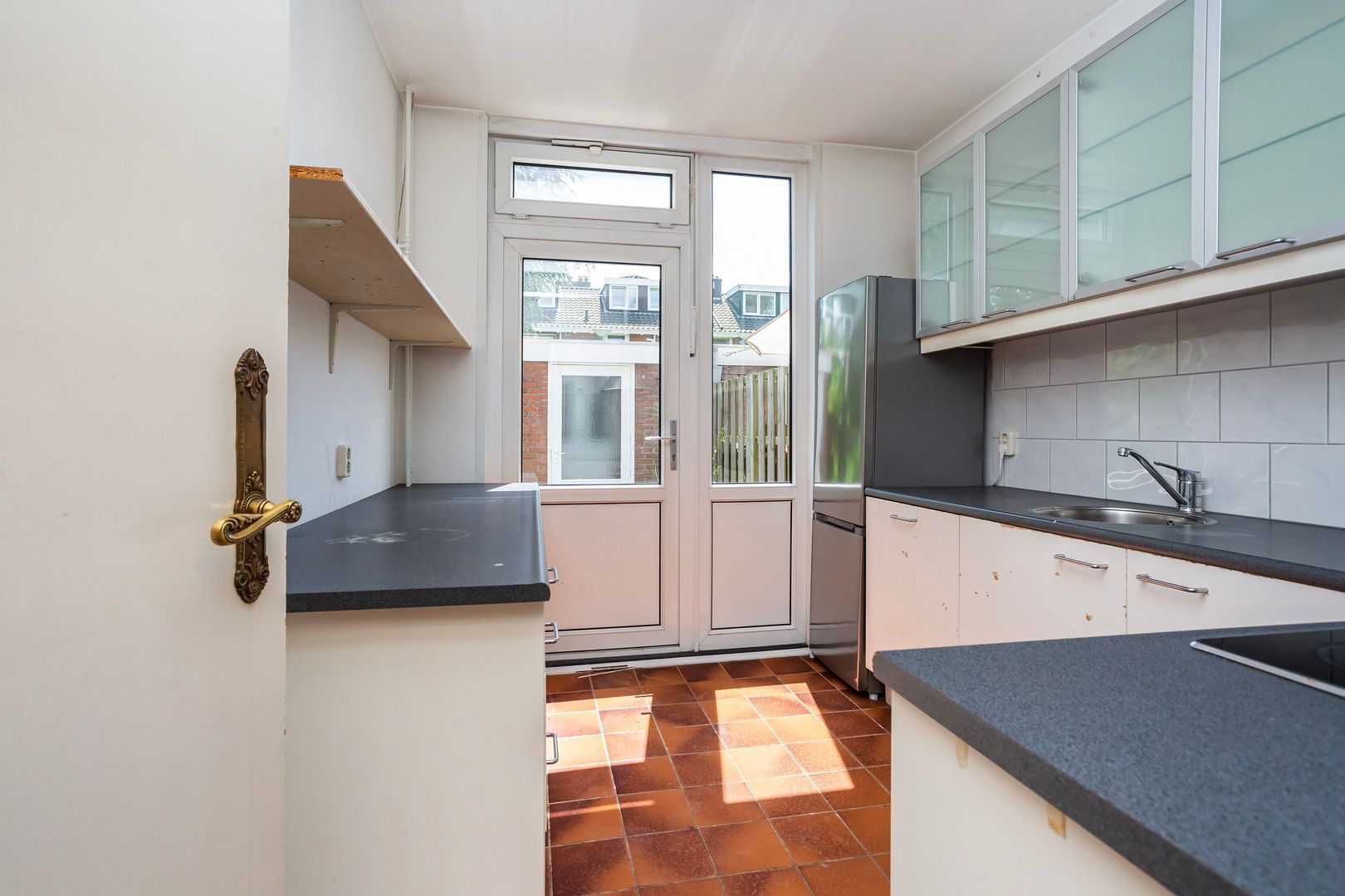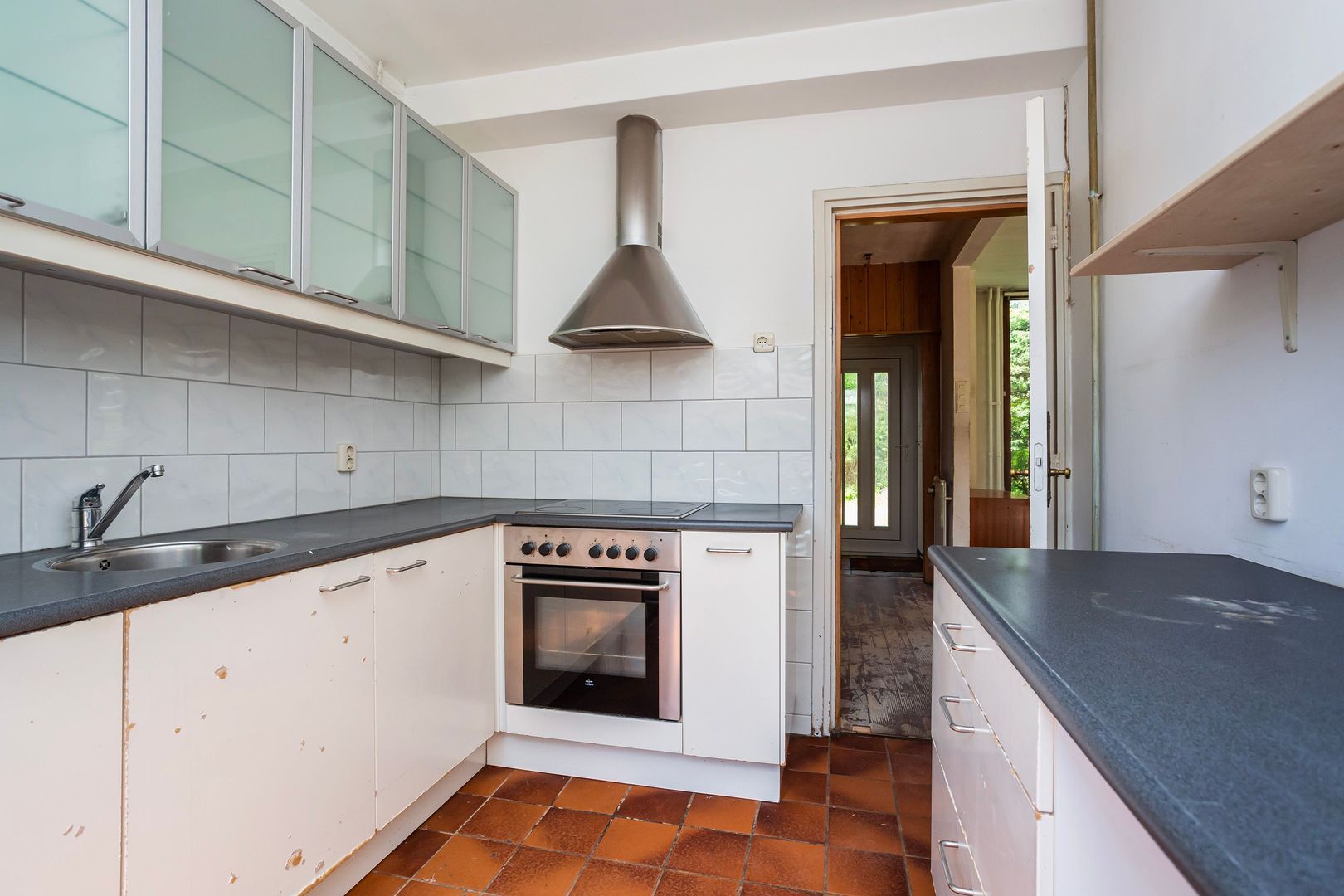 Brede keuken ca. 7,50m², met buitendeur en een eenvoudige keukenopstelling.