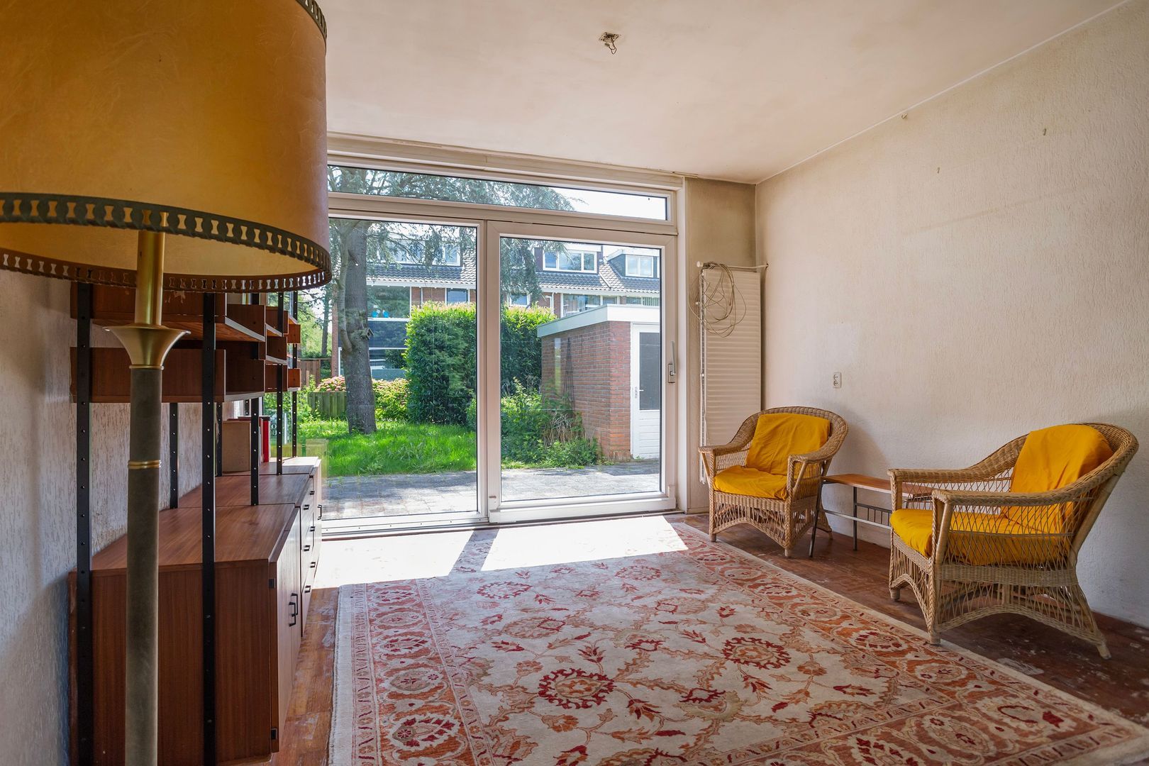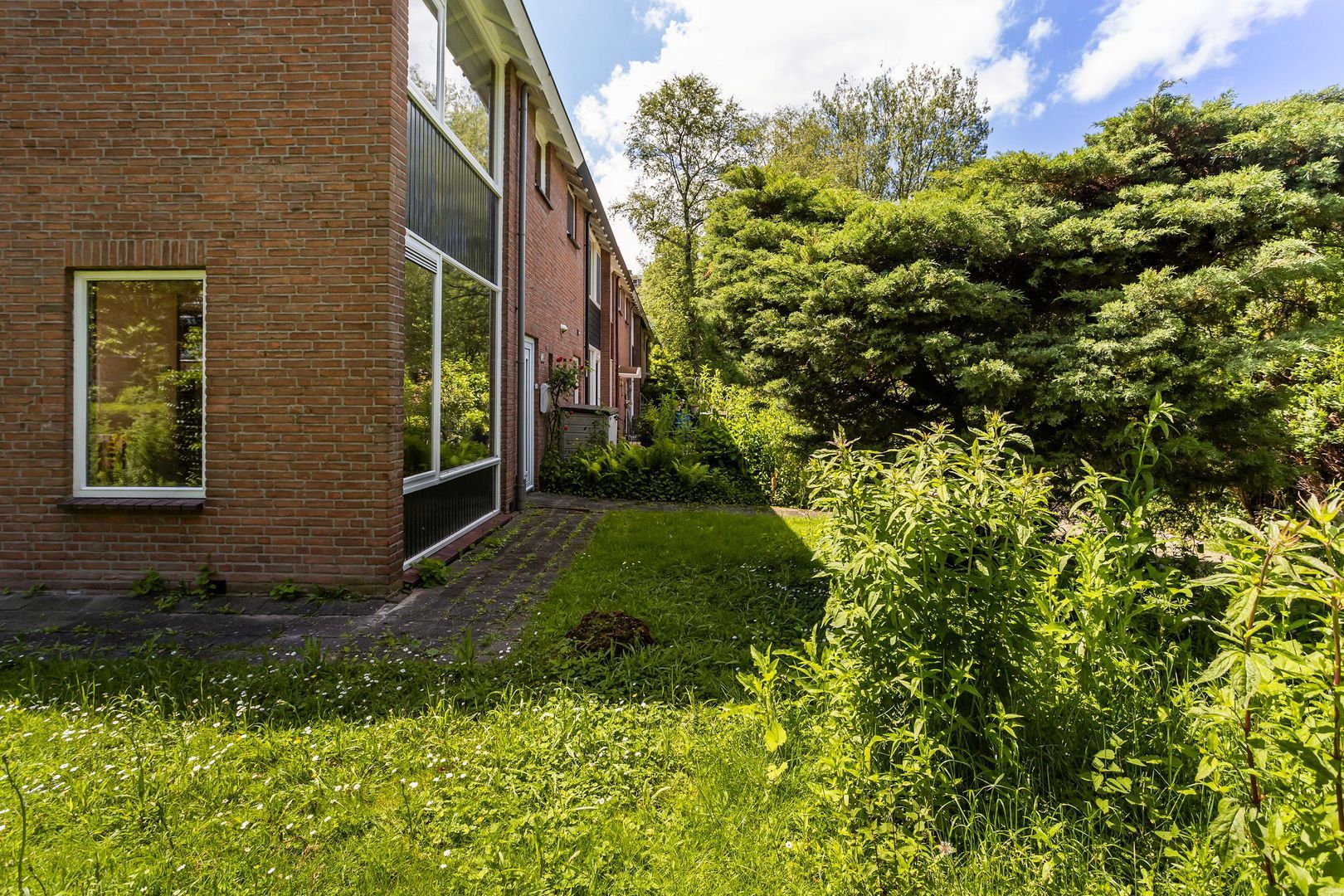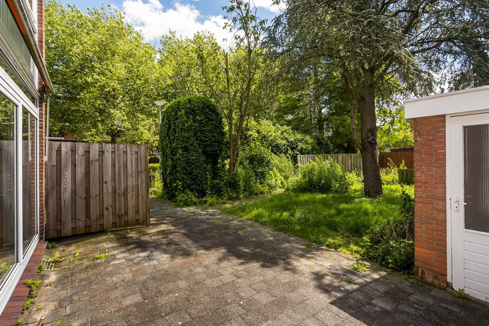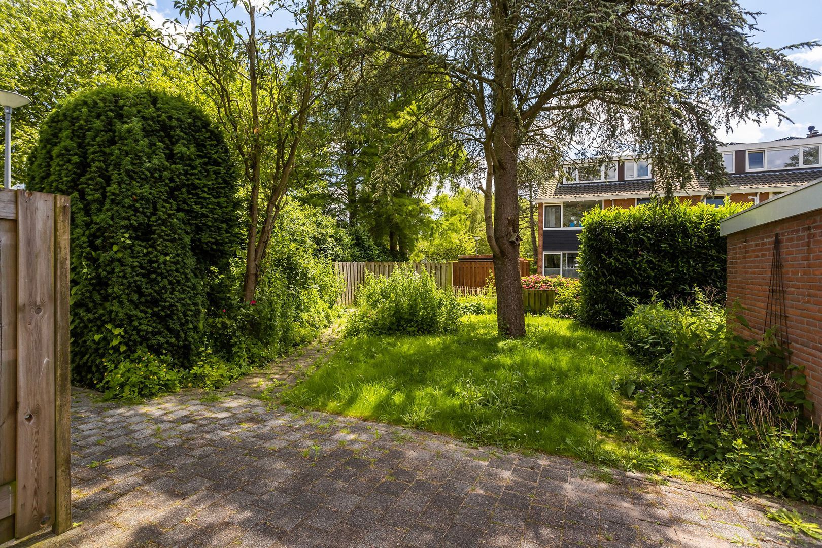 Enorme voor-, zij- en achtertuin op het zuiden. Stenen schuur ca. 5m² en achterom.