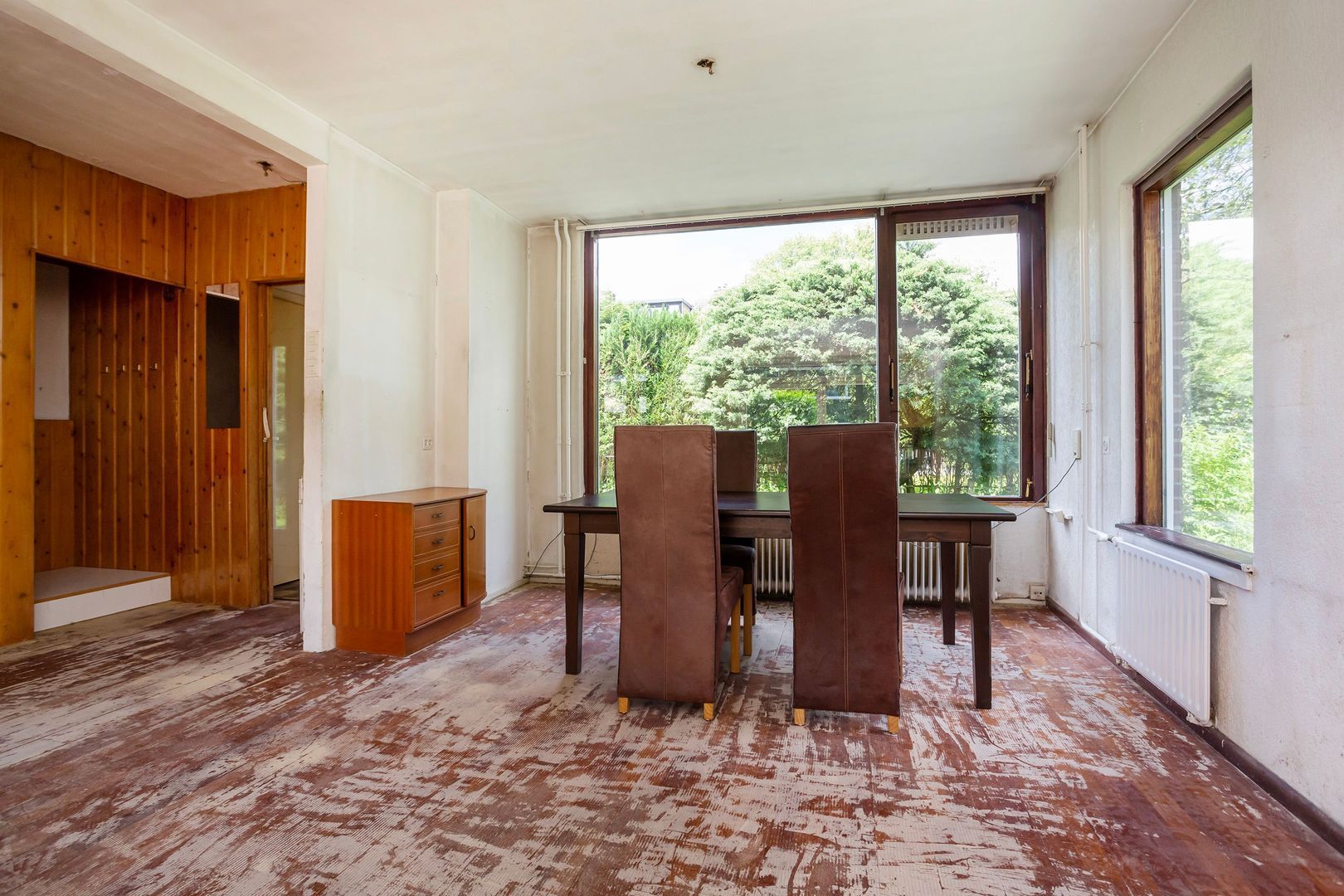 Woonkamer (inclusief de voormalige gang) (1) ca. 32m² met glas rondom en een glazen schuifwand naar de enorme  TUIN.