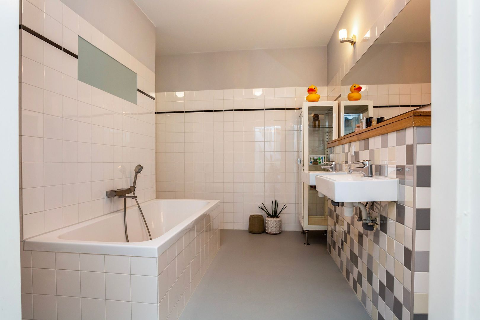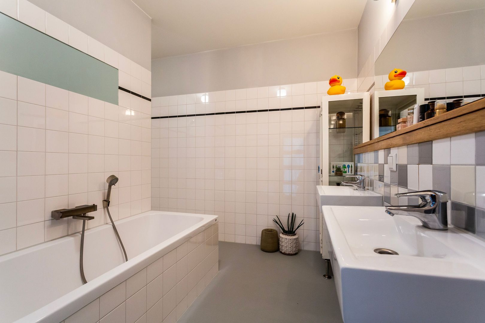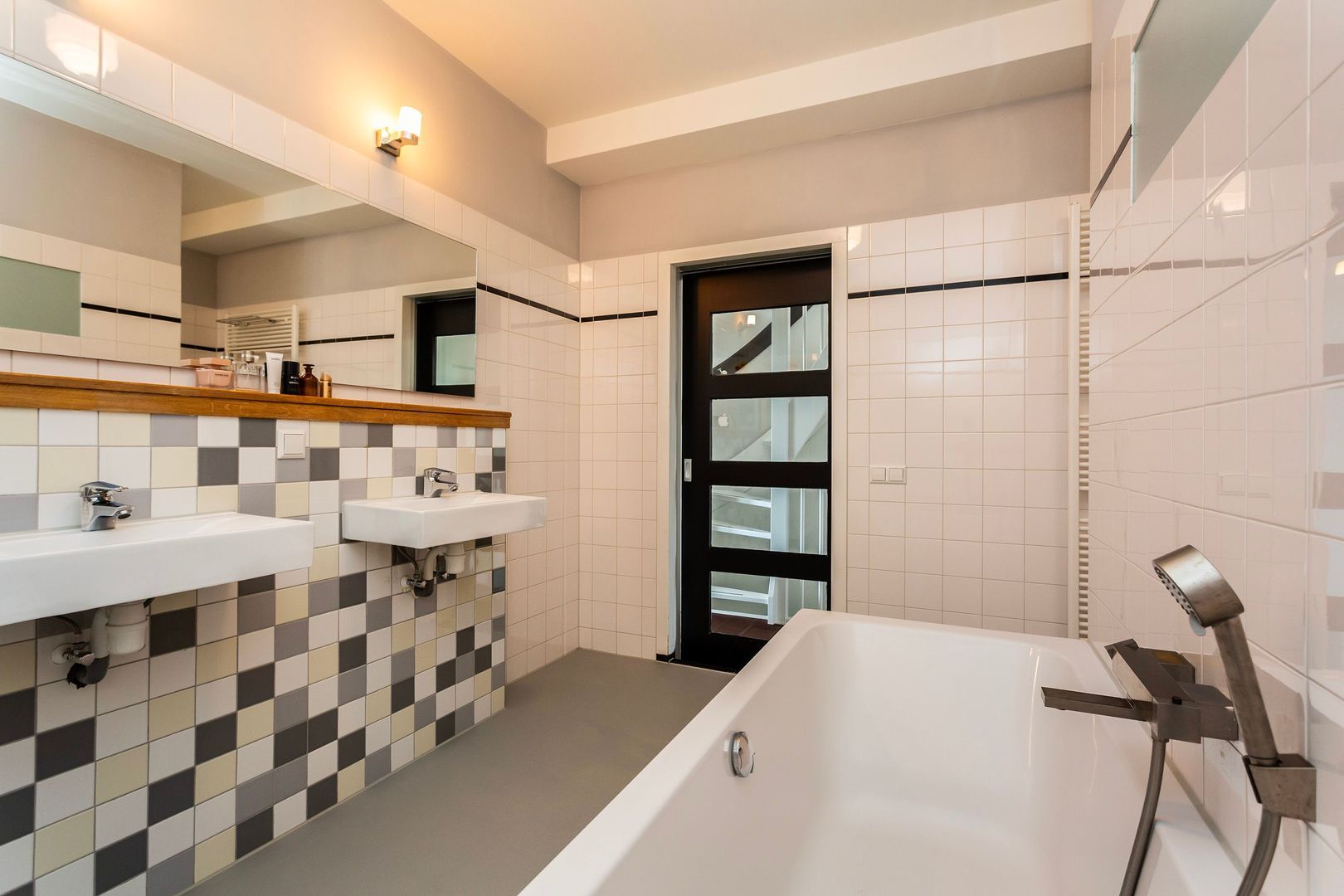 Tussengelegen grote badkamer (ca. 10m²) met dubbele wastafel, ligbad en een (van 2 kanten bereikbare regendoucheruimte.