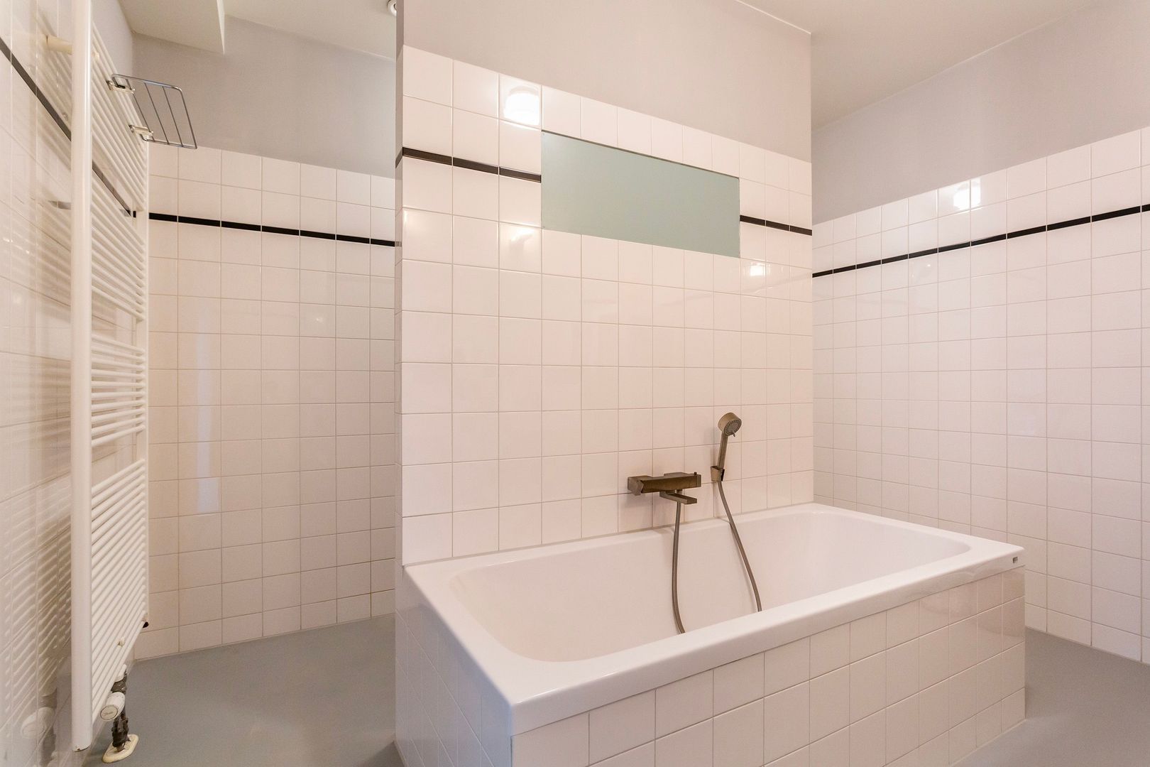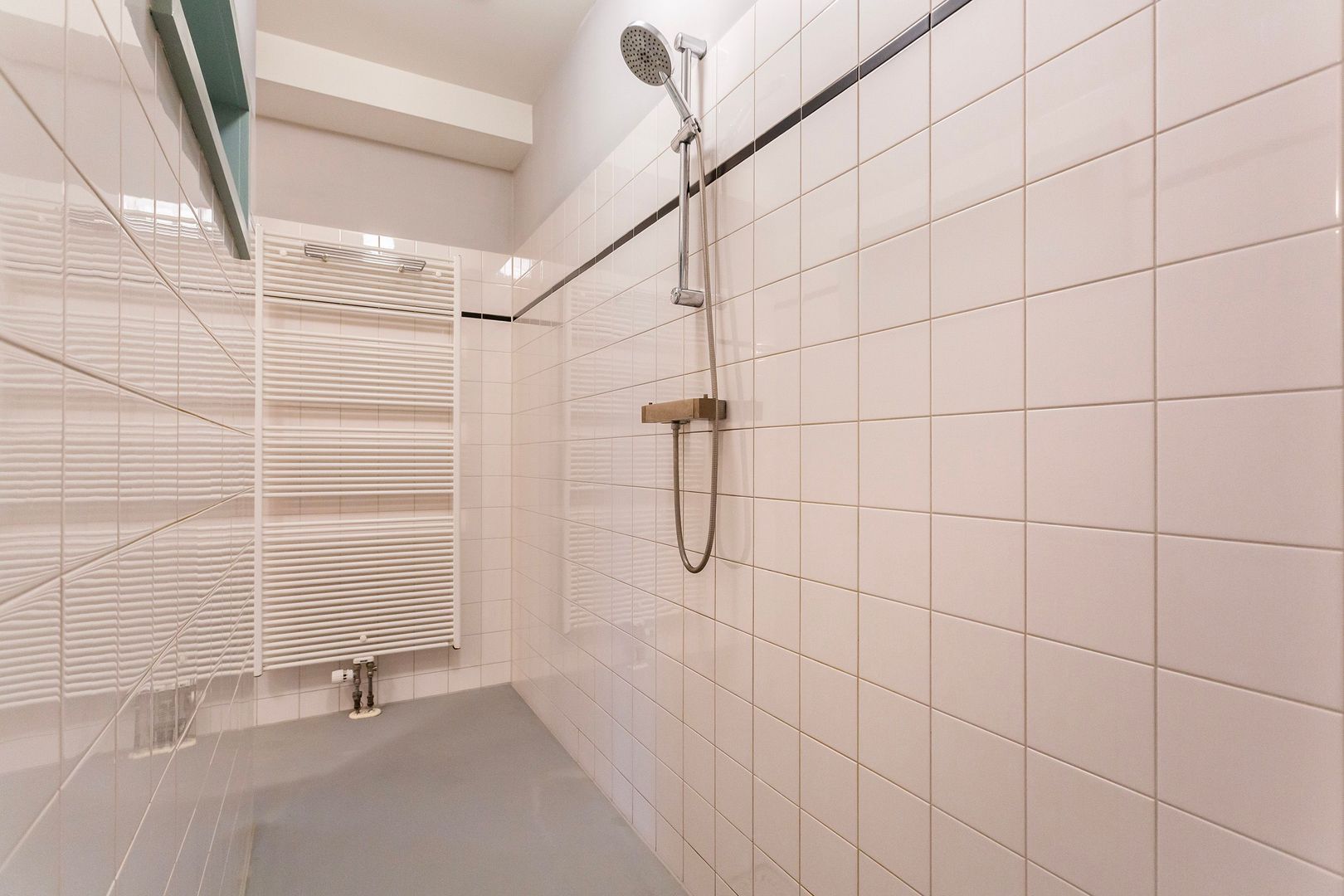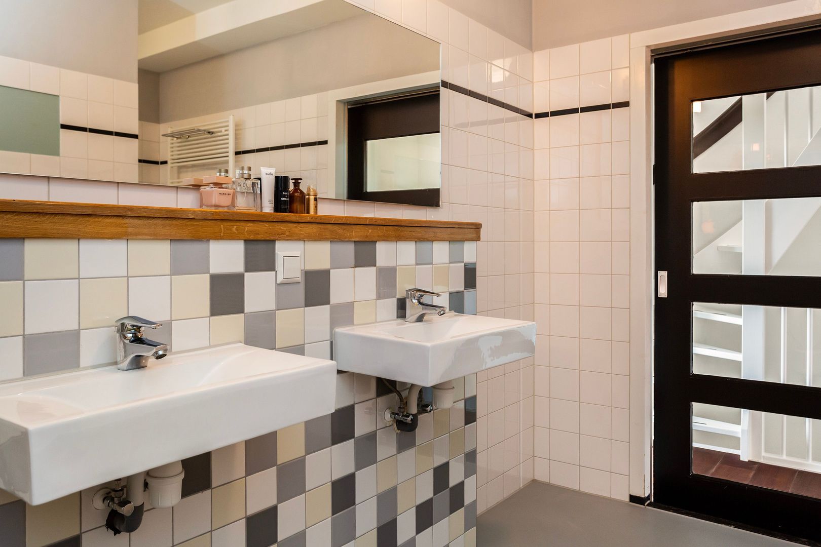 Tussengelegen grote badkamer (ca. 10m²) met dubbele wastafel, ligbad en een (van 2 kanten bereikbare regendoucheruimte.