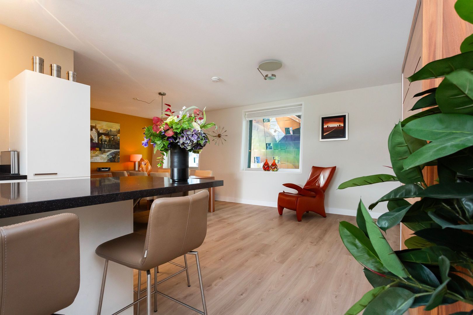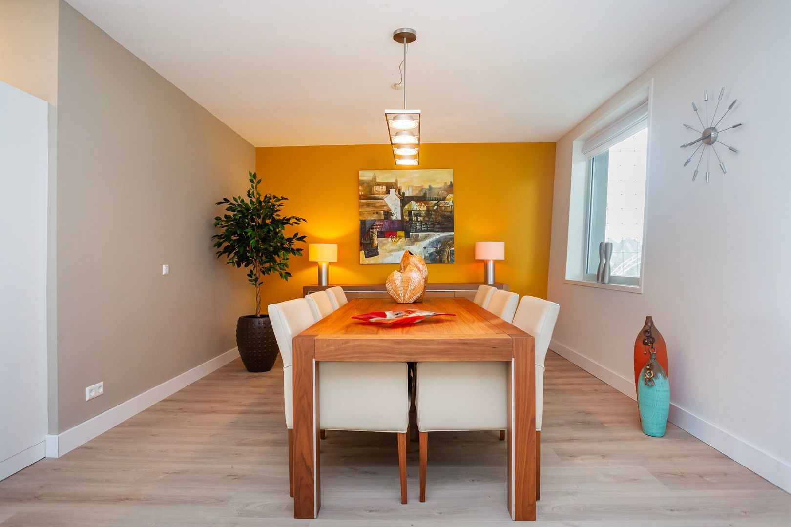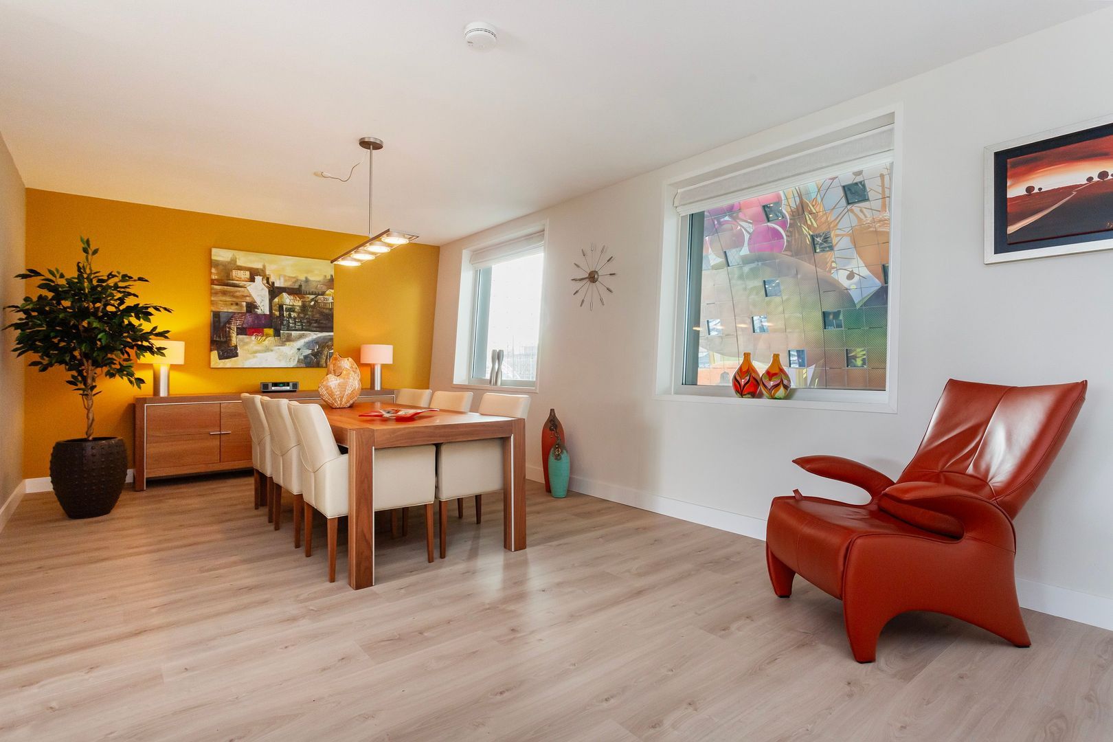 The living area/dining room offers a view of the lively Markthal through two large windows and provides a stunning view of the colorful murals by Arno Coenen.