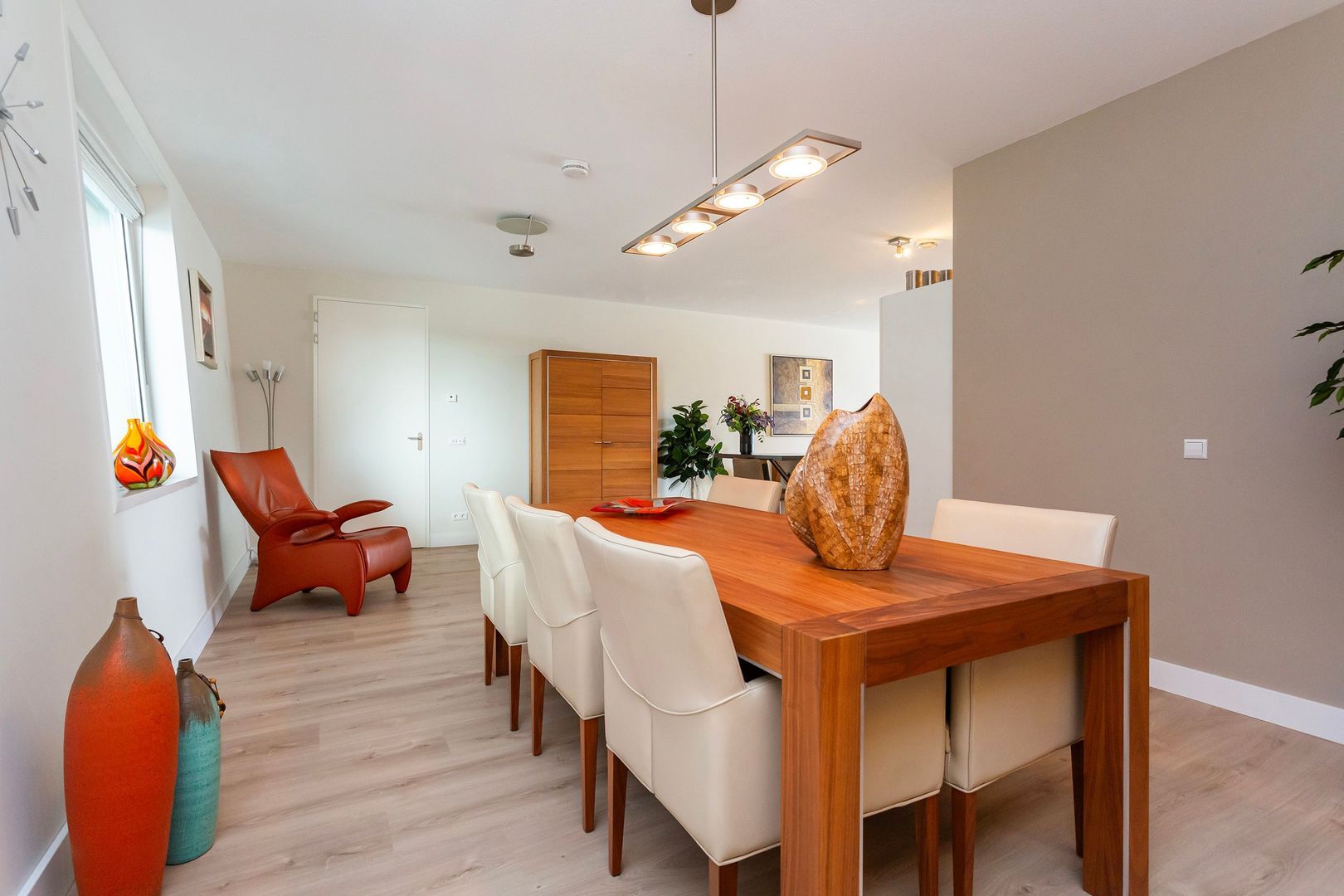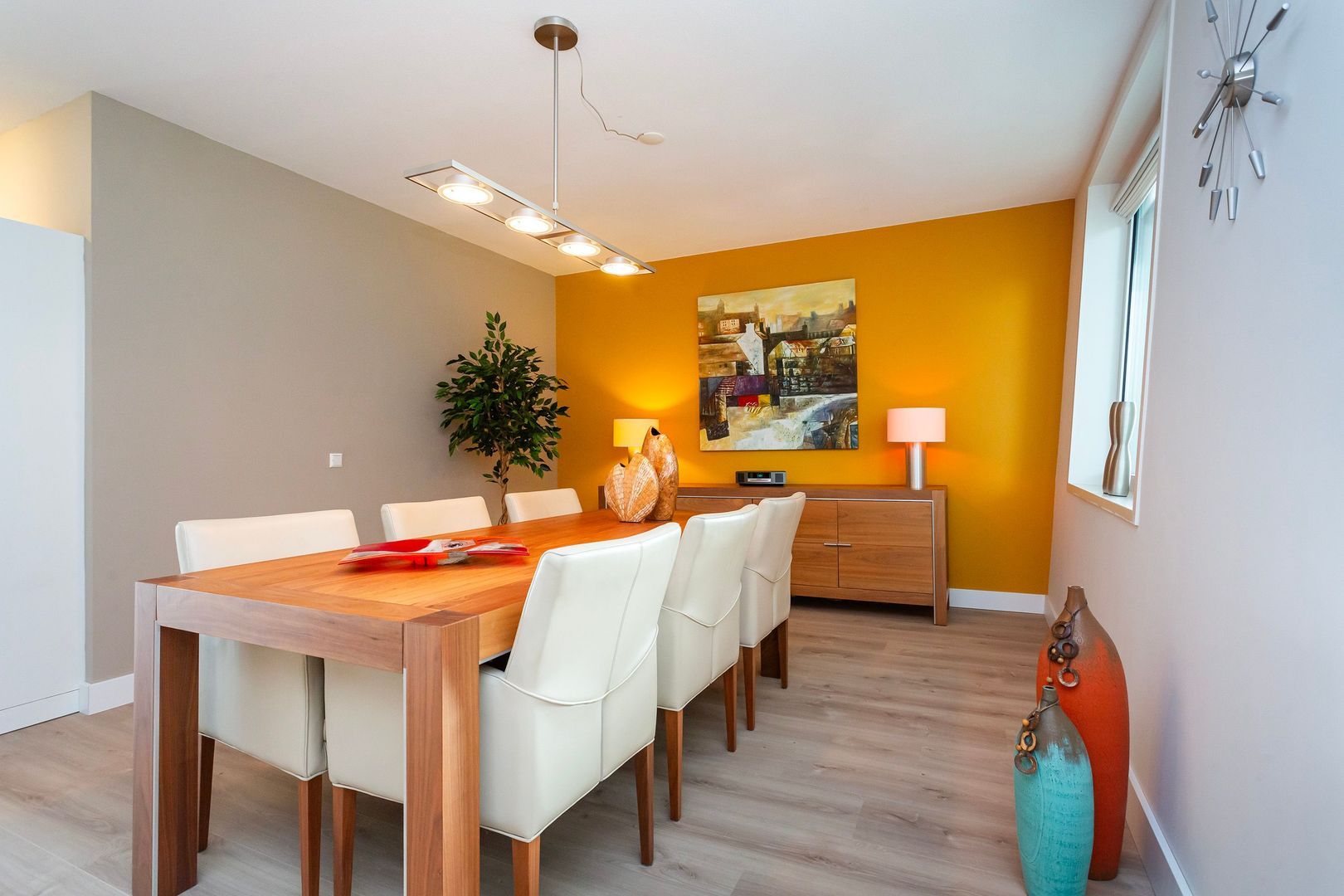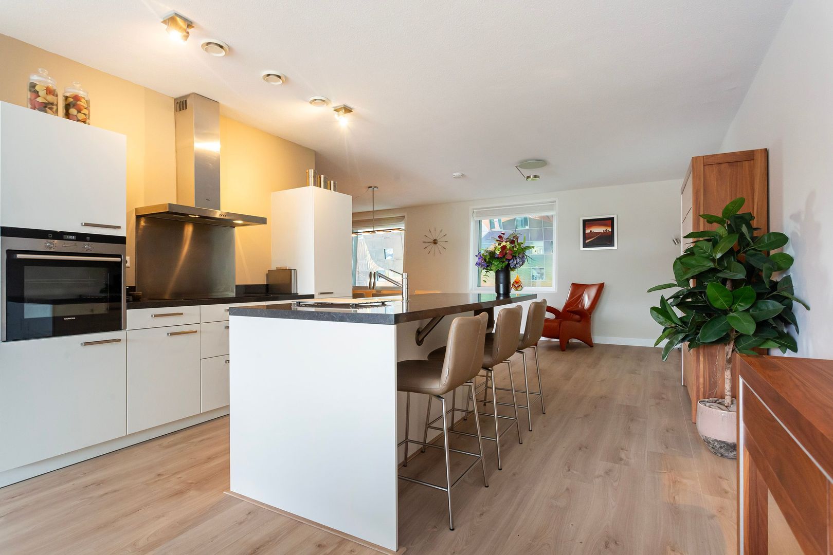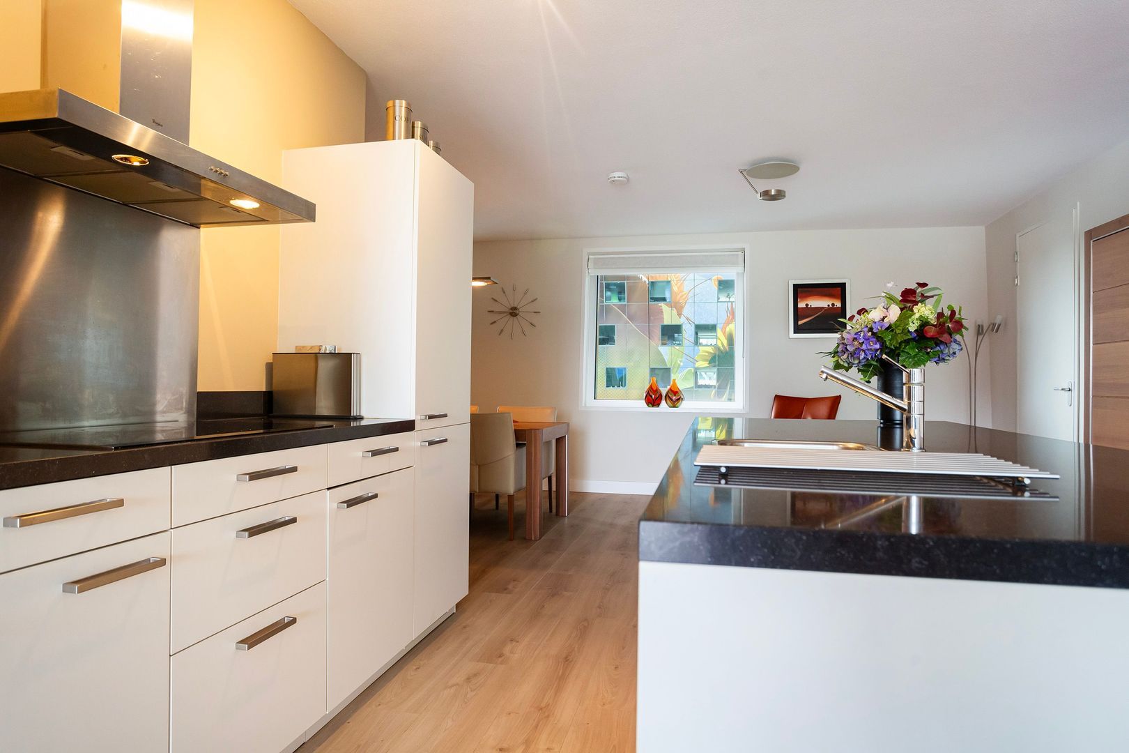 The living area/dining room offers a view of the lively Markthal through two large windows and provides a stunning view of the colorful murals by Arno Coenen.