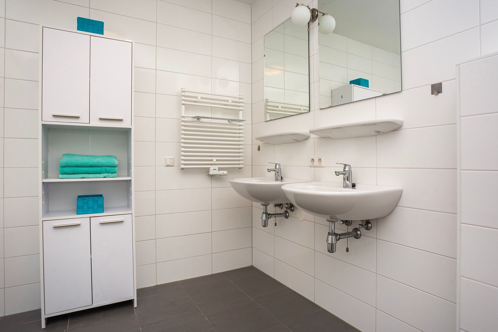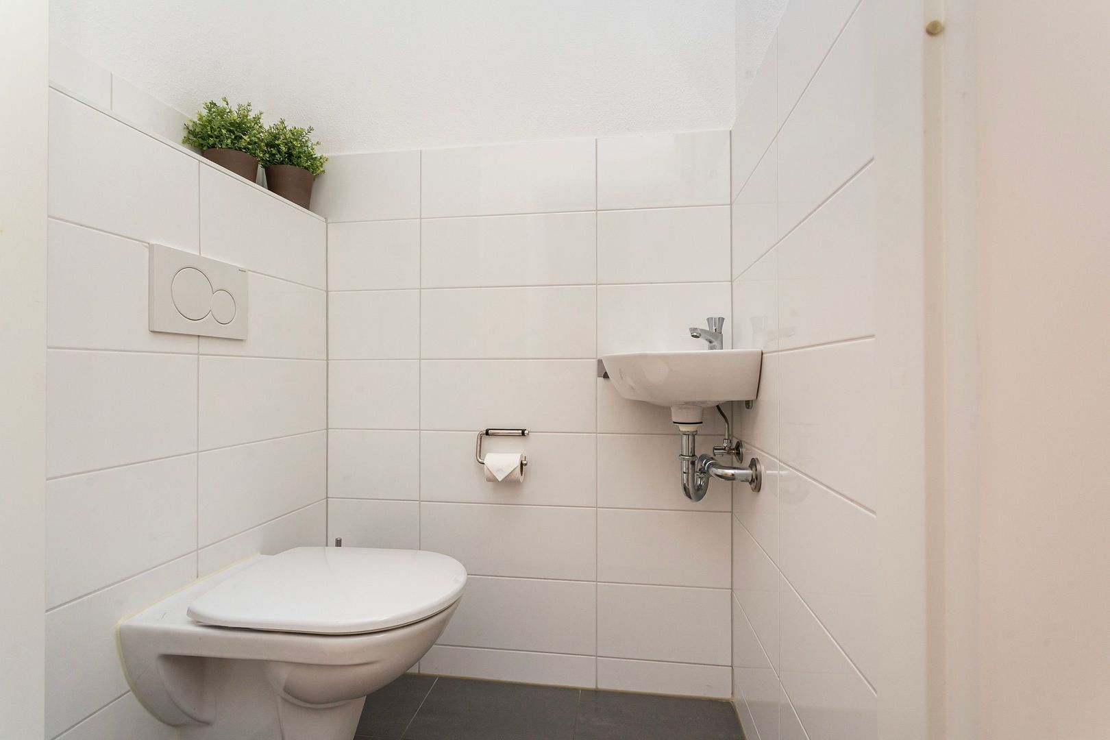 Entrance and spacious light hallway with meter cupboard, 2 storage rooms (one with connections for a washing machine and dryer), toilet room with hanging toilet and a small sink.