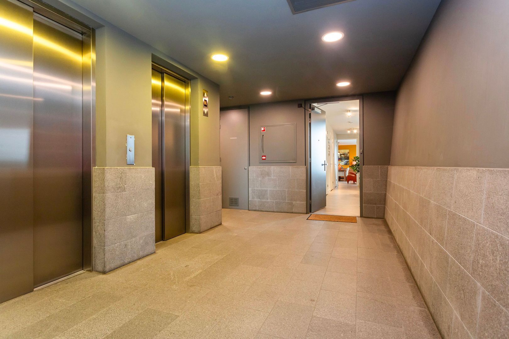Entrance, hallway with elevators, staircase, intercom system, and mailboxes.
