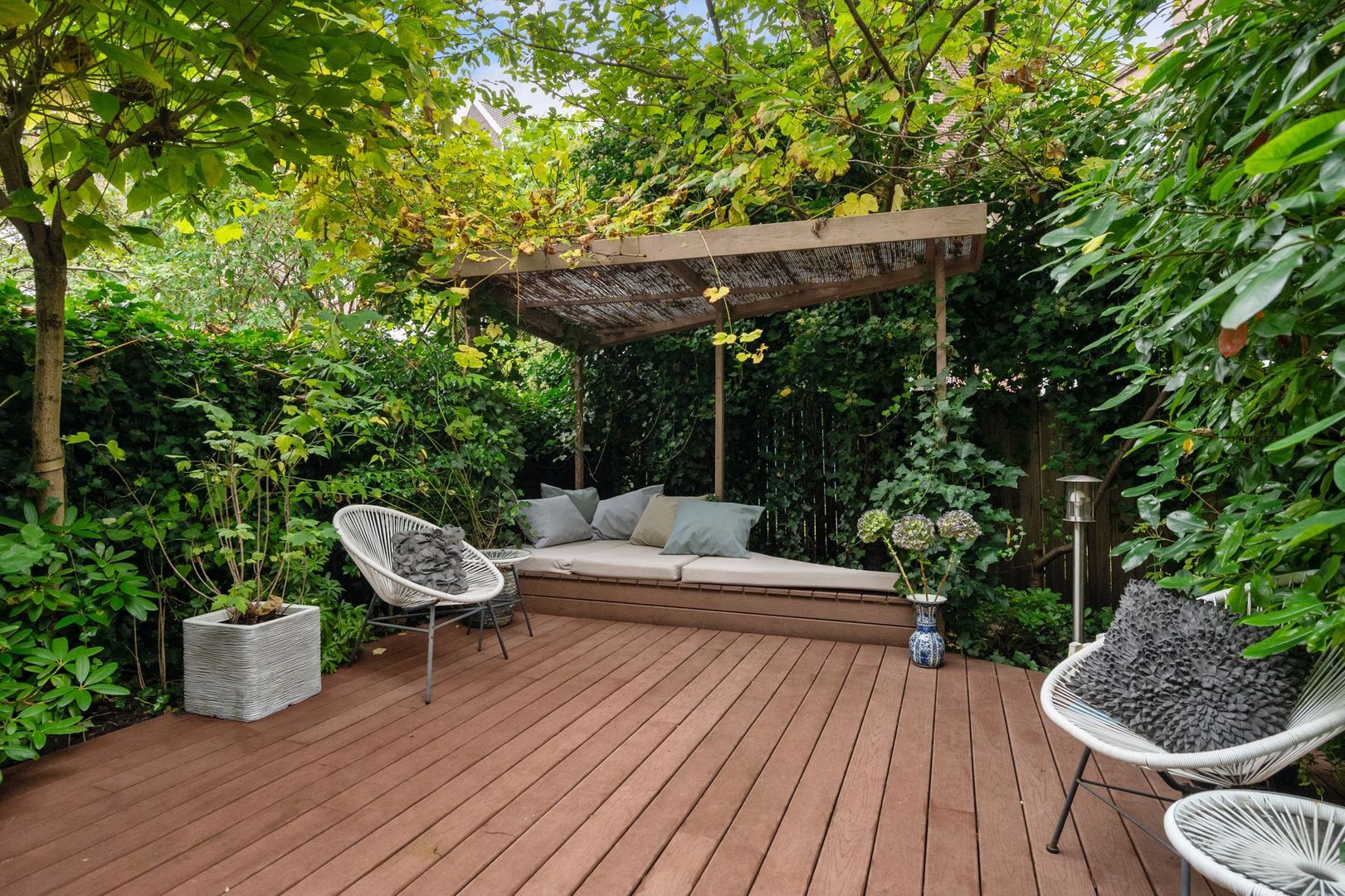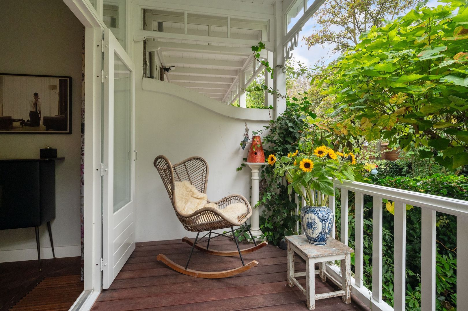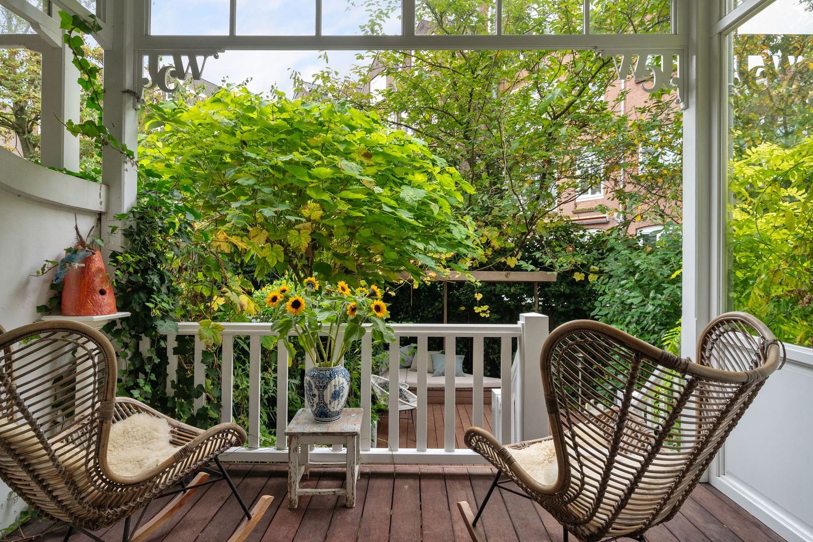 Diepe veranda (óók uit 2021!) met ruime zitgelegenheid en prachtig hout(snij) werk, met een knipoog naar haar oorspronkelijke bouwmeester…. Enkele luie traptreden naar de heerlijk parkachtige tuin, waar vlinders en vogels ’s-zomers met je meegenieten van bloemen en stilte. Er is een overdekte zit/lig(val-in-slaap) gelegenheid gemaakt achter in de tuin.