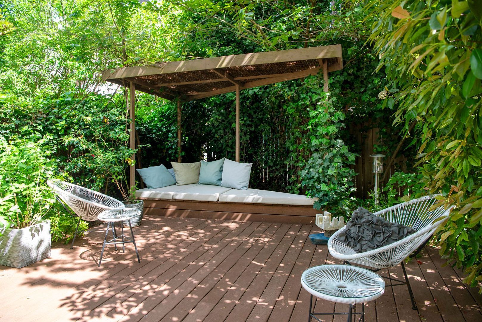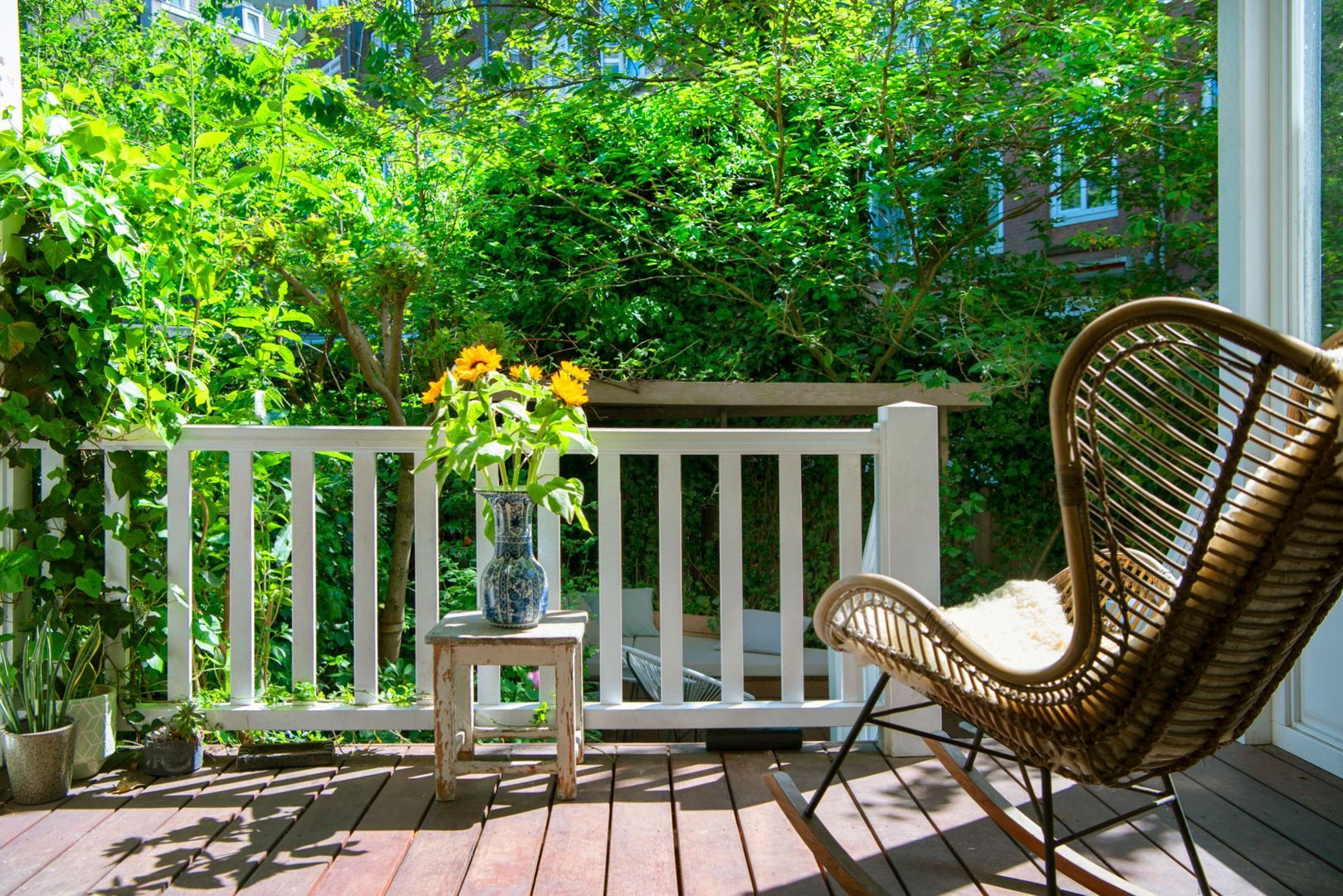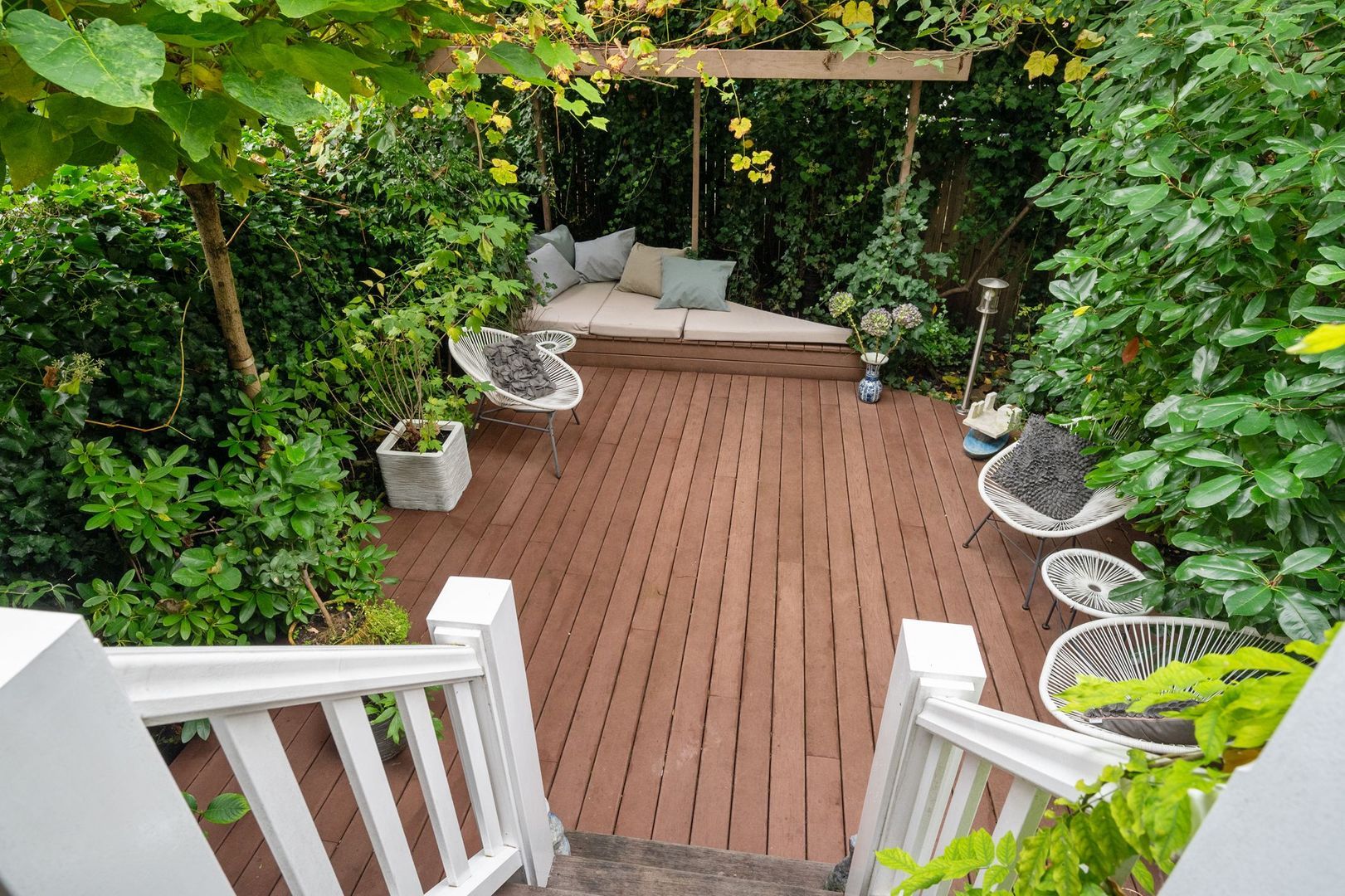 Diepe veranda (óók uit 2021!) met ruime zitgelegenheid en prachtig hout(snij) werk, met een knipoog naar haar oorspronkelijke bouwmeester…. Enkele luie traptreden naar de heerlijk parkachtige tuin, waar vlinders en vogels ’s-zomers met je meegenieten van bloemen en stilte. Er is een overdekte zit/lig(val-in-slaap) gelegenheid gemaakt achter in de tuin.
