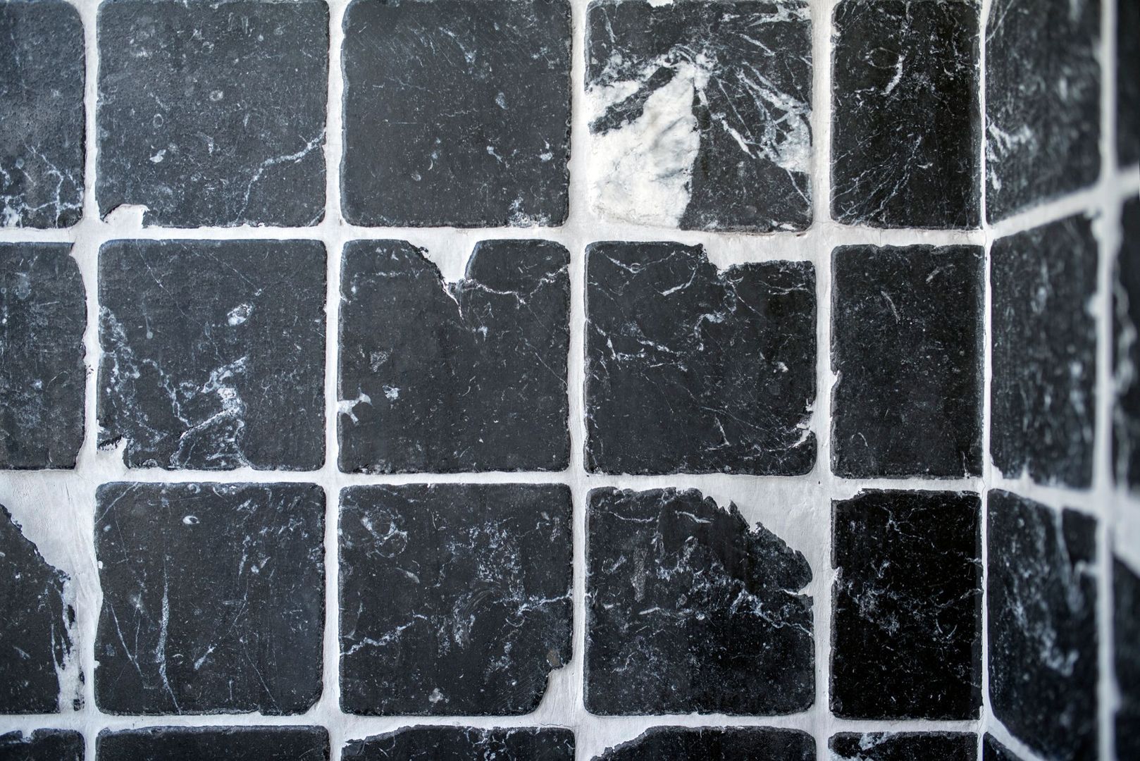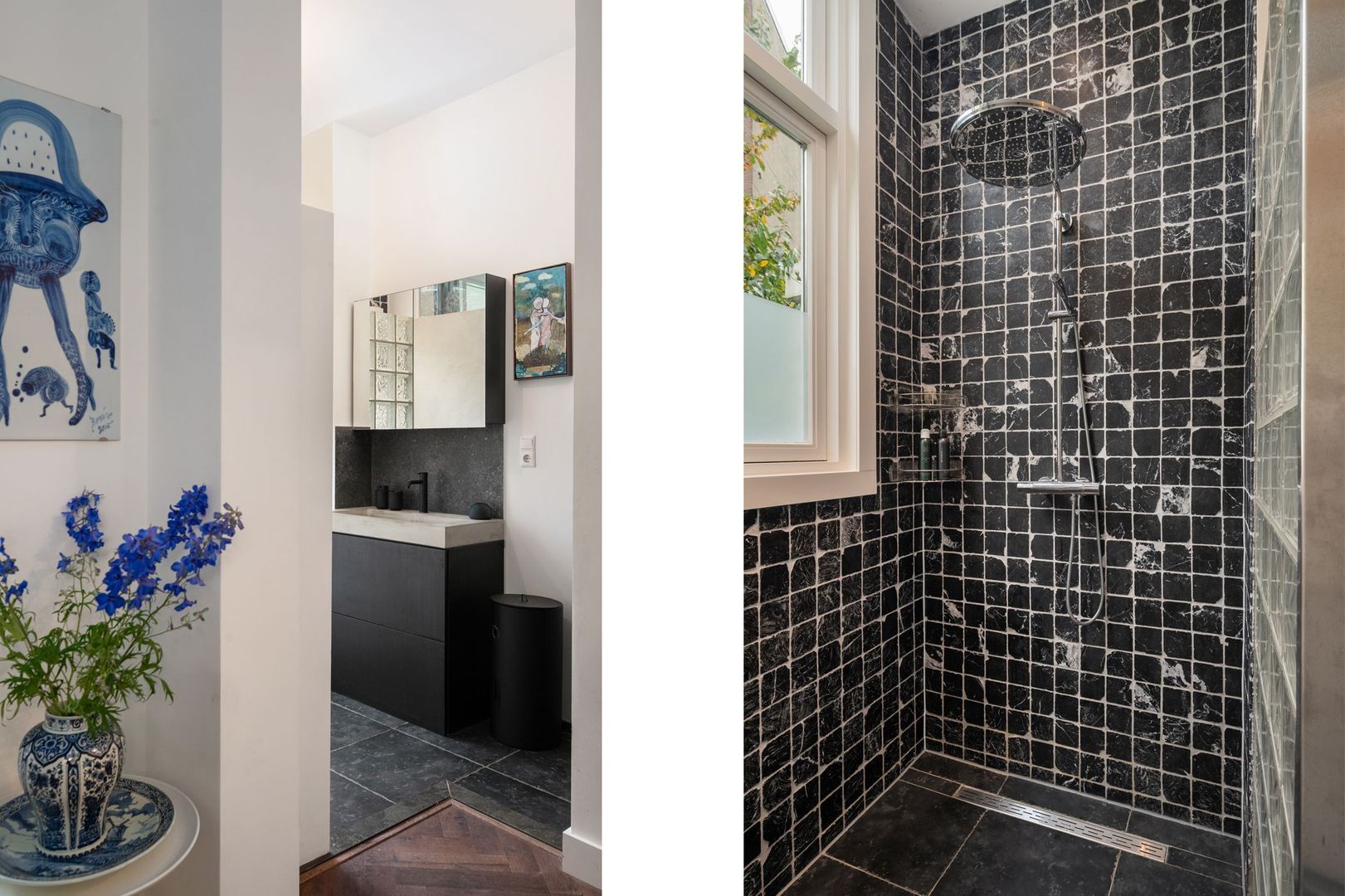 Grote badkamer met een zeer ruime douche met rainshower èn uitzicht op de tuin…, een brede natuurstenen wastafel, vloerverwarming en kastruimte. Vloer en wanden voorzien van natuursteen.