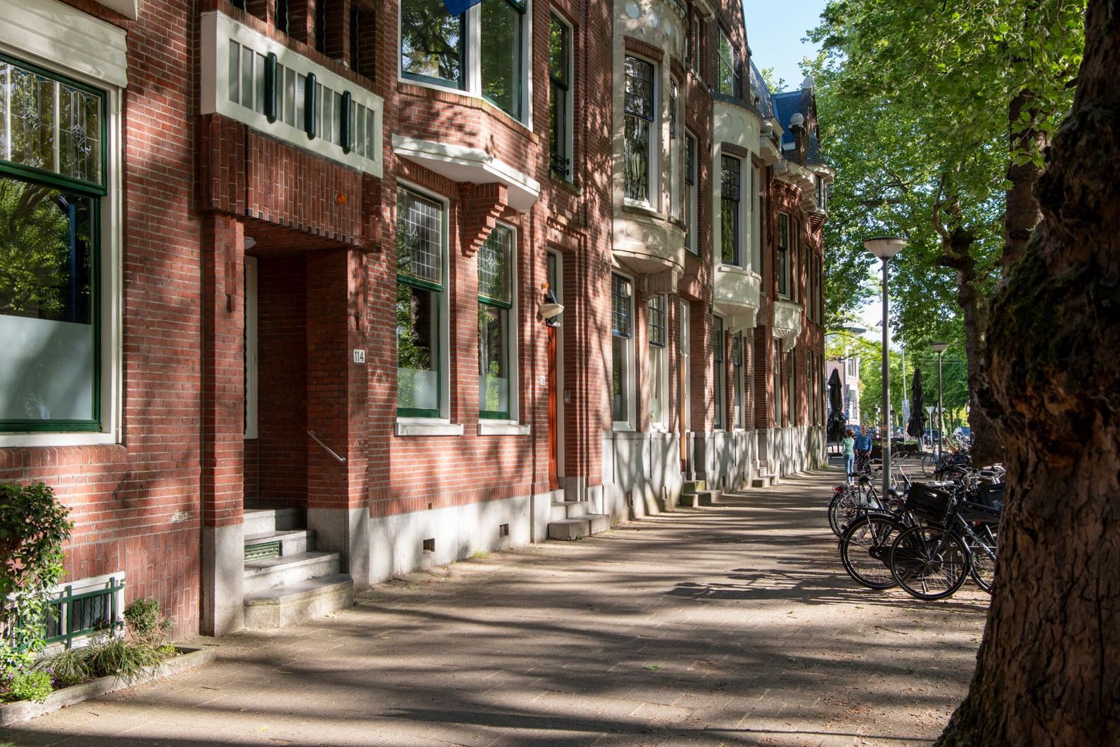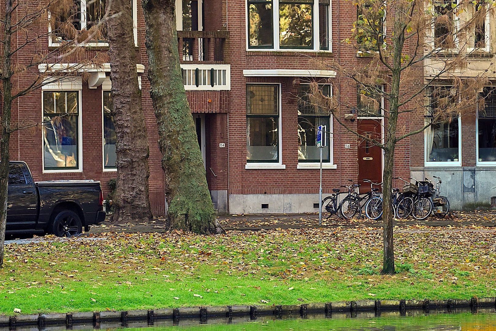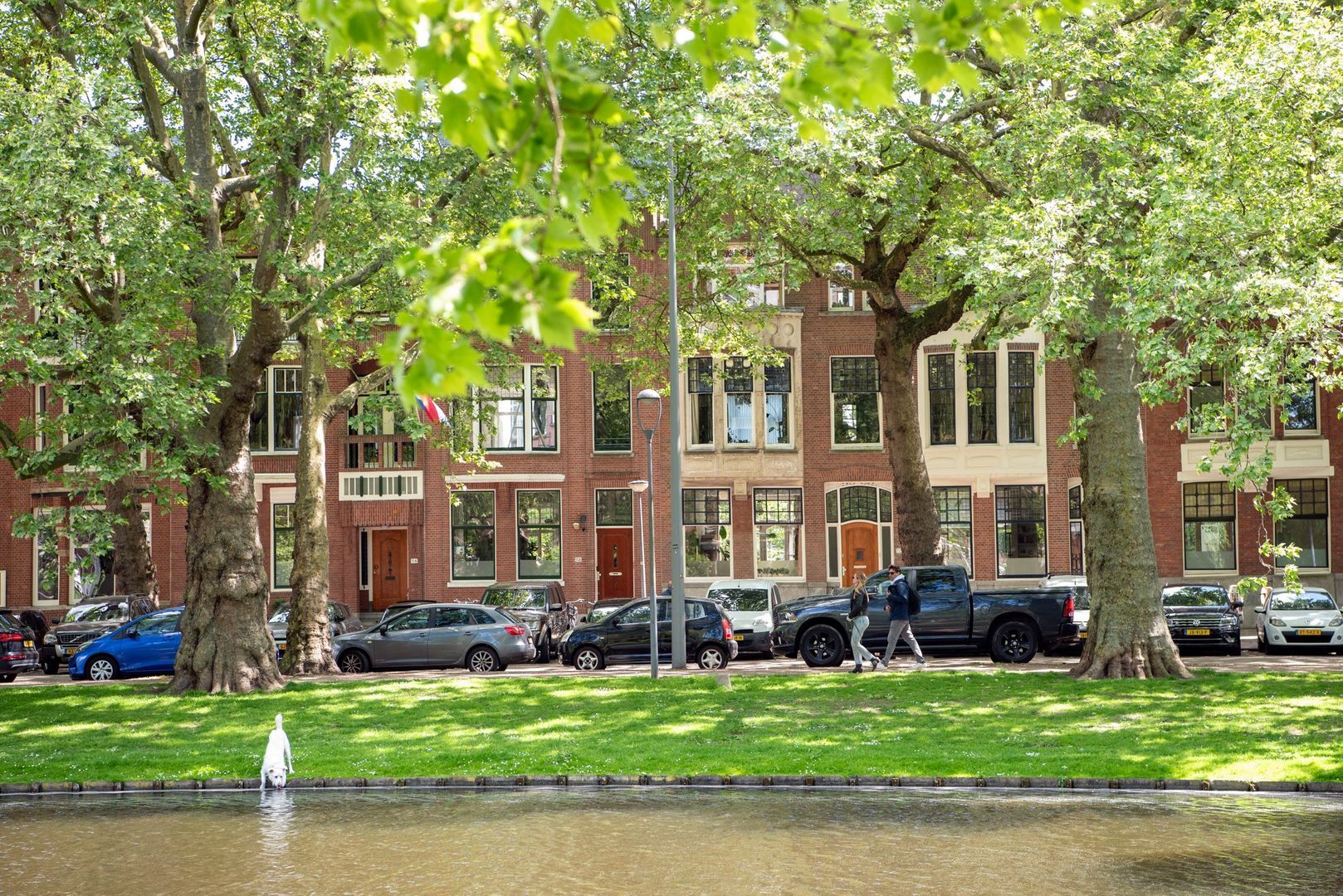Er is een fijn zicht ‘door bomen heen’ op authentieke panden aan de overzijde van de brede singel.