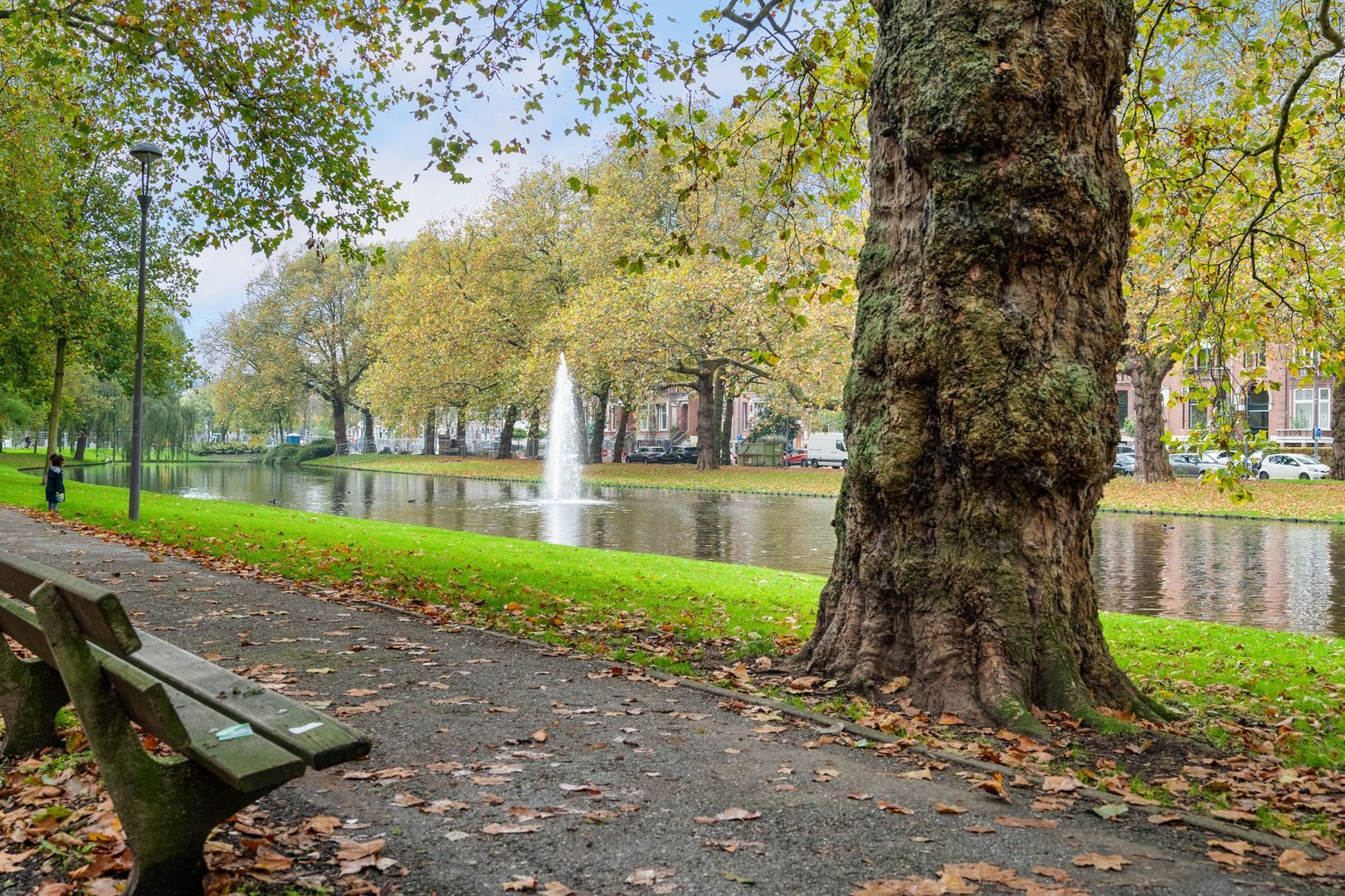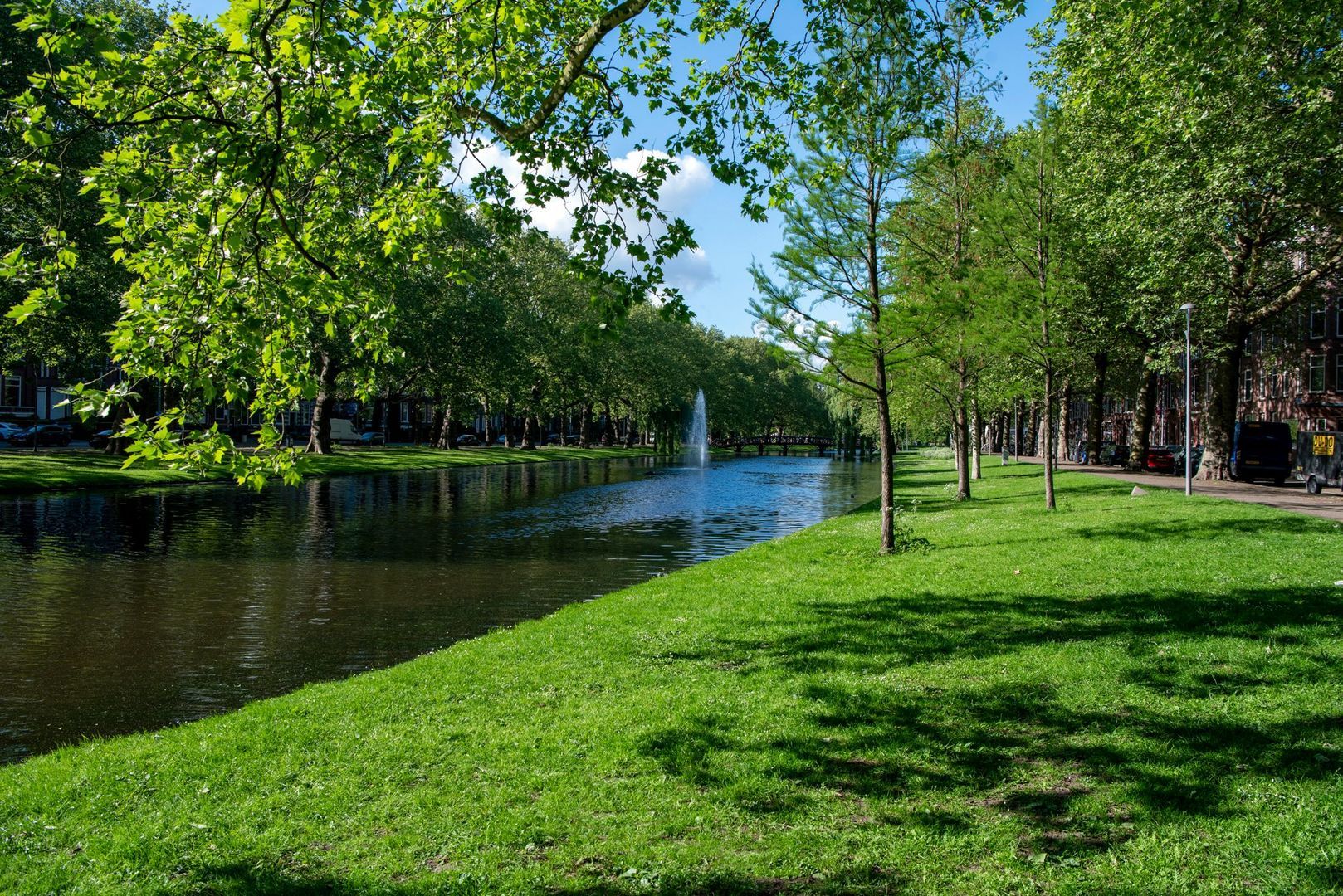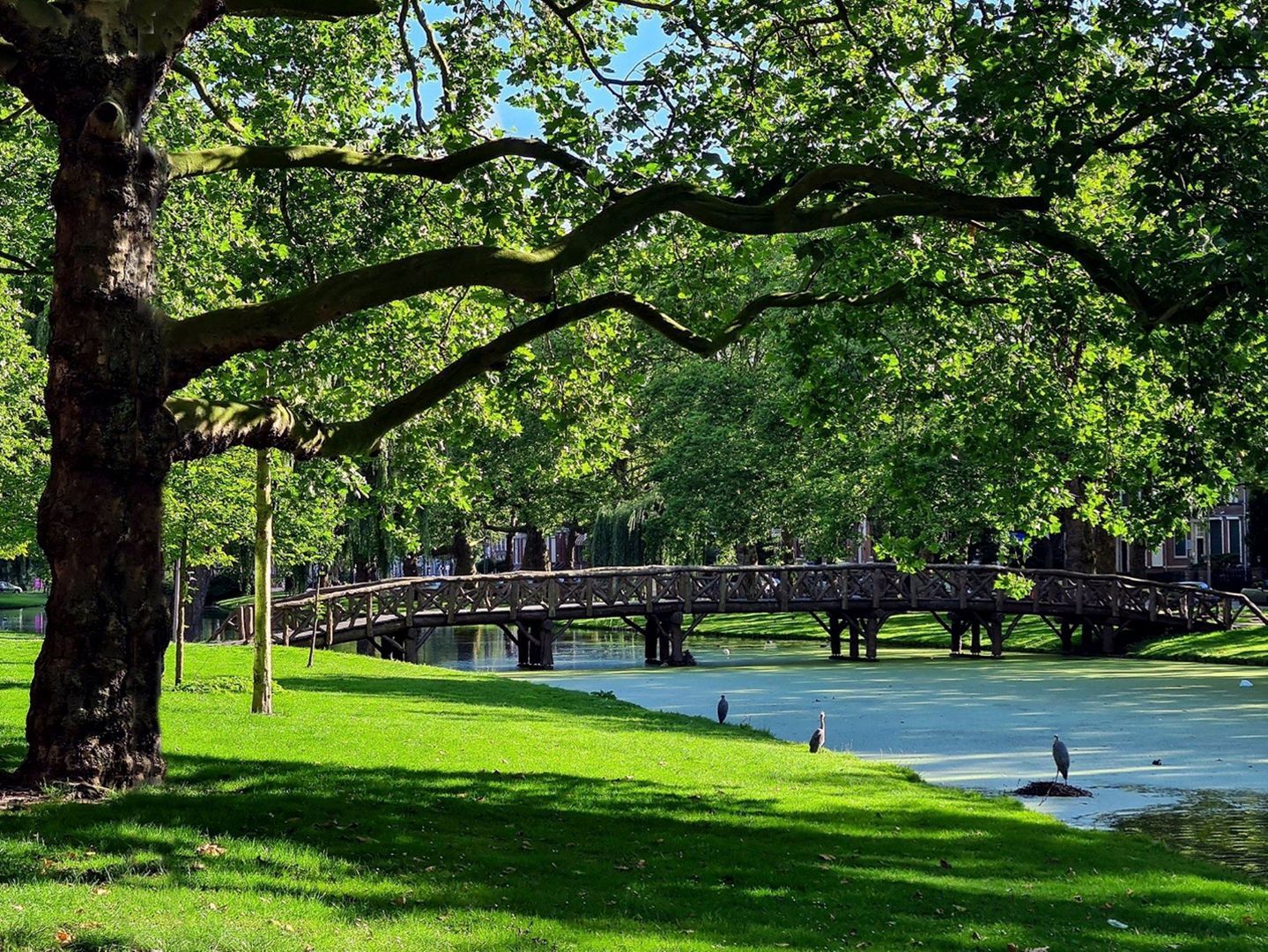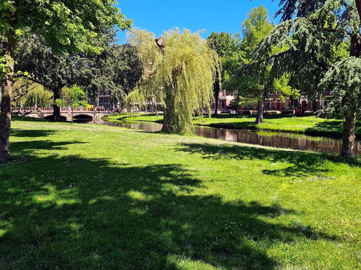 Er is een fijn zicht ‘door bomen heen’ op authentieke panden aan de overzijde van de brede singel.
