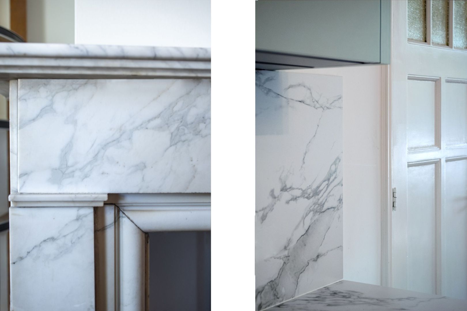 - Zitruimte aan de singelzijde met prachtige licht marmeren schouw met