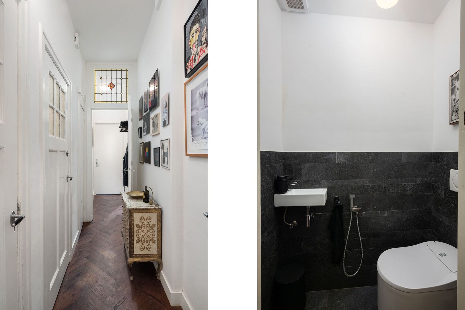 Mooie, huiselijke entree, de oorspronkelijke vestibule van het eens grote huis…… Eigen voordeur in de ‘oude’ hal, naar gang met toegang tot een toiletruimte met hangende (japanse) wc en fonteintje. Ook is in deze gang de toegang naar de verschillende kelderruimten.