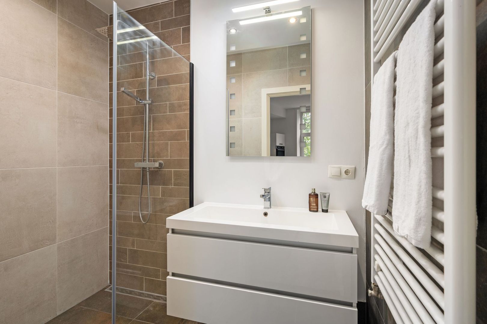 Badkamer(zand en natuurtinten..) met douche en brede wastafel.