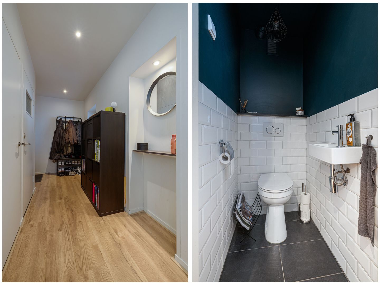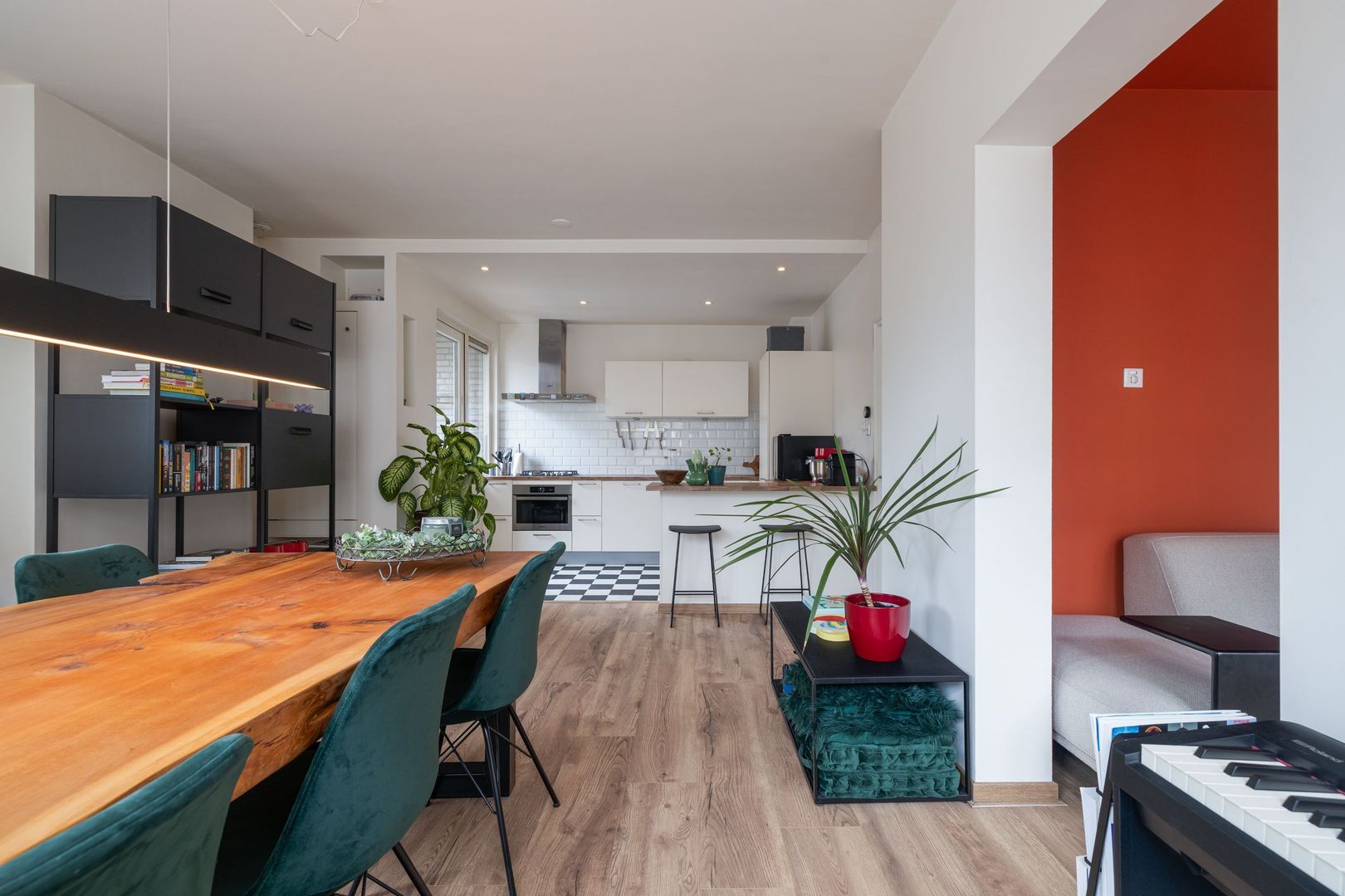 There is a spacious hall with access to the living and sleeping areas. There is enough space here for a wardrobe, a shoe cupboard and an extra cupboard. There is a separate toilet with a washbasin. Upon entering, you will immediately notice the spacious, bright living room (1) of approx. 33 m², which consists of a large room of 26 m² combined with an adjoining side room of 7 m². Thanks to its width and large windows, this is a wonderful living space where you can easily accommodate a spacious seating area, a dining table and a work corner. The living room provides access to both balconies, allowing the indoors and outdoors to flow effortlessly into each other on sunny days.