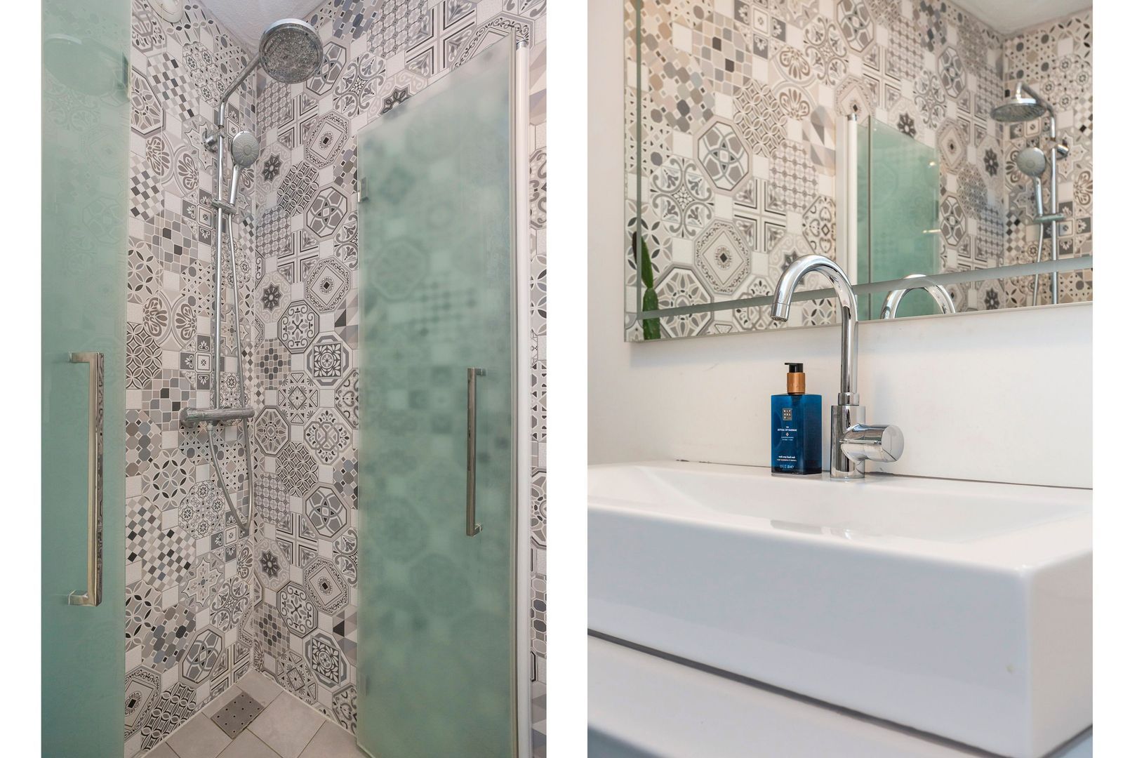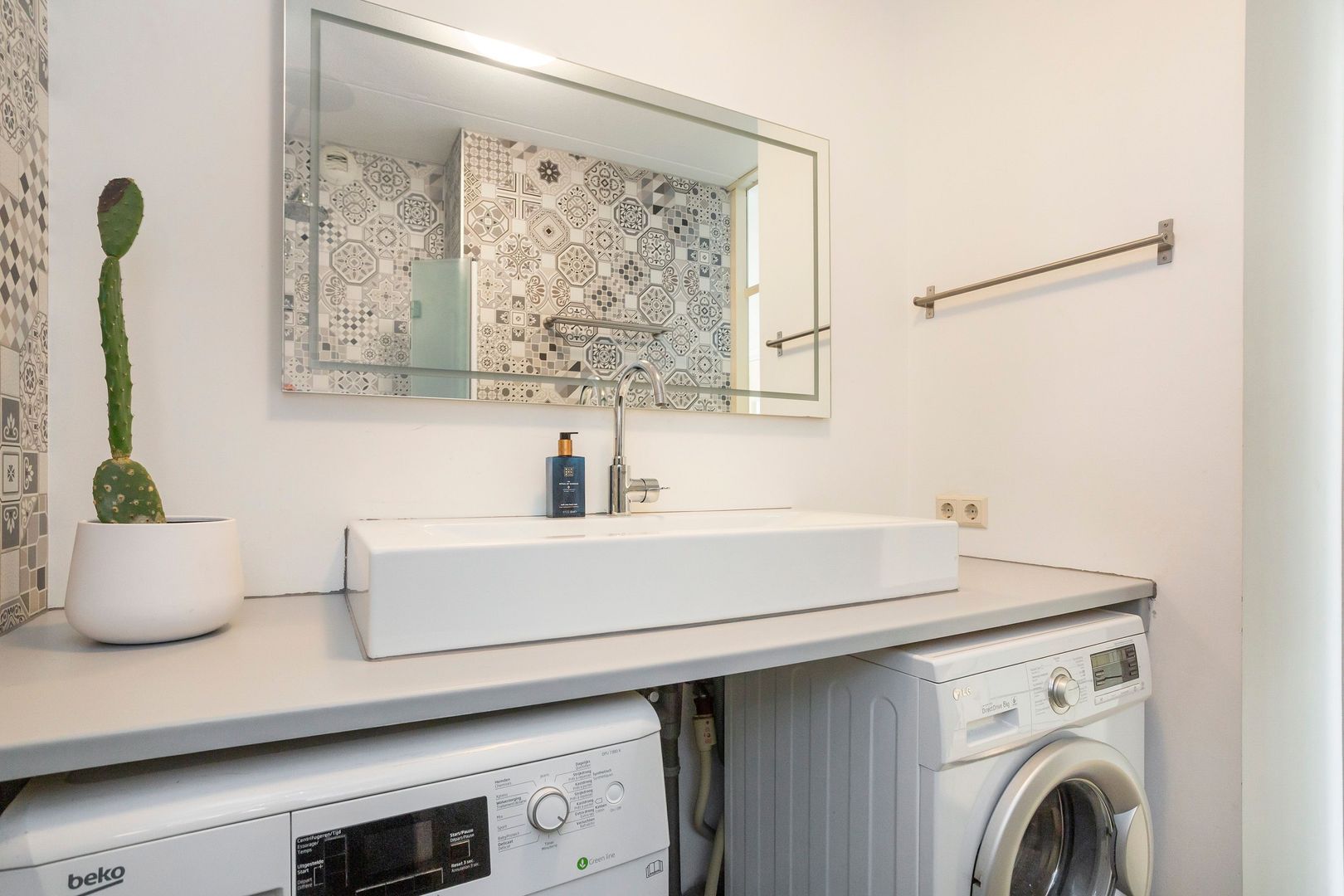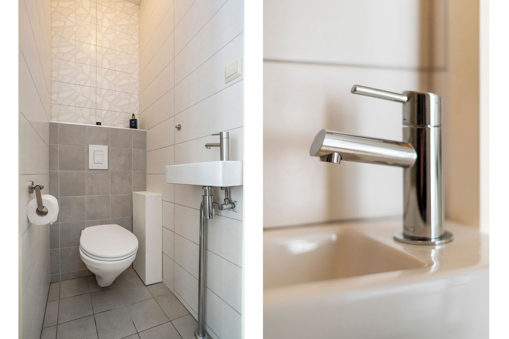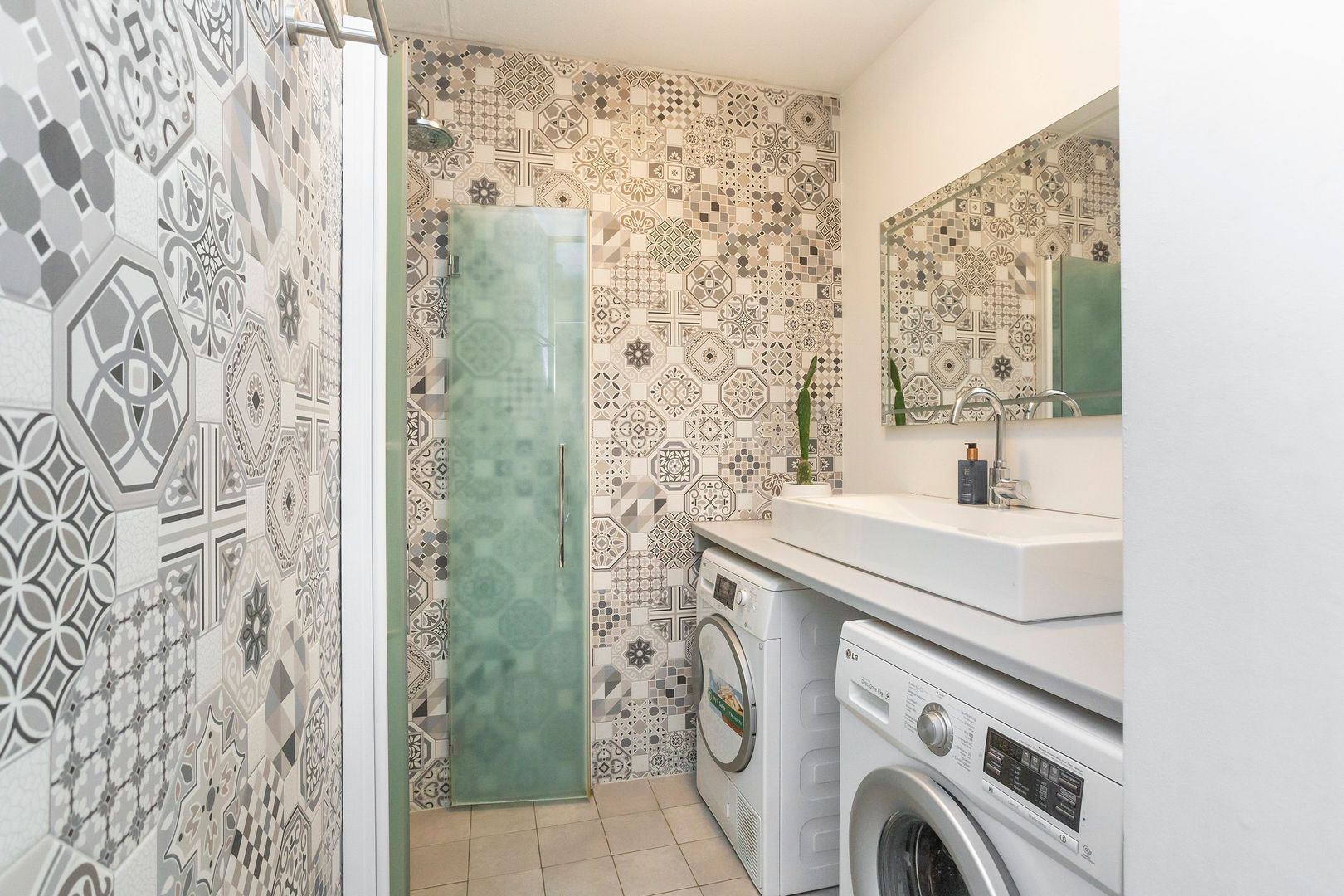 Entrée, gang met toiletruimte (2015), badkamer (2015) met douche, wastafel en aansluitingen voor was/droogappararatuur.