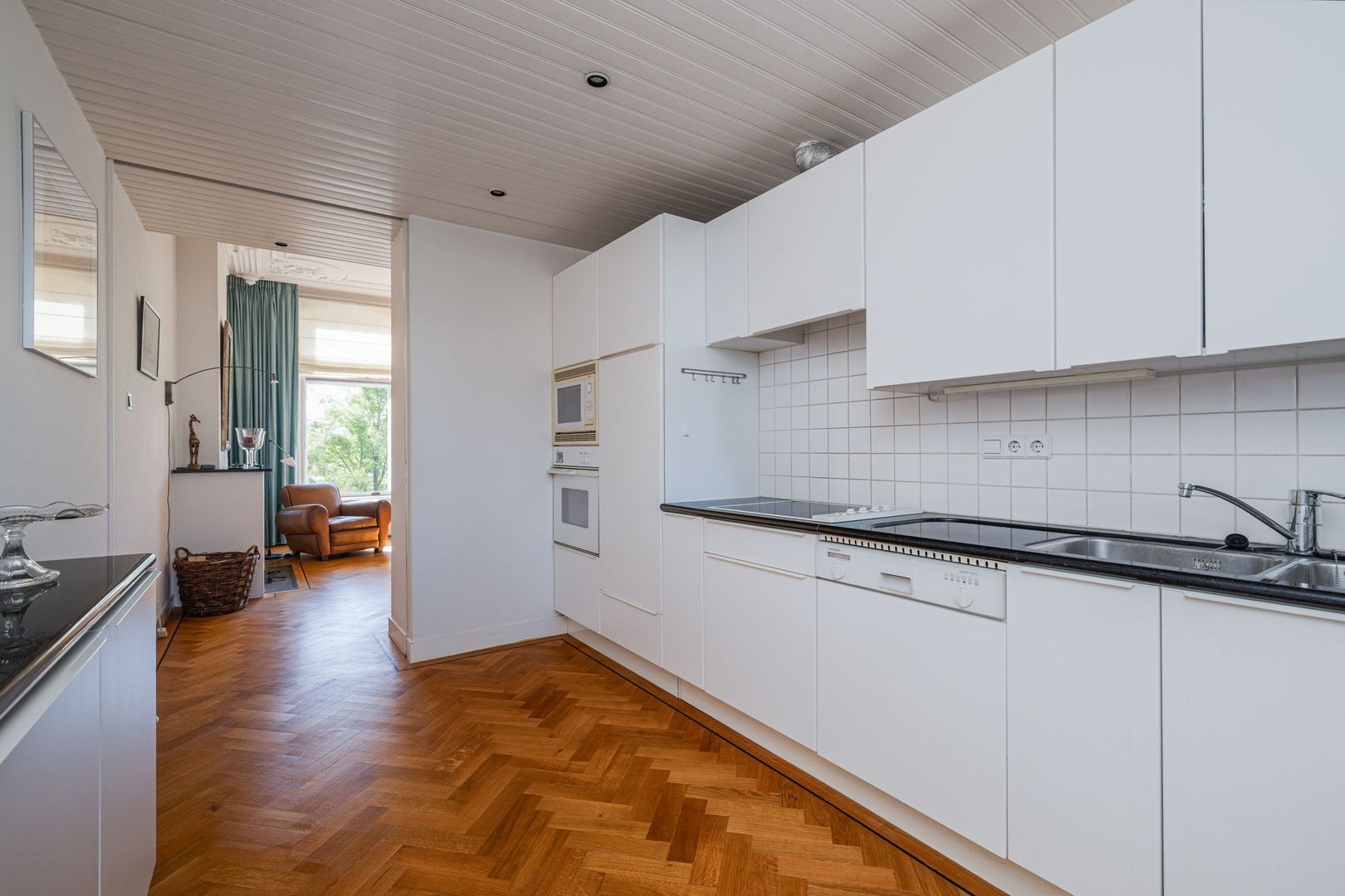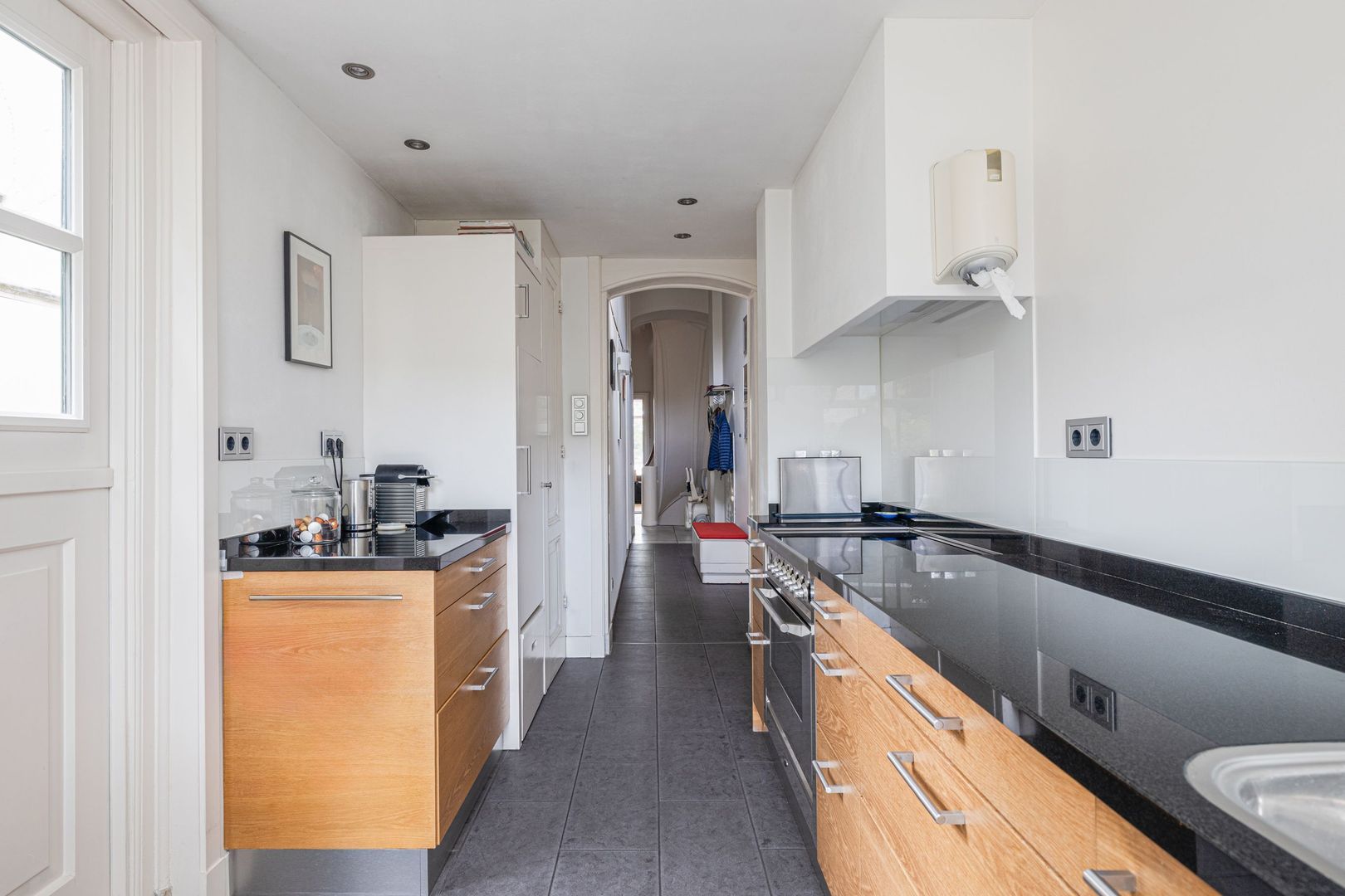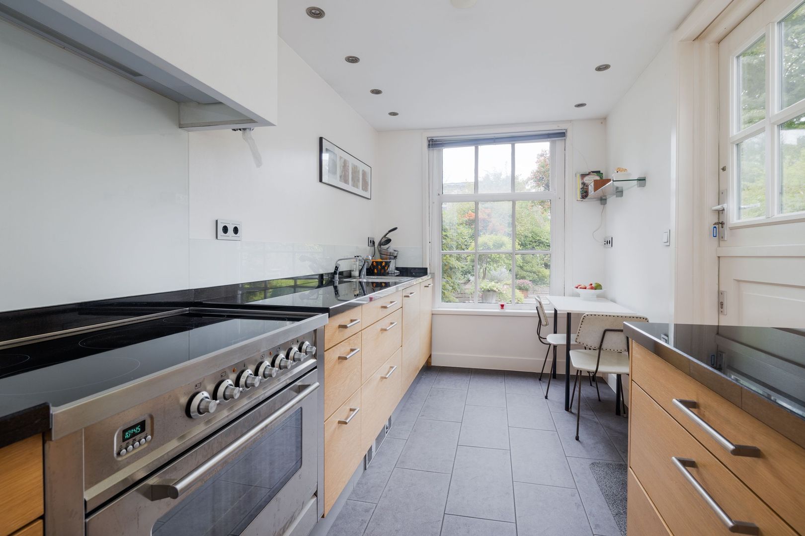 Kitchen with modern (2009/2010) kitchen layout with the following appliances: Boretti stove (induction), dishwasher, fridge/freezer, Quooker, extractor hood, 2 built-in cupboards. Door to roof garden.