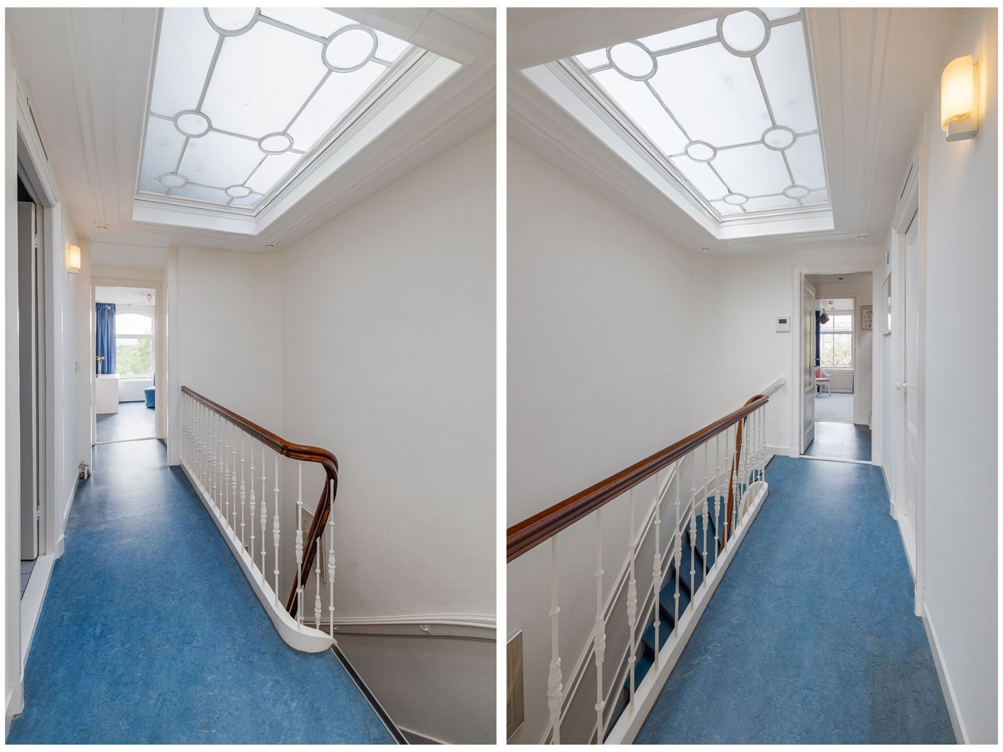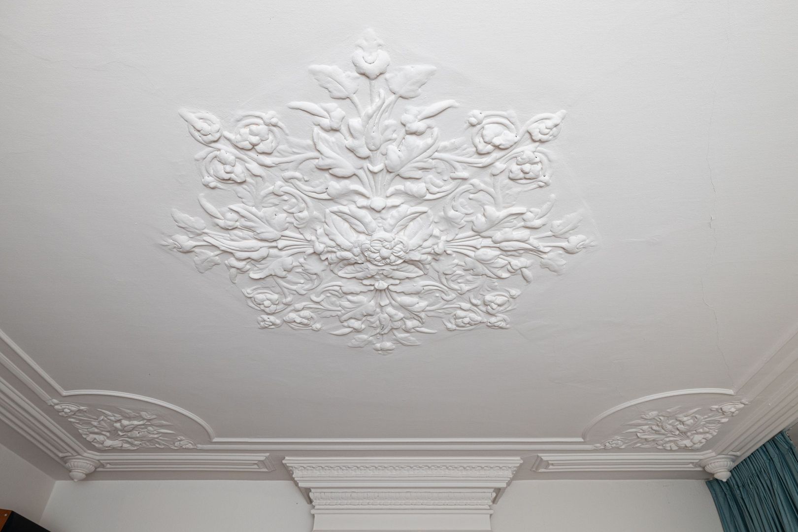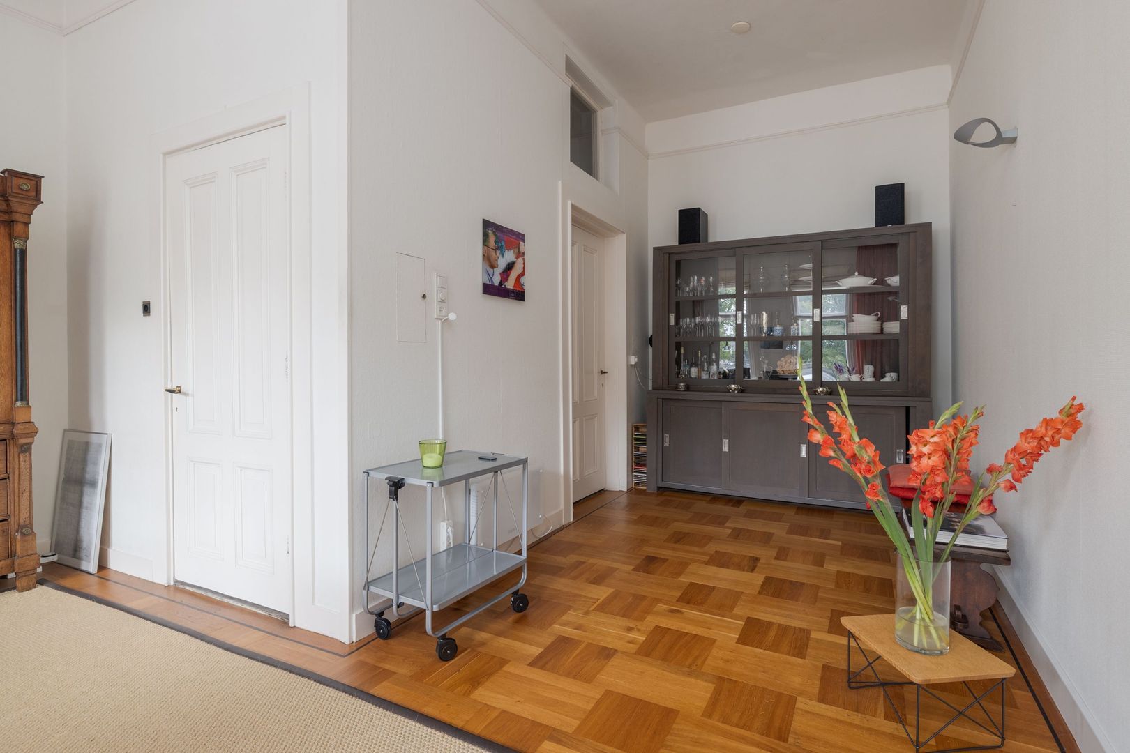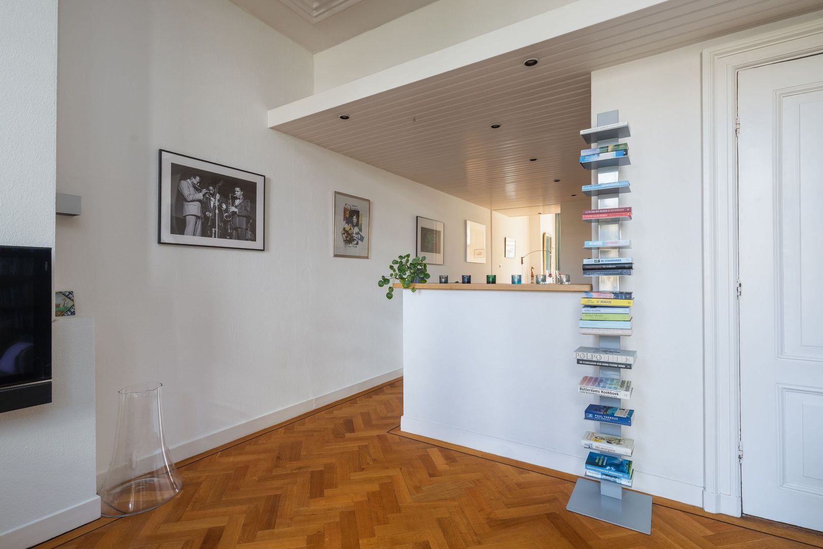 Ceiling height approx. 3.20 m. Daylight corridor, toilet with water closet. Front sitting room (3) approx. 25 m² with fireplace (Ringlever) and a magnificent view of the Maas and SS Rotterdam. Intermediate second kitchen area with kitchen units. Rear library/television room (4) approx. 25m² with lovely spacious view of the green courtyard. The rooms have oak herringbone parquet flooring (1988) and richly ornamented ceilings.