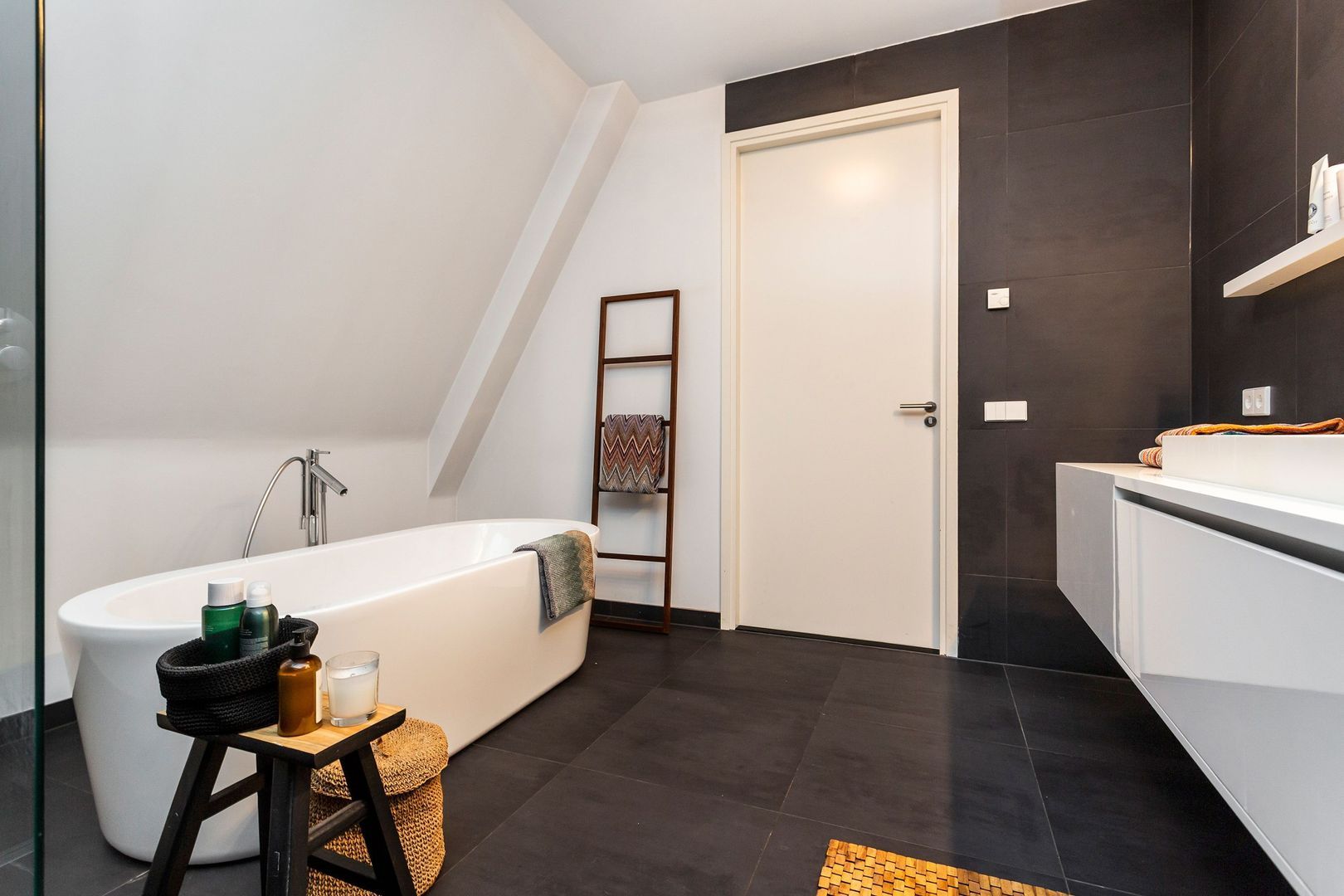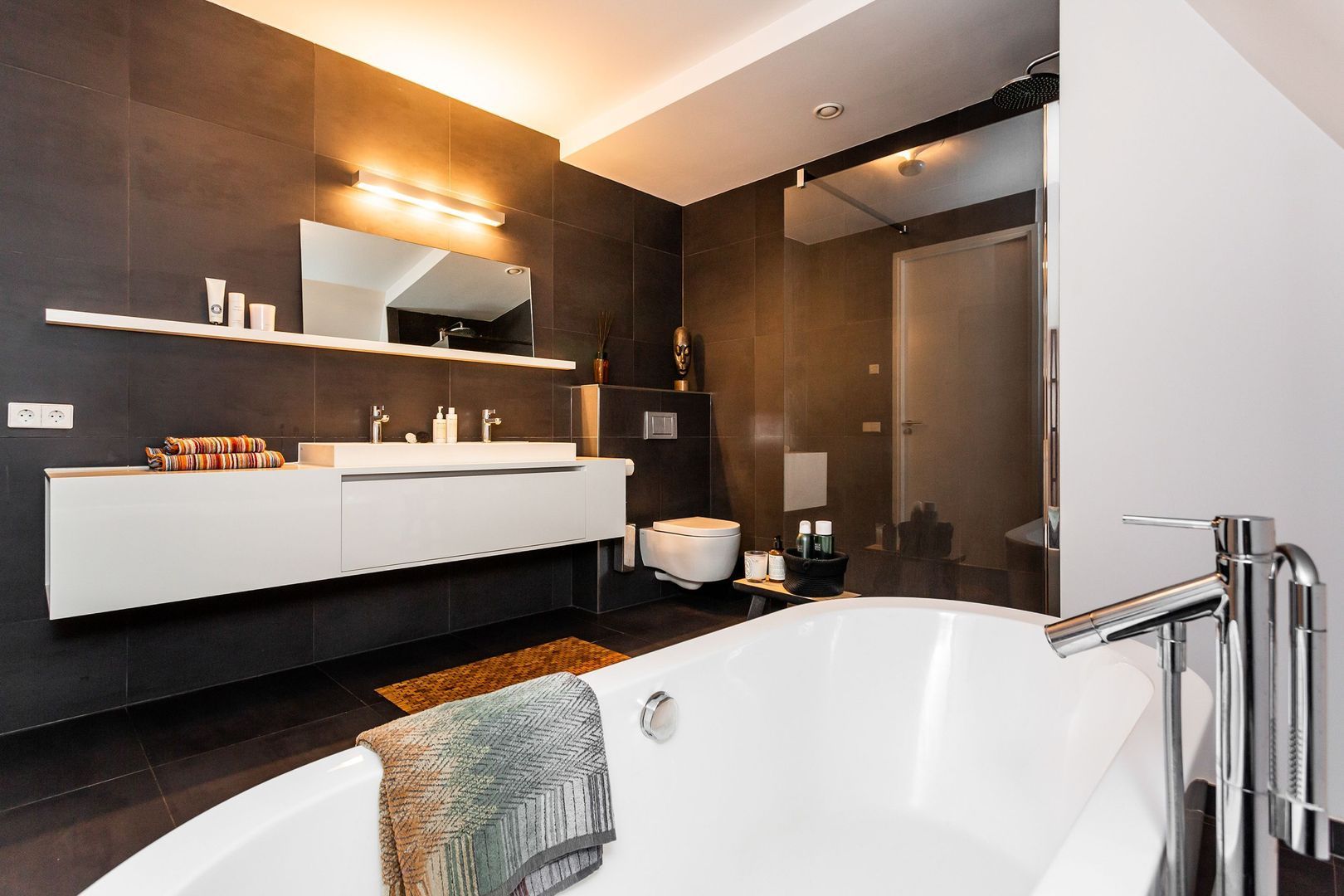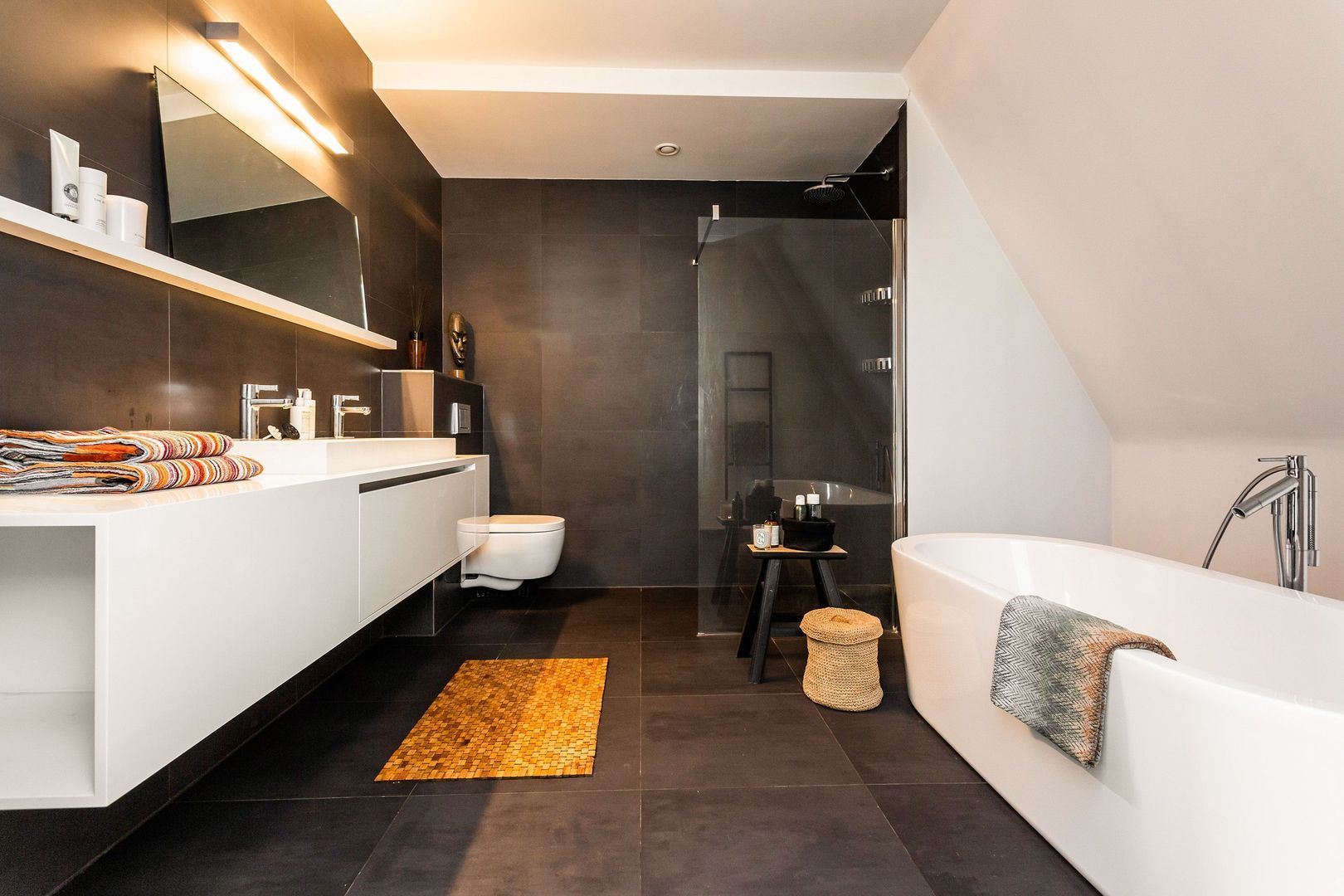 Luxe badkamer met vrijstaand bad, grote doucheruimte, 2e hangend watercloset en een brede meerpersoons wastafel.