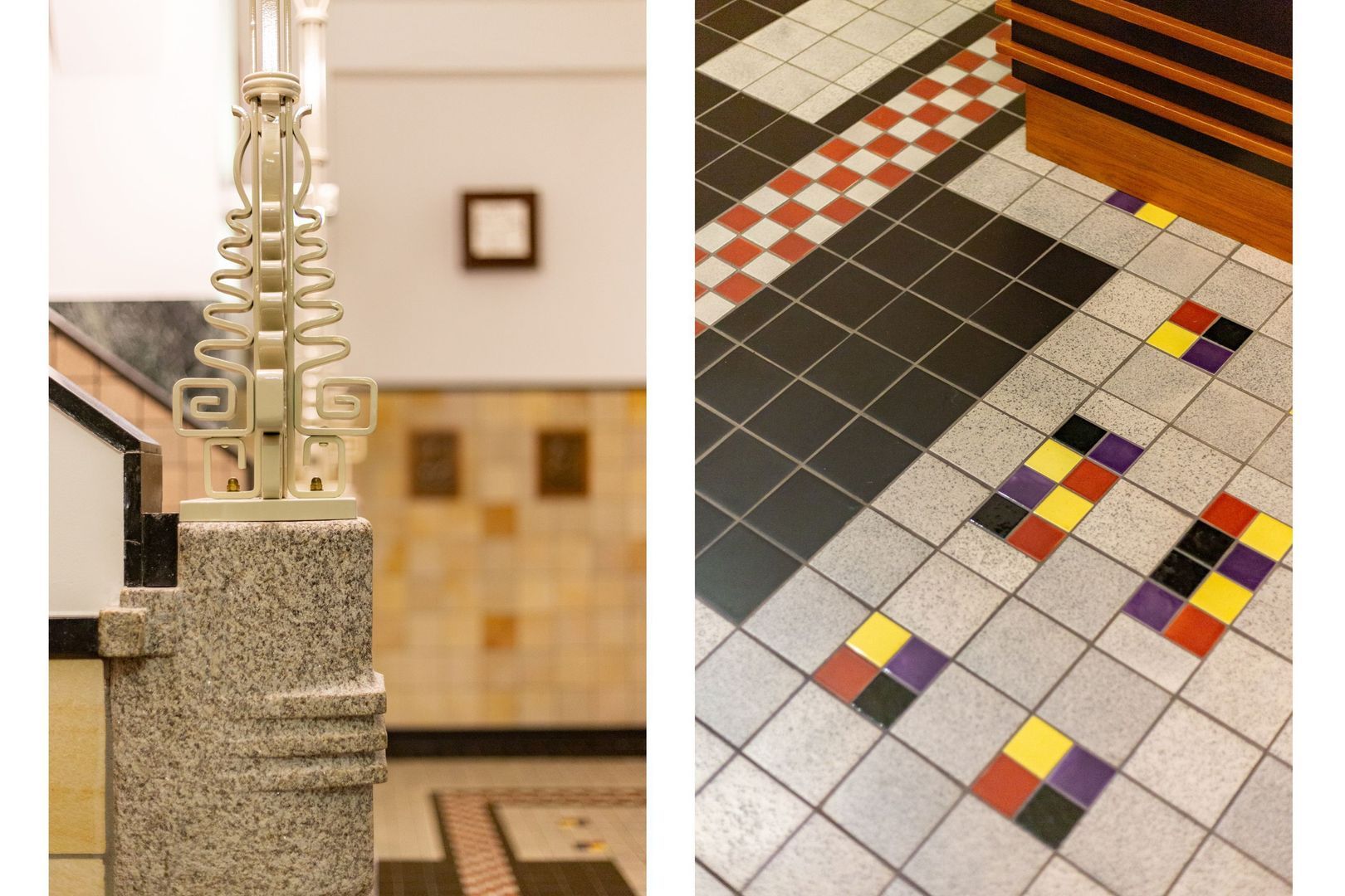 Majestueuze centrale hall met hernieuwde deurpartijen, mozaïekvloer, glas-in-loodraampartijen, monumentaal trappenhuis en toegang tot de liften, parkeergarage, berging en fietsenstalling.