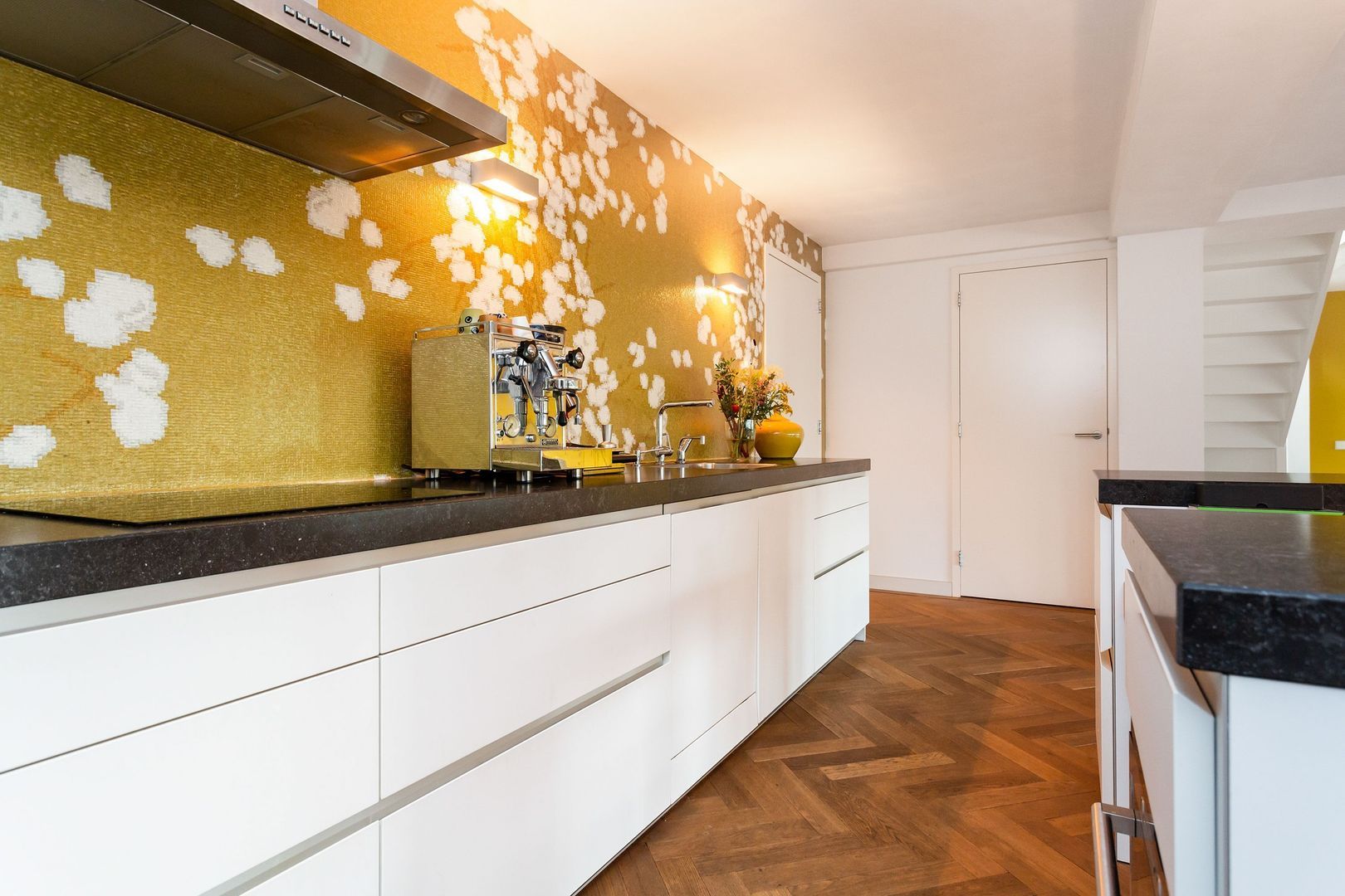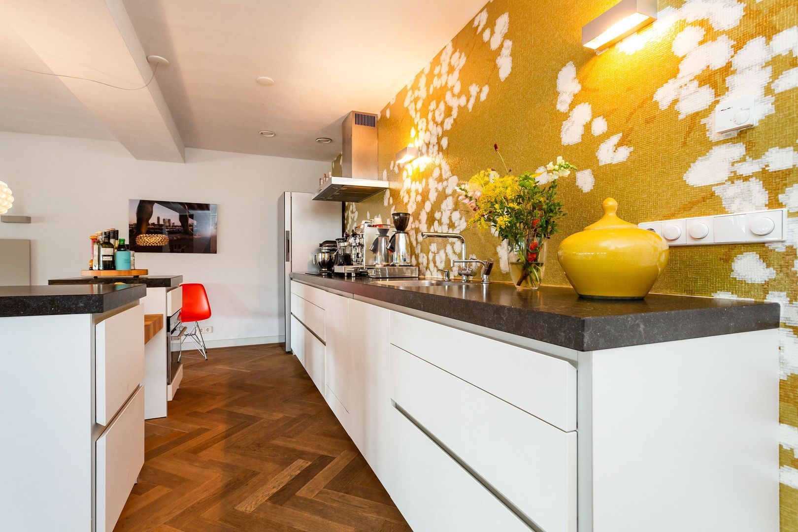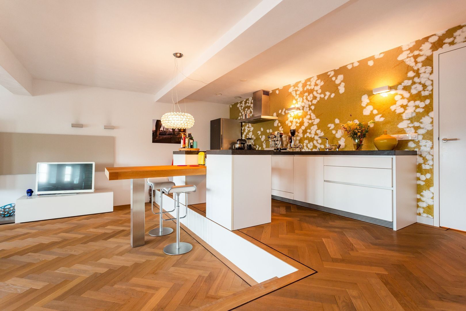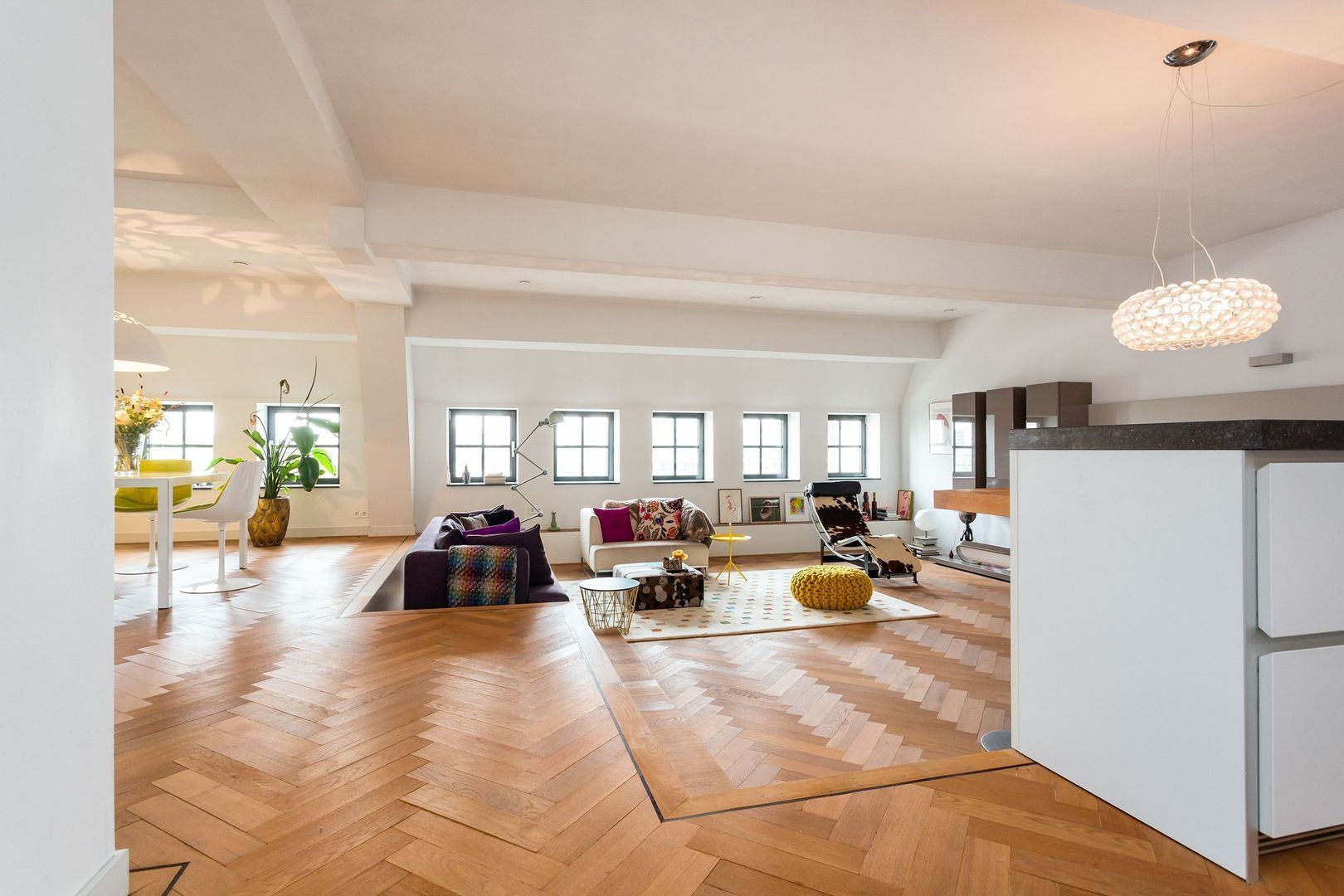 Brede, openplan living (1) ca. 70 m², met volwaardige Bulthaup keuken met alle mogelijke apparatuur. Deze ruimte is verdeeld over 2 niveau’s met zicht over een deel van het Scheepvaartkwartier richting het stadscentrum.