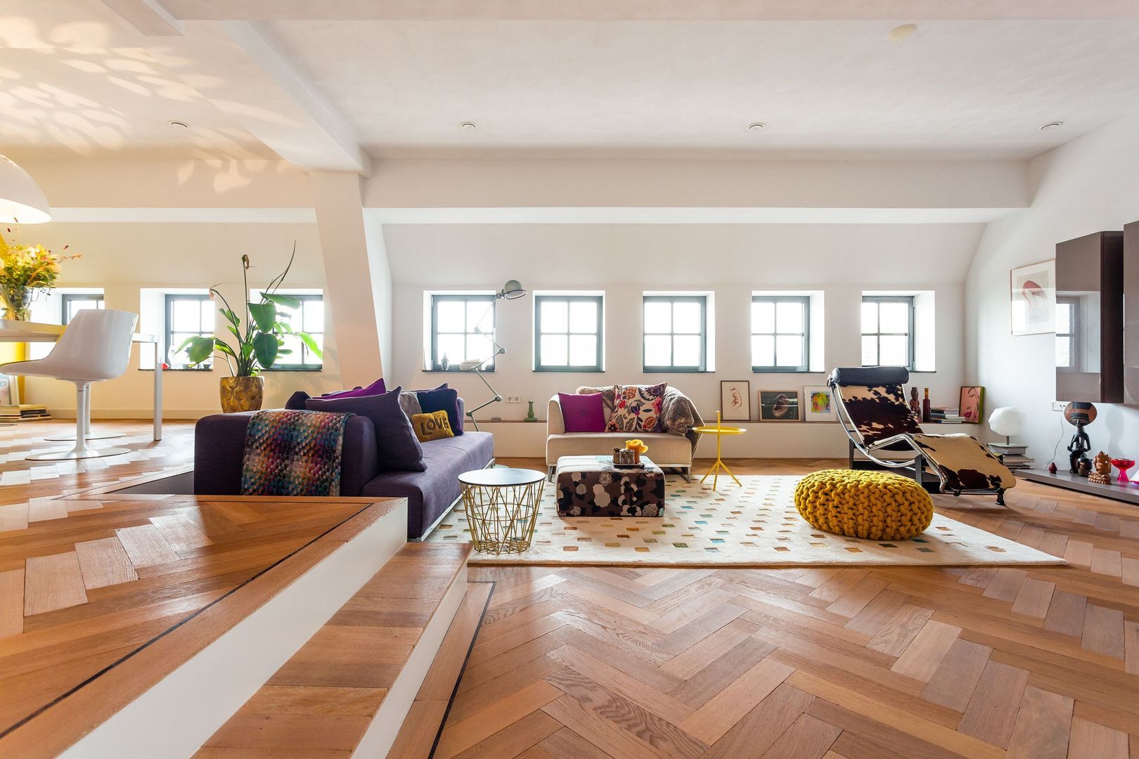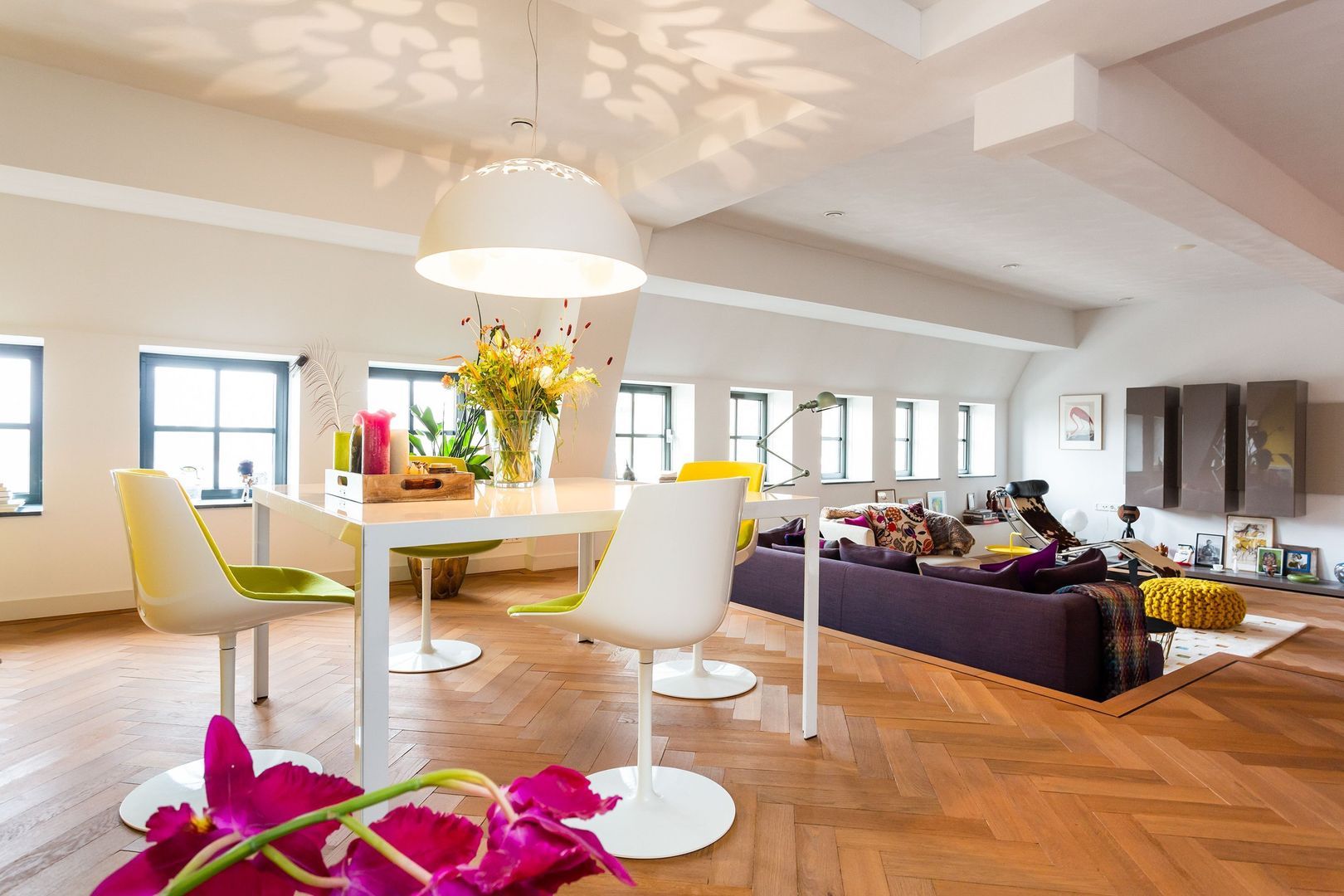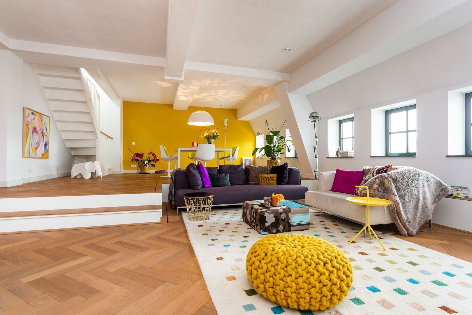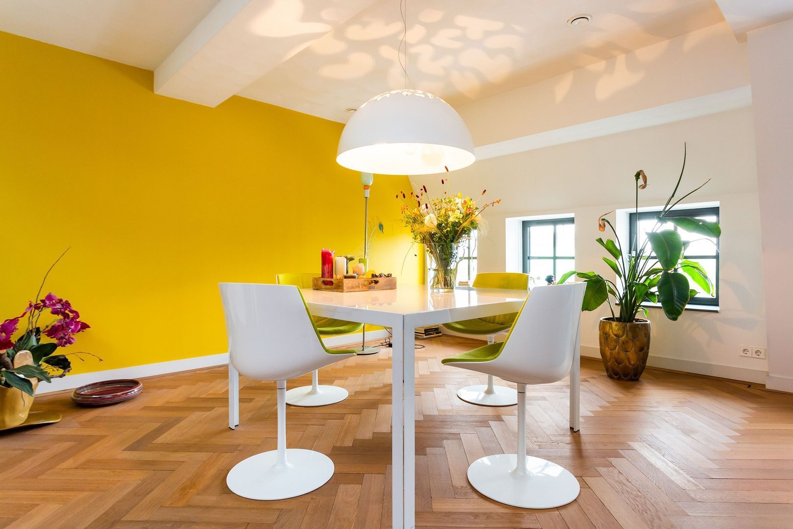 Brede, openplan living (1) ca. 70 m², met volwaardige Bulthaup keuken met alle mogelijke apparatuur. Deze ruimte is verdeeld over 2 niveau’s met zicht over een deel van het Scheepvaartkwartier richting het stadscentrum.