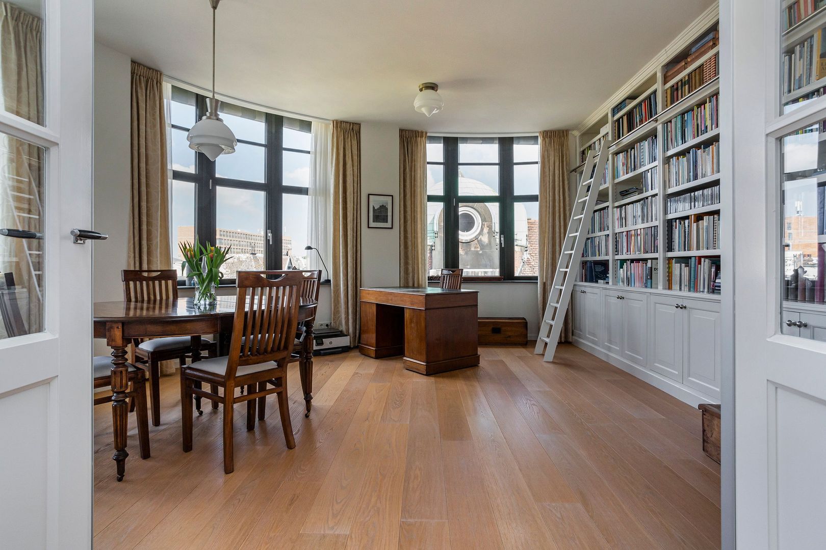 Vanuit de ruime hal is er via dubbele deuren toegang tot het woongedeelte van ca 55 m2 met een zit- en eetgedeelte en een grote bibliotheek. Vanuit het raam is zicht op de Veerhaven en de Maas: voor de vroege vogel is het mogelijk om een aantal malen per maand cruiseschepen voorbij te zien varen. In het woongedeelte is een elektrische haard geinstalleerd met waterdamp (merk Dimplex). Dit geeft een gezellige sfeer op een natuurvriendelijke wijze. De bibliotheek, waar zich momenteel zowel een bureau als een vergader/eettafel bevinden, heeft boekenkasten langs de wanden met houten trap. Het uitzicht is fenomenaal en geeft onder meer zicht op de 100 jaar oude koperen koepel van het buurpand.