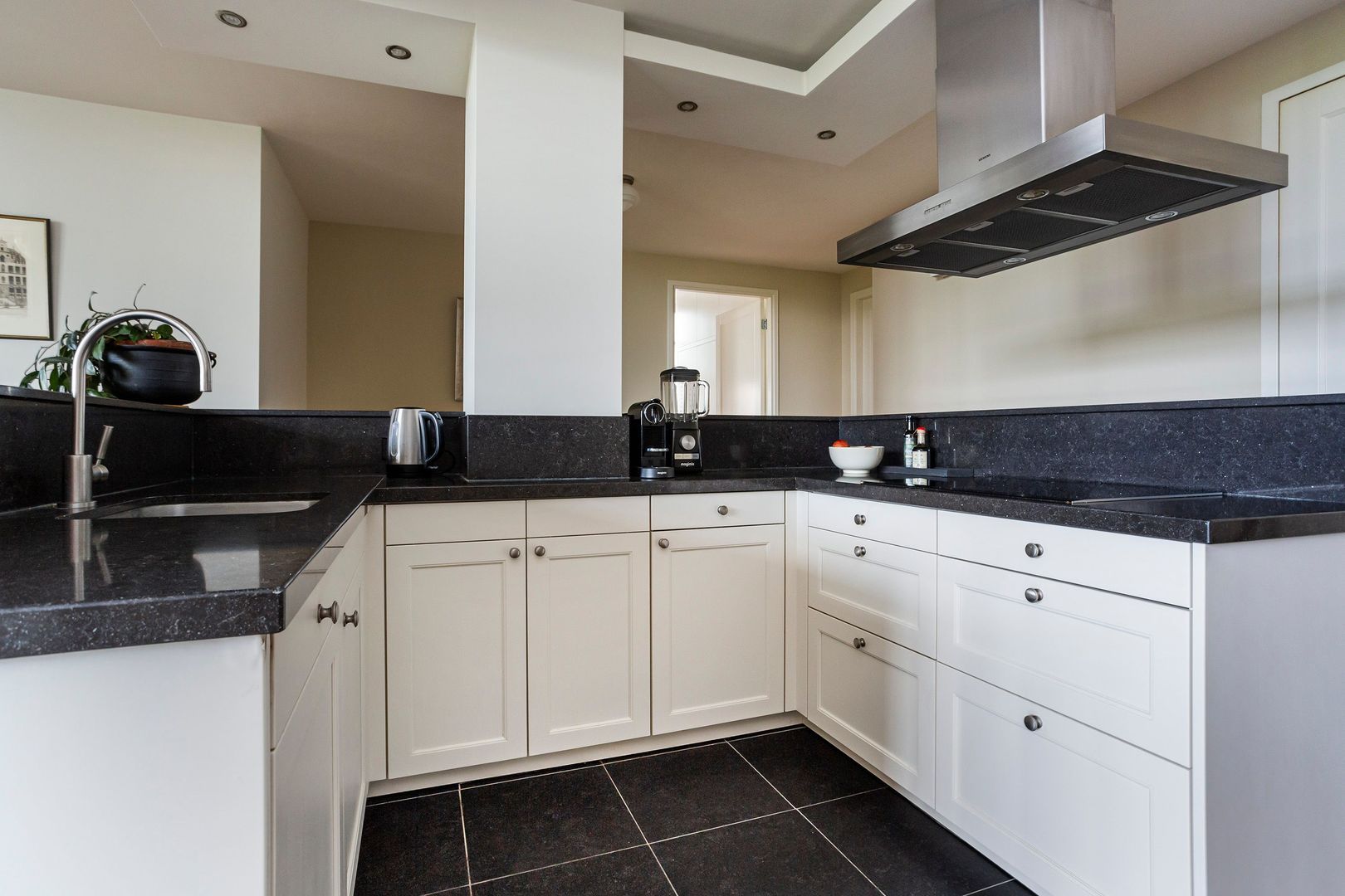 Keukenruimte ca. 30 m² , goed toegankelijk vanuit het eetgedeelte en voorzien van een luxe U-vormige keukenopstelling met alle wenselijke apparatuur (Siemens en Bosch) en een natuurstenen aanrechtblad.