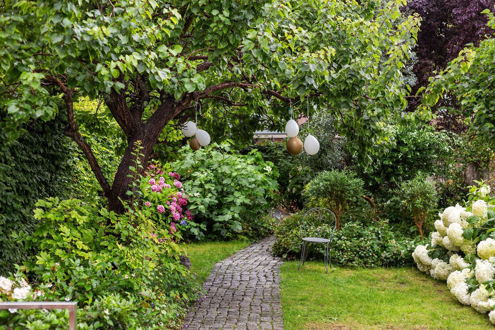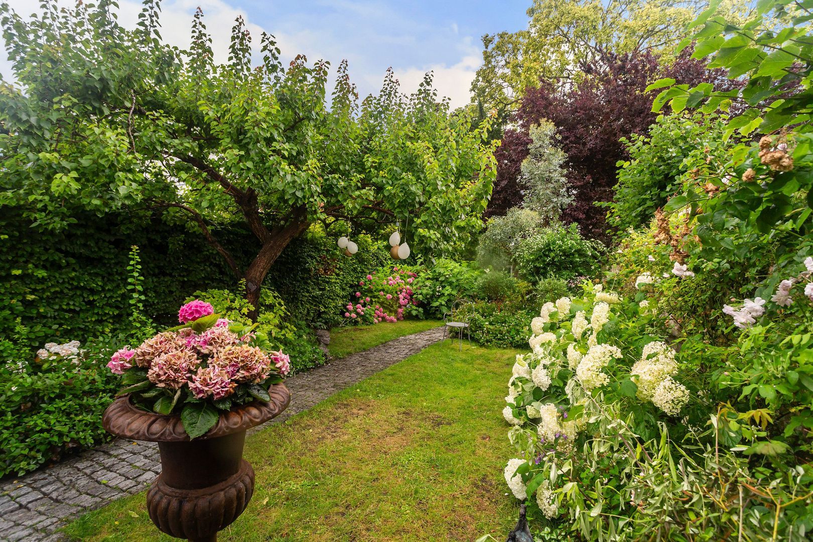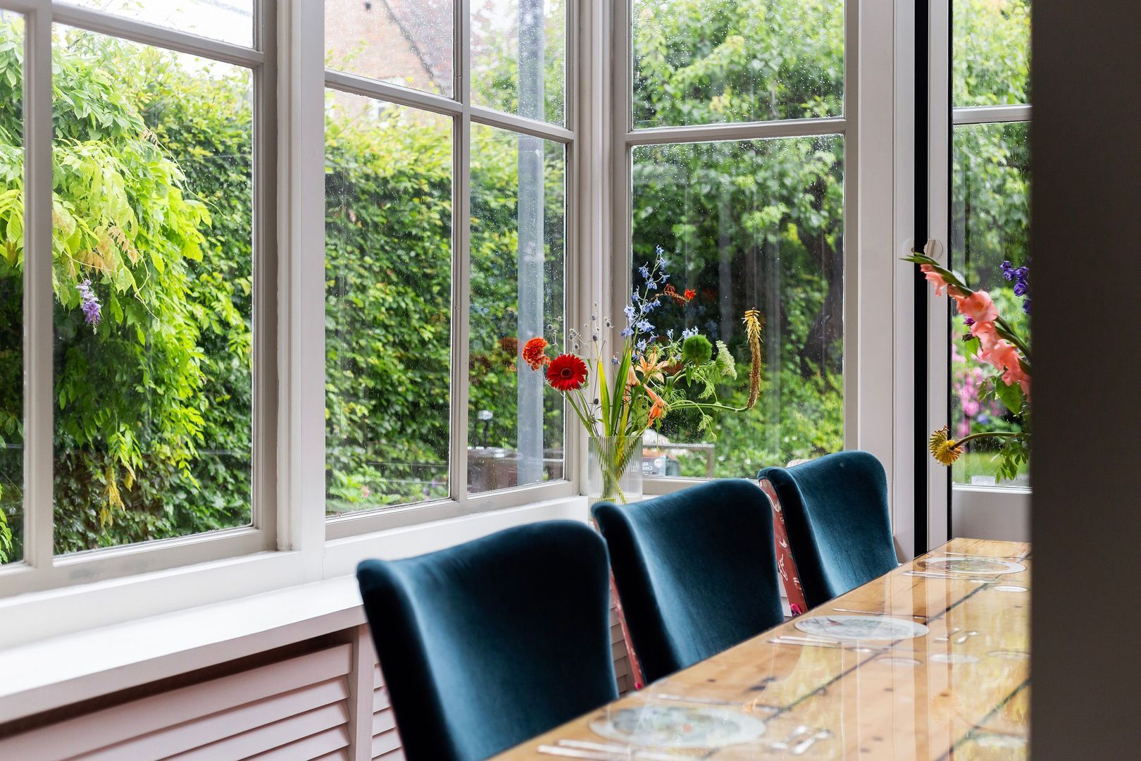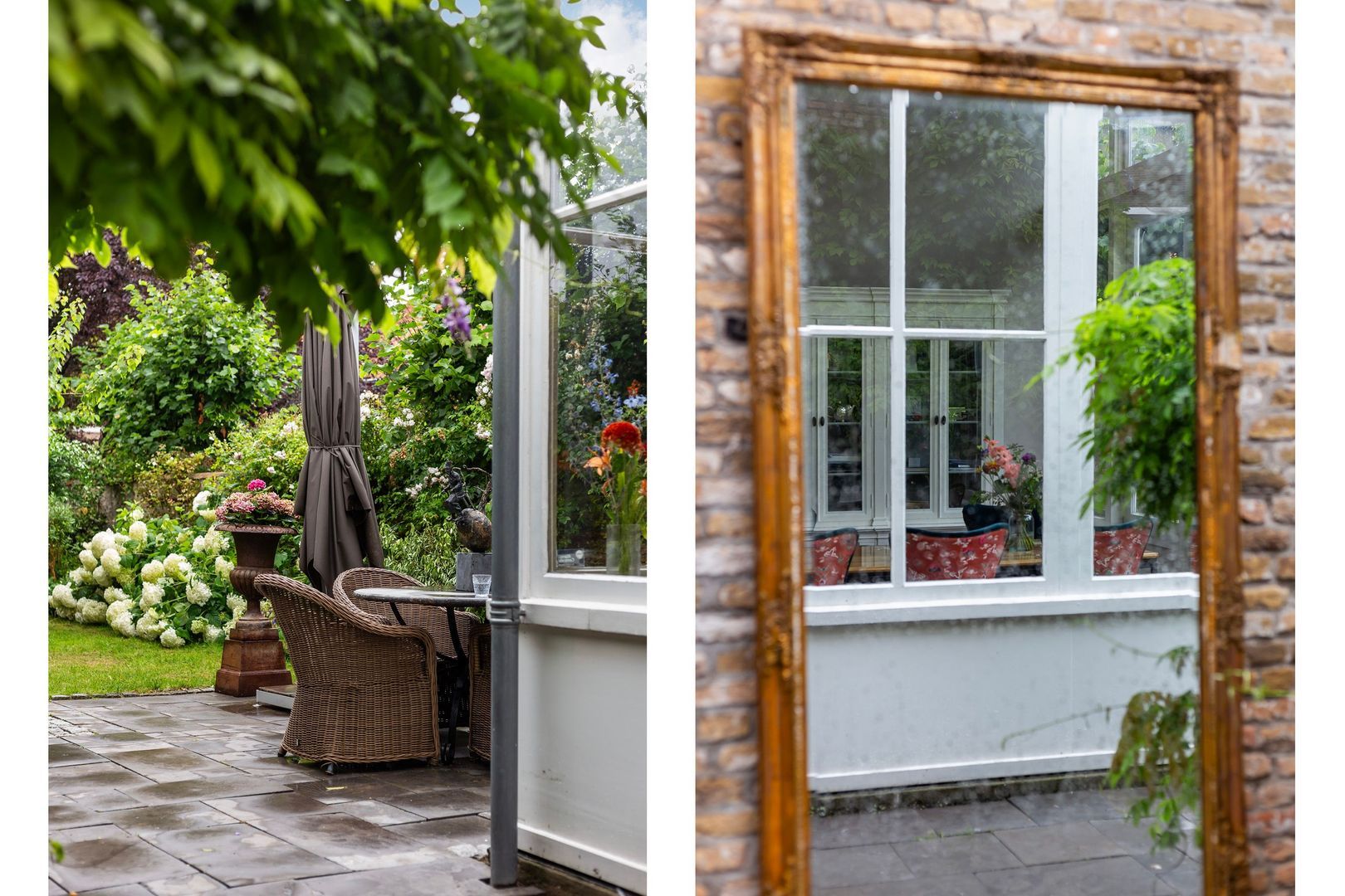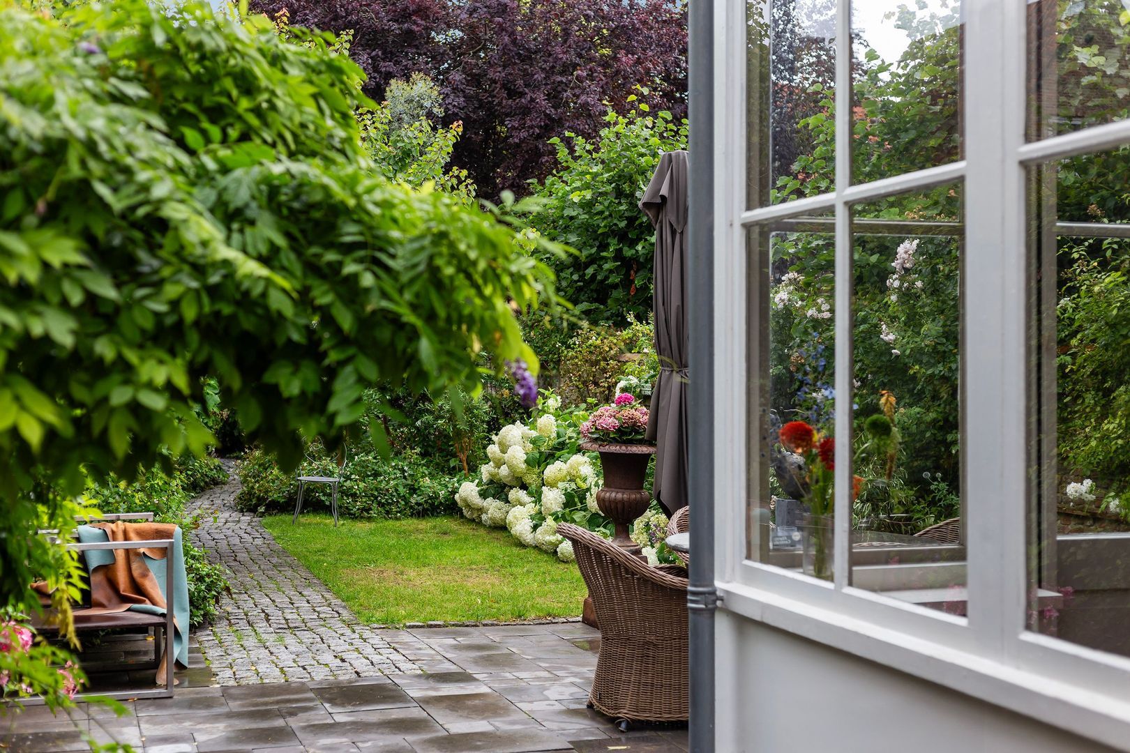 Door de keukendeur of de openslaande deuren van de eetkamer is de tuin