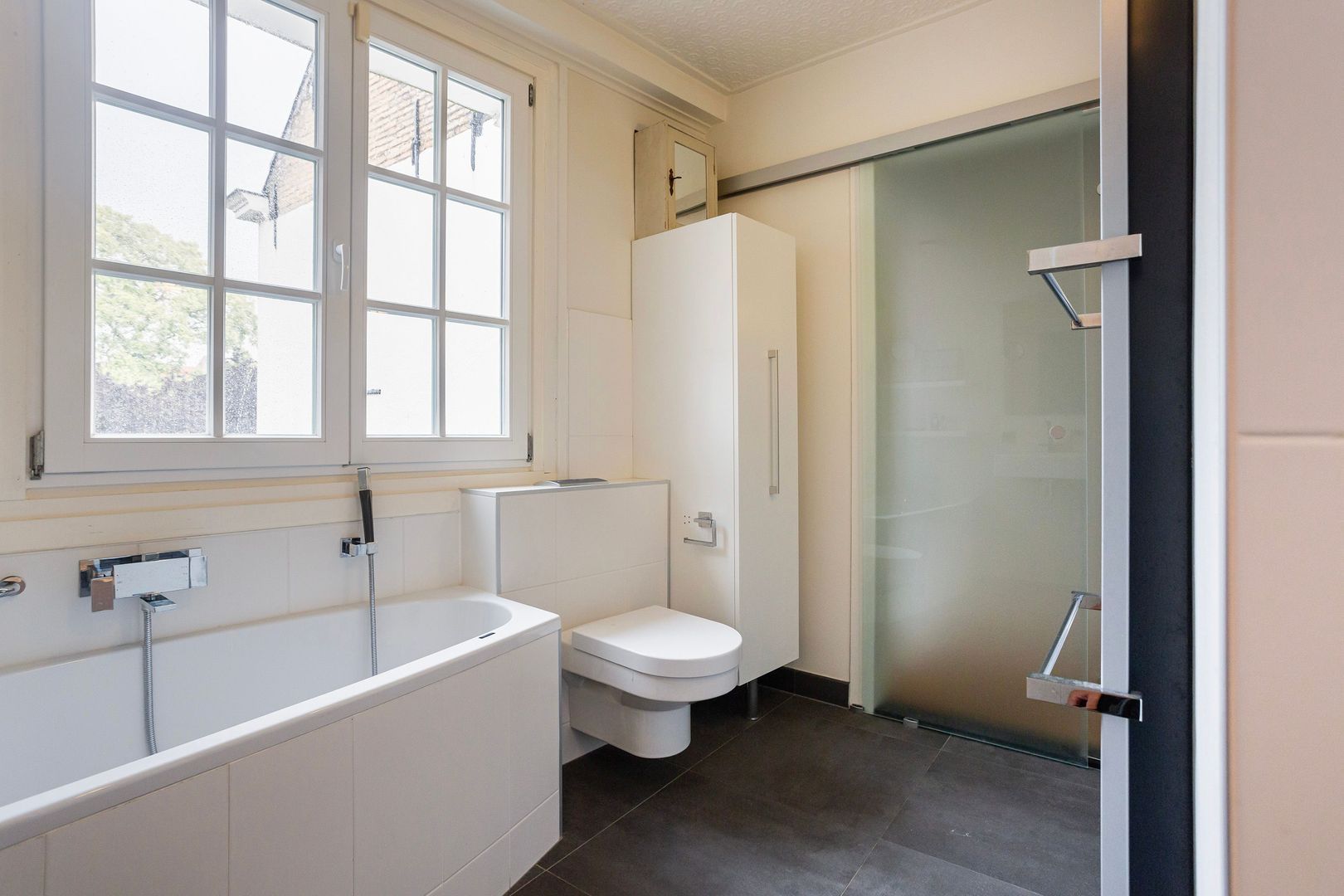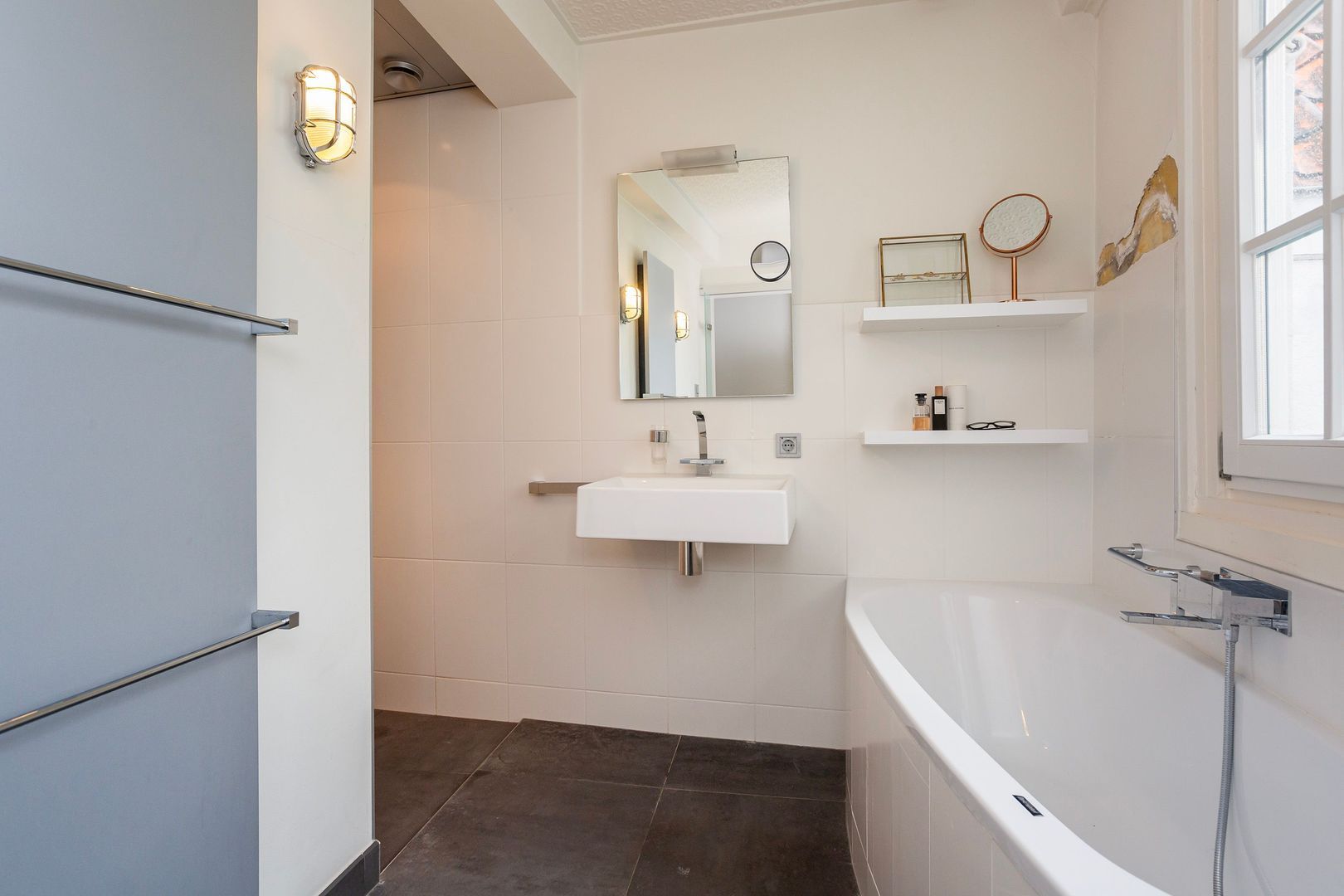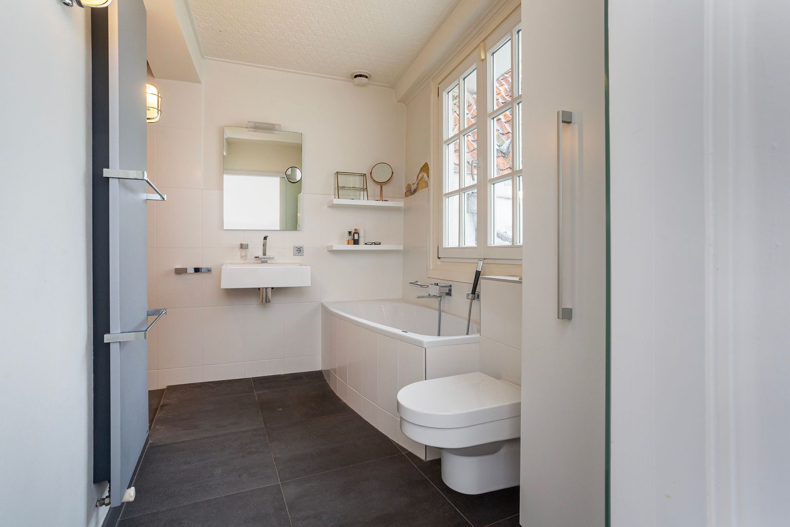 Badkamer met tuinzicht en ligbad, 2e wc, wastafel en separate douche.