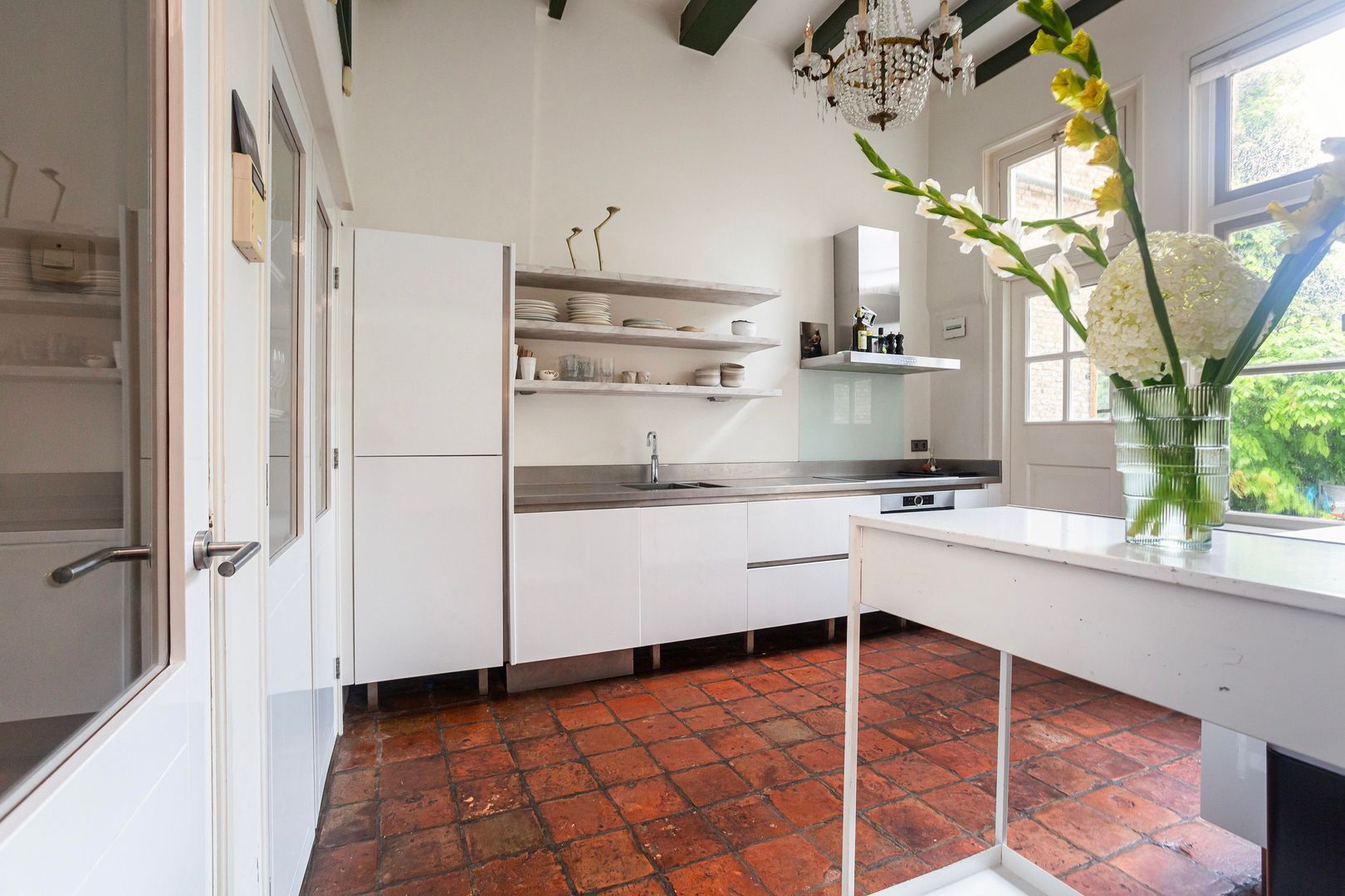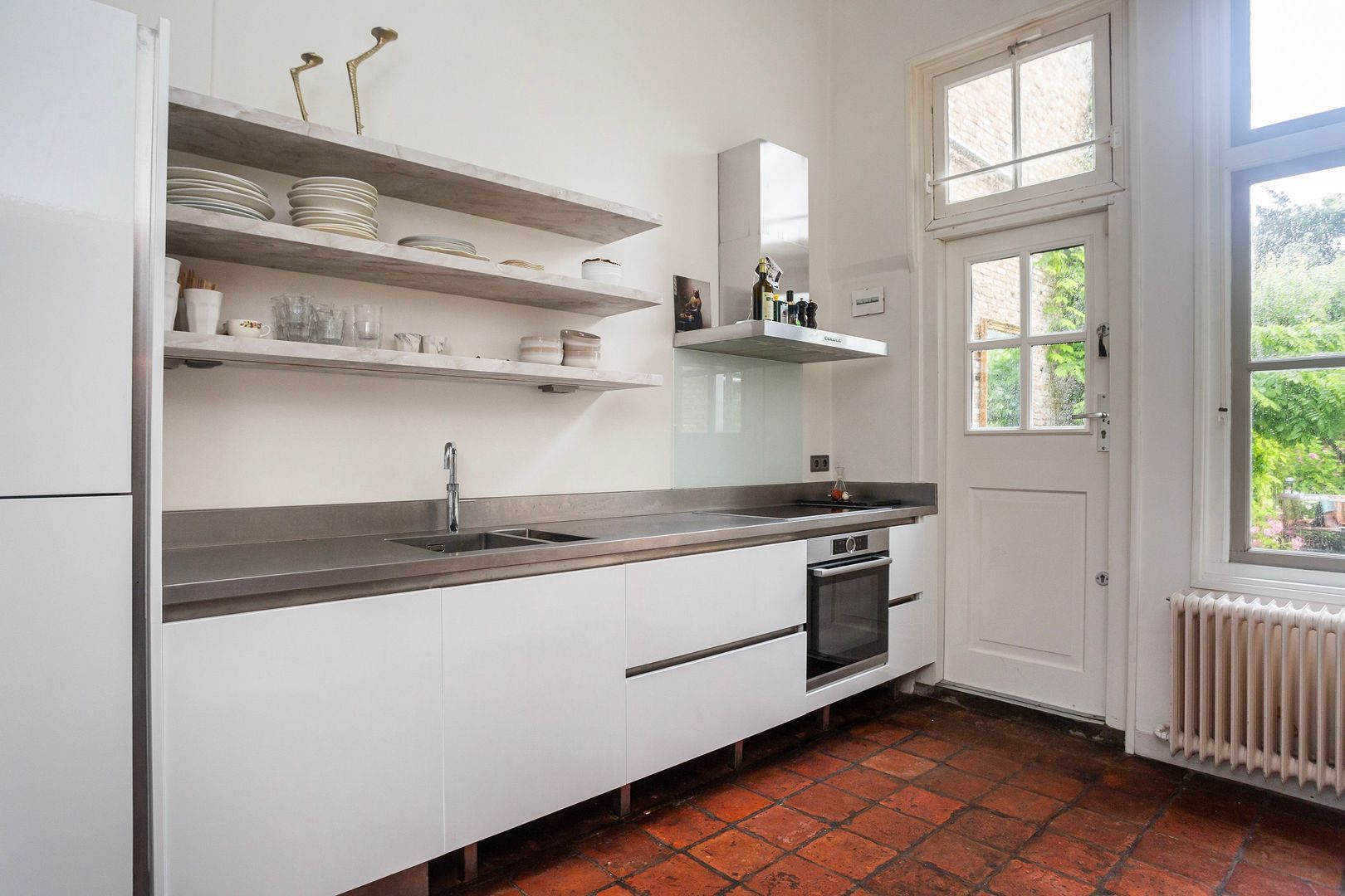 De keuken is voorzien van een witte keukenopstelling met RVS blad en beschikt over