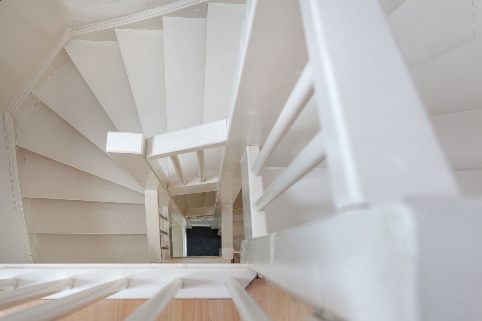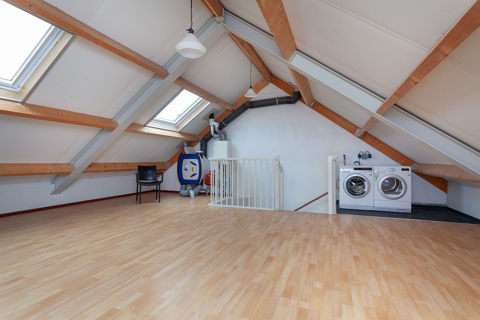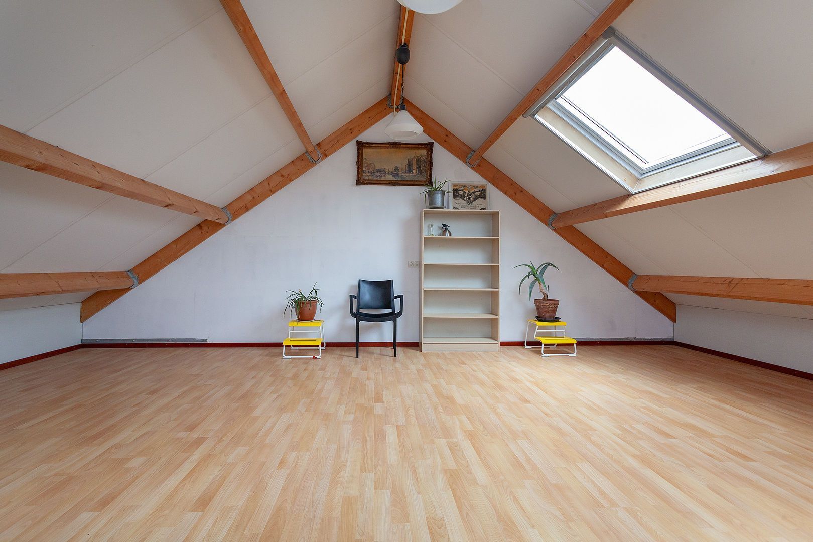 Bijzonder grote open ruimte (6) ca. 47,5m2 (deels lager dan 1,5m). De hoge punt en de schuine dakvlakken (met 2 dakramen) zorgen voor een echt zoldergevoel. Er is een aansluiting voor wasapparatuur en een CV-ketel.