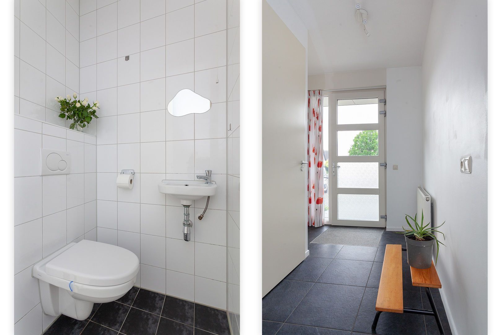 Entree, hal met meterkast, trapkast, toiletruimte met hangcloset en wasbakje.