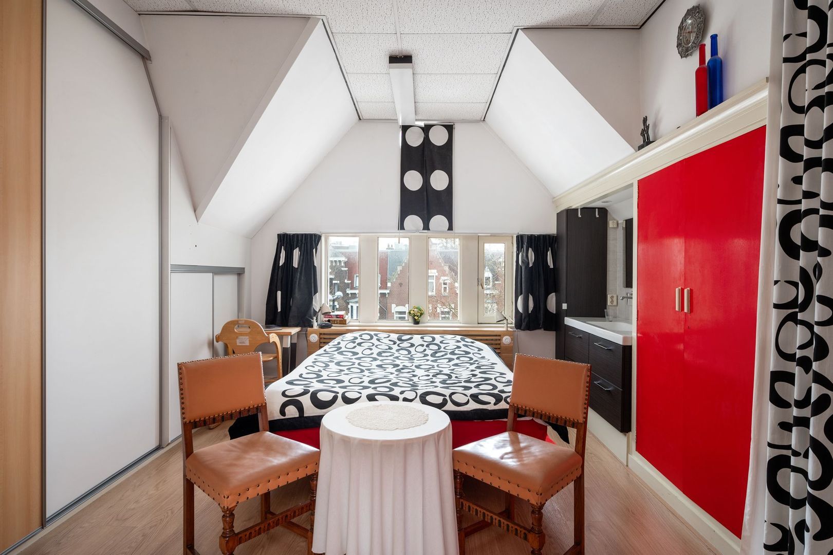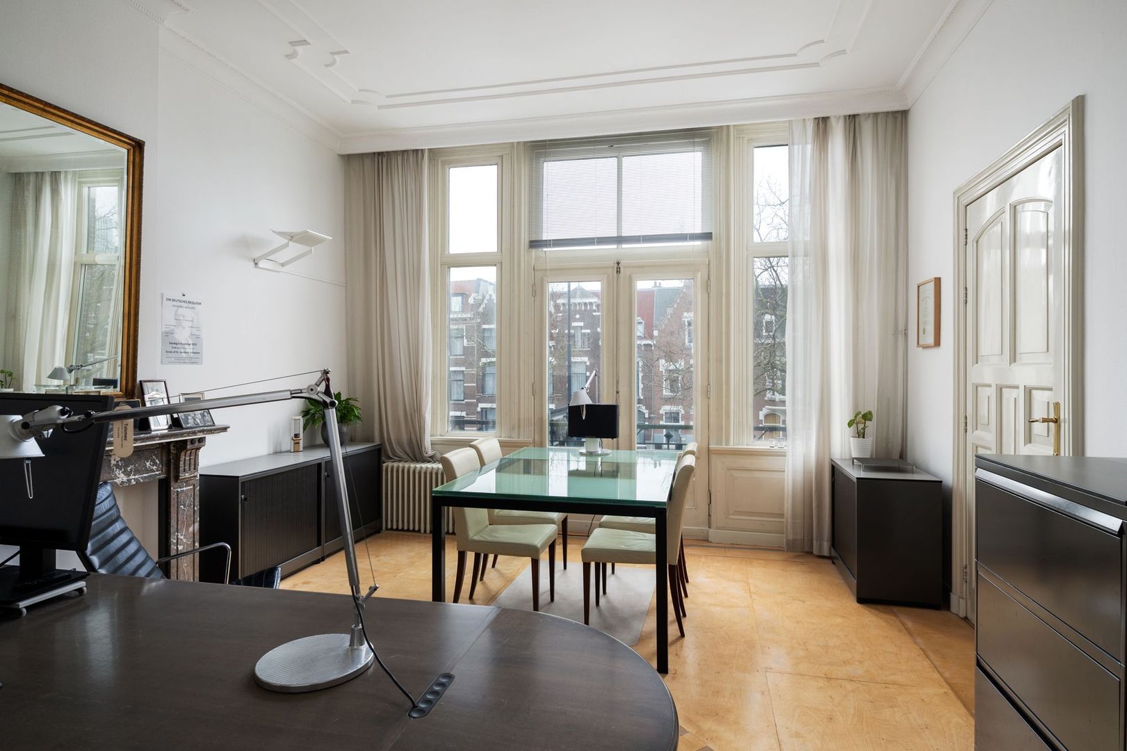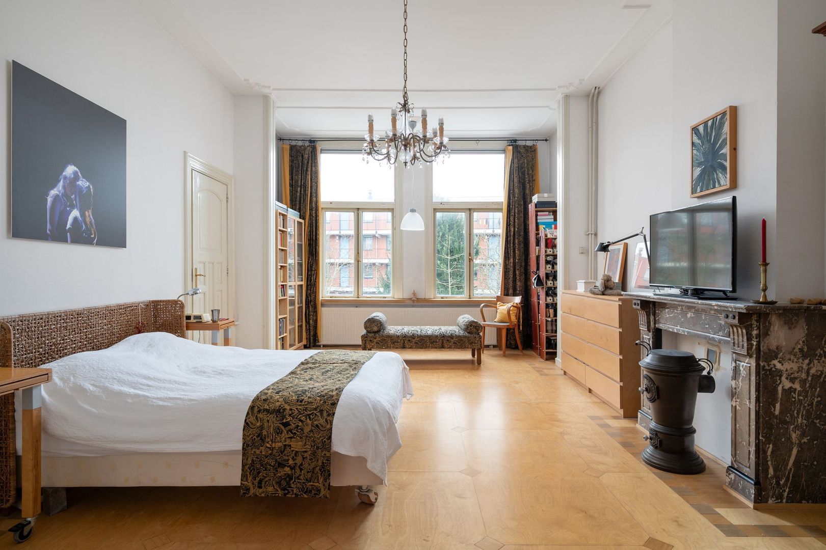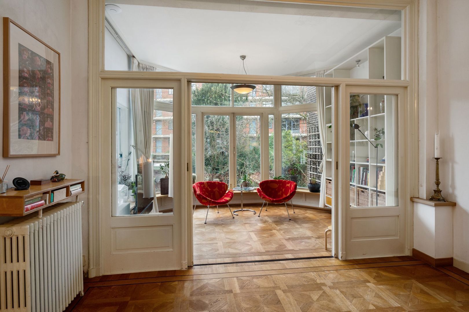 Woongedeelte met 2 grote kamers en suite  met fraaie hoge plafonds en de oorspronkelijke kasten en een zonnige serre. Deze kamers ‘liggen’ aanzienlijk hoger dan het straatniveau, waardoor er geen zicht naar binnen is en juist wèl een mooi beeld naar oude, oorspronkelijke huizen aan de overzijde. De voorzijde van het huis is bovendien voorzien van driedubbel glas zodat je niet merkt midden in het centrum van de stad te zijn.