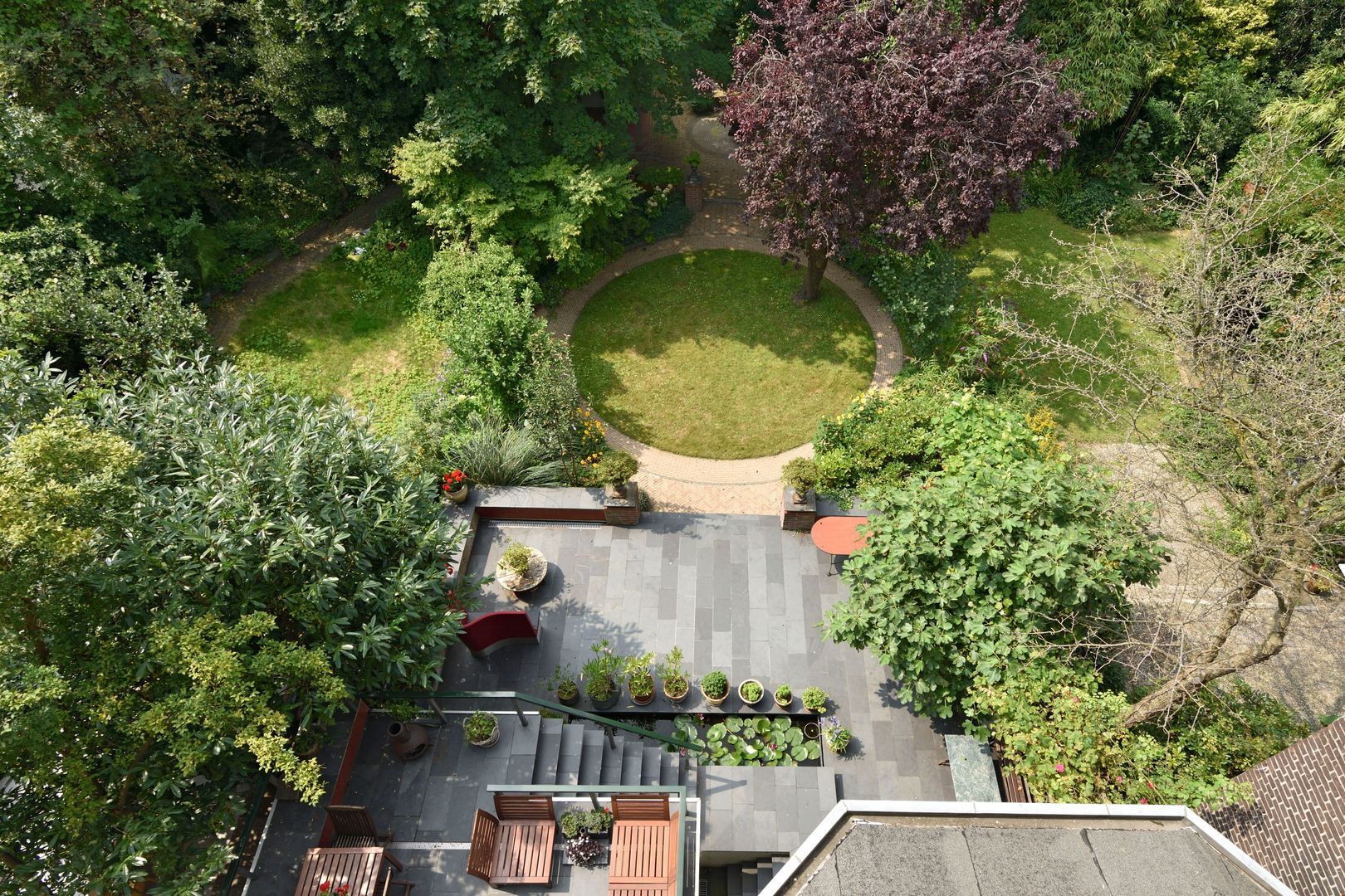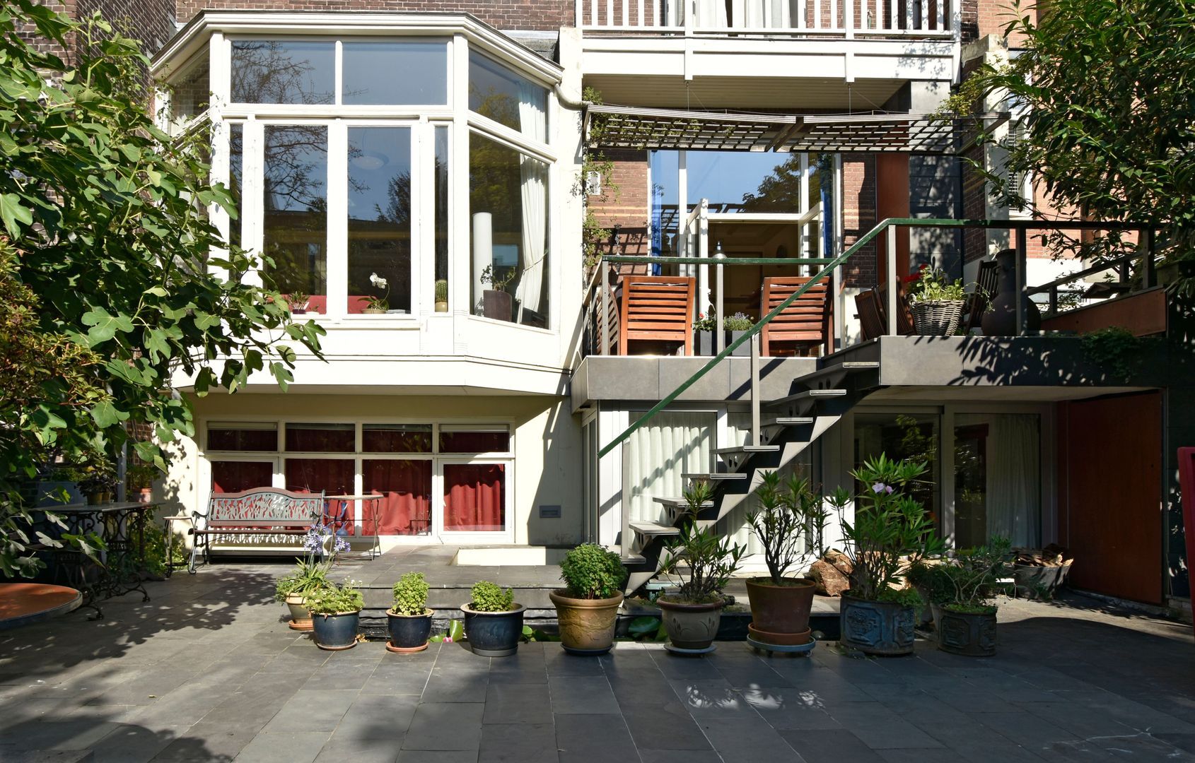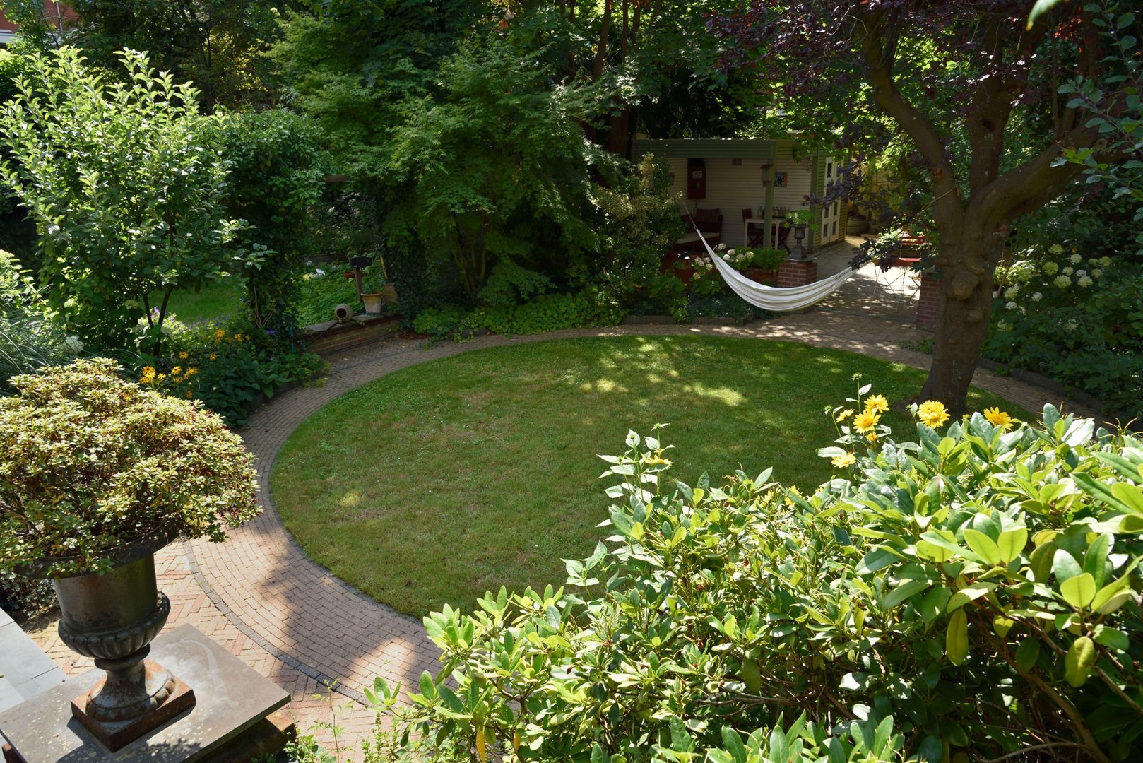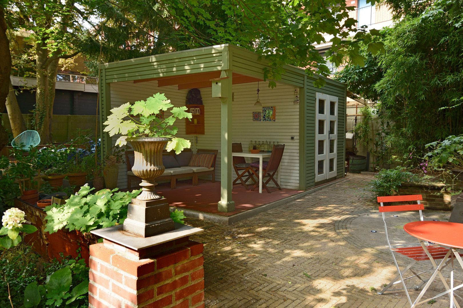 De 30 meter diepe en 9 meter brede gevarieerde tuin voelt als een stadsoase! Er zijn verschillende terrassen in/uit de zon, stilte in de stad, veel verschillende vogels, groen met voldoende gras, druivenranken, fruitbomen en een zeer vruchtbare vijgenboom. Een prachtig tuinhuisje met overdekt zitje en bergruimte en plantenwerkplek maakt het geheel compleet.