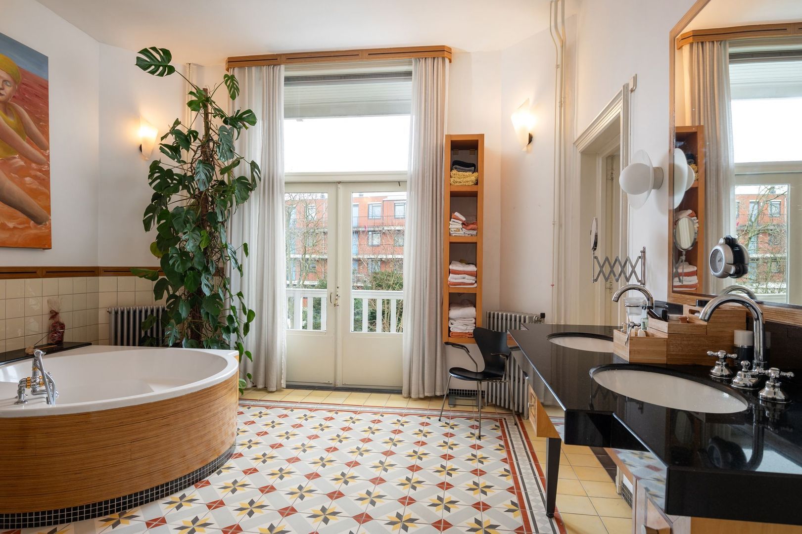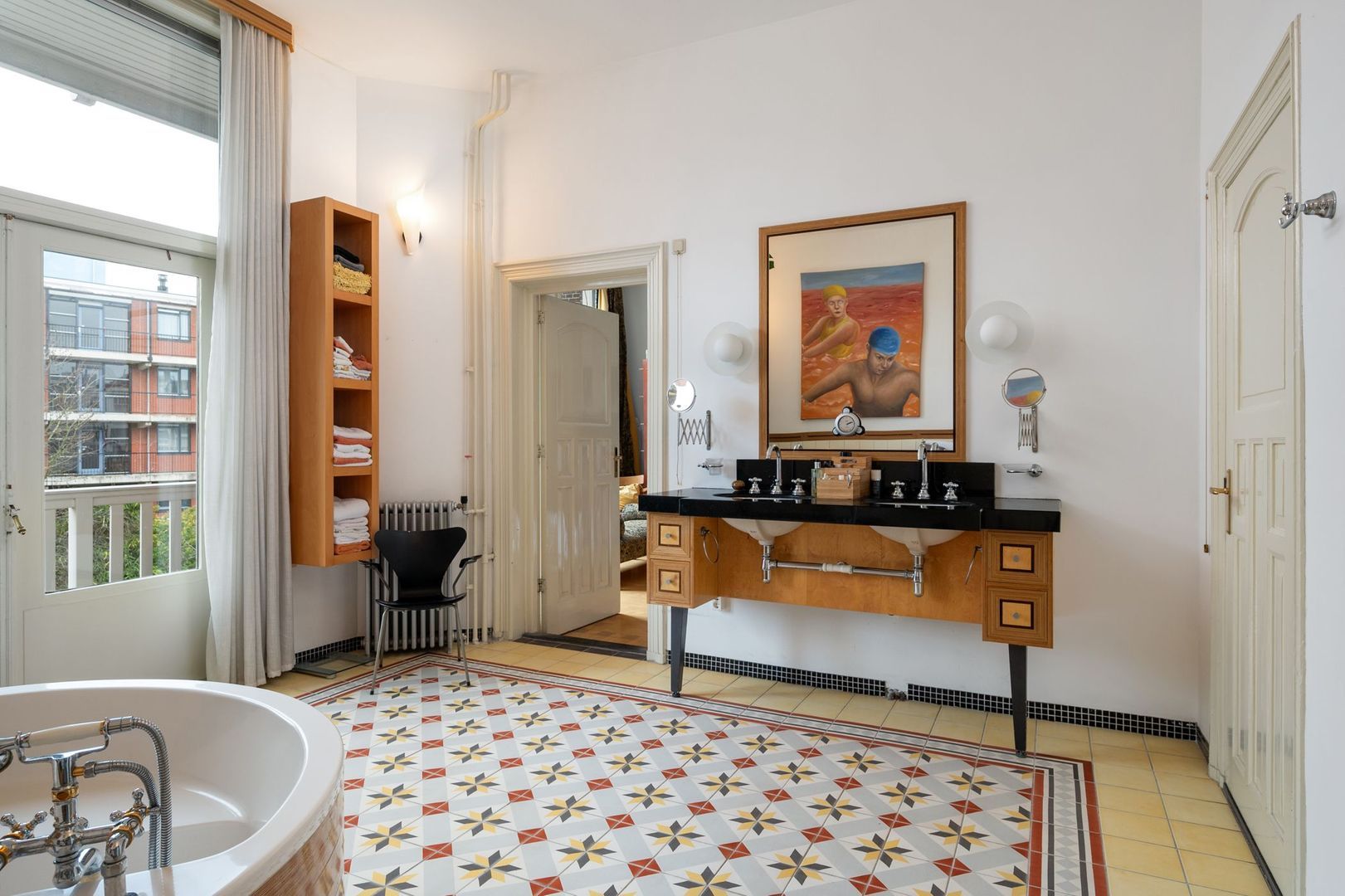 Heel grote slaapkamer (met grote inloopkast) aan de tuinzijde met aansluitende grote badkamer (met terras) met bad, aparte douche ruimte en aparte wc.