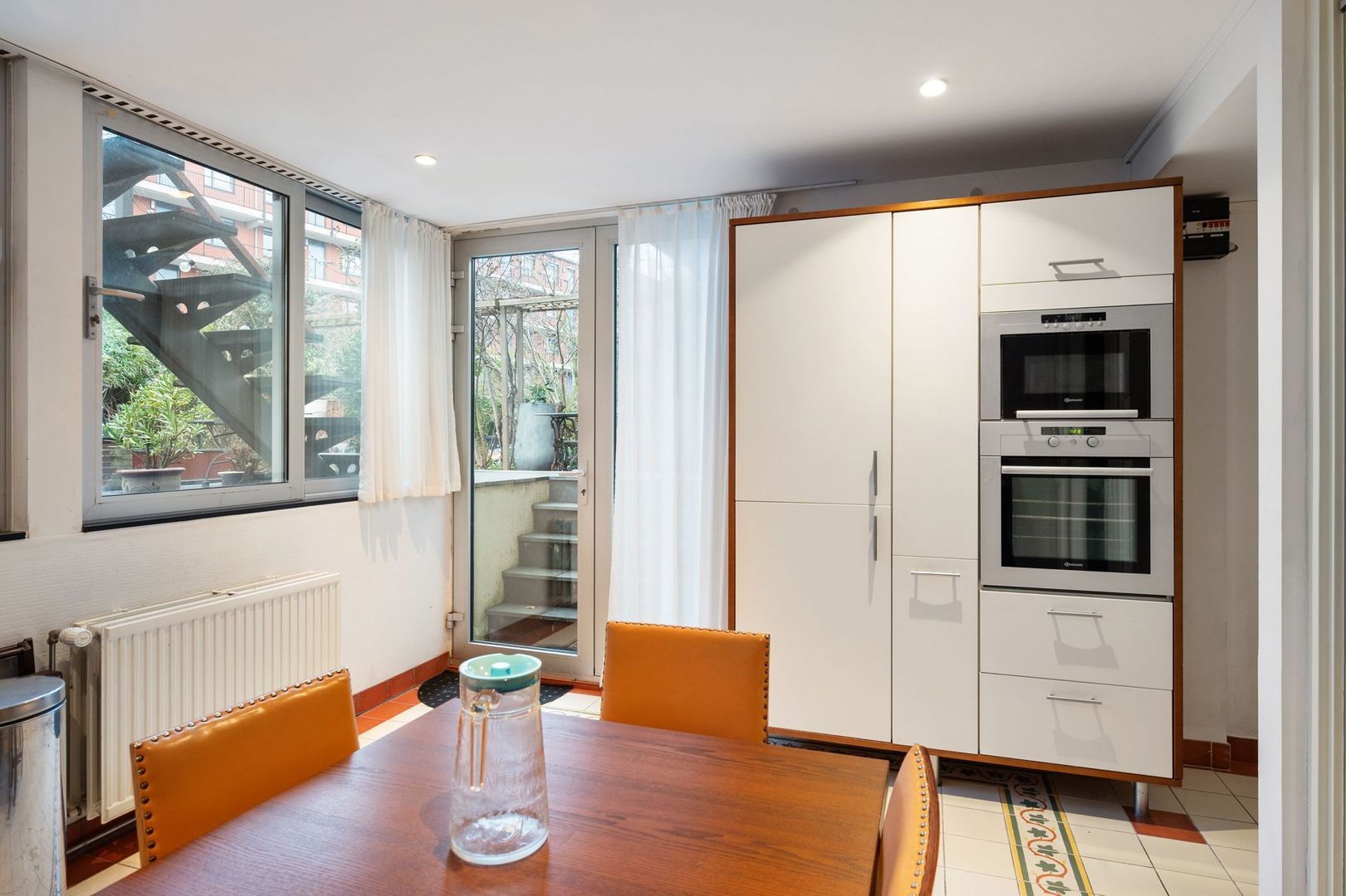 Grote ruimte verdeeld in diverse ruimten met in ieder geval 3 slaapkamers, een keuken, een badkamer en veel berg/kastruimte. Toegang tot ‘eigen’ terras van de tuin en een eigen toegang tot het trottoir.