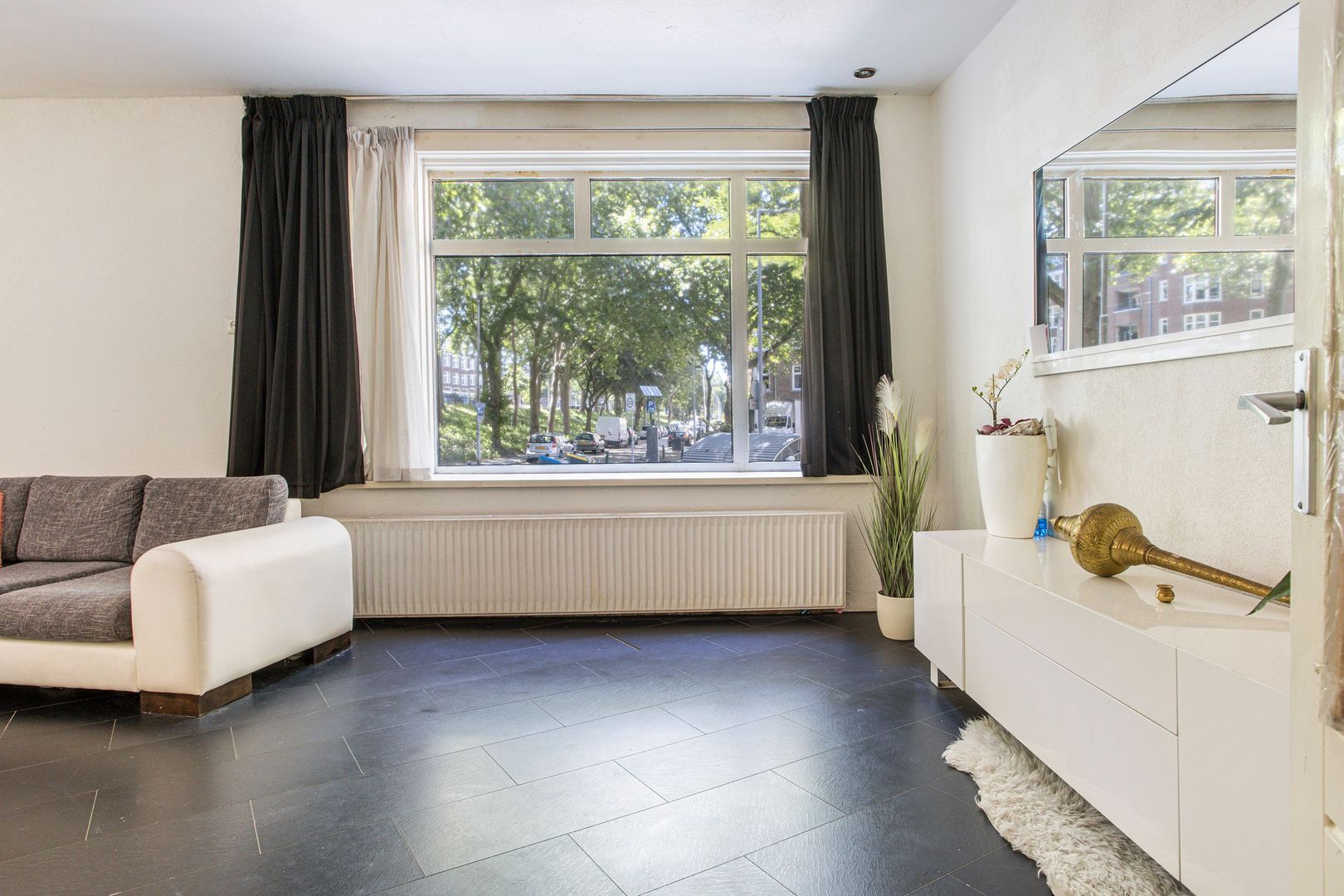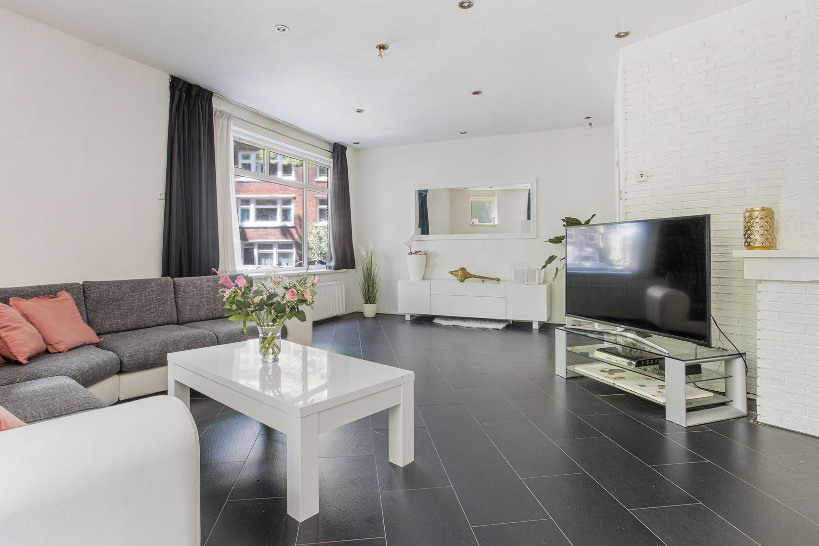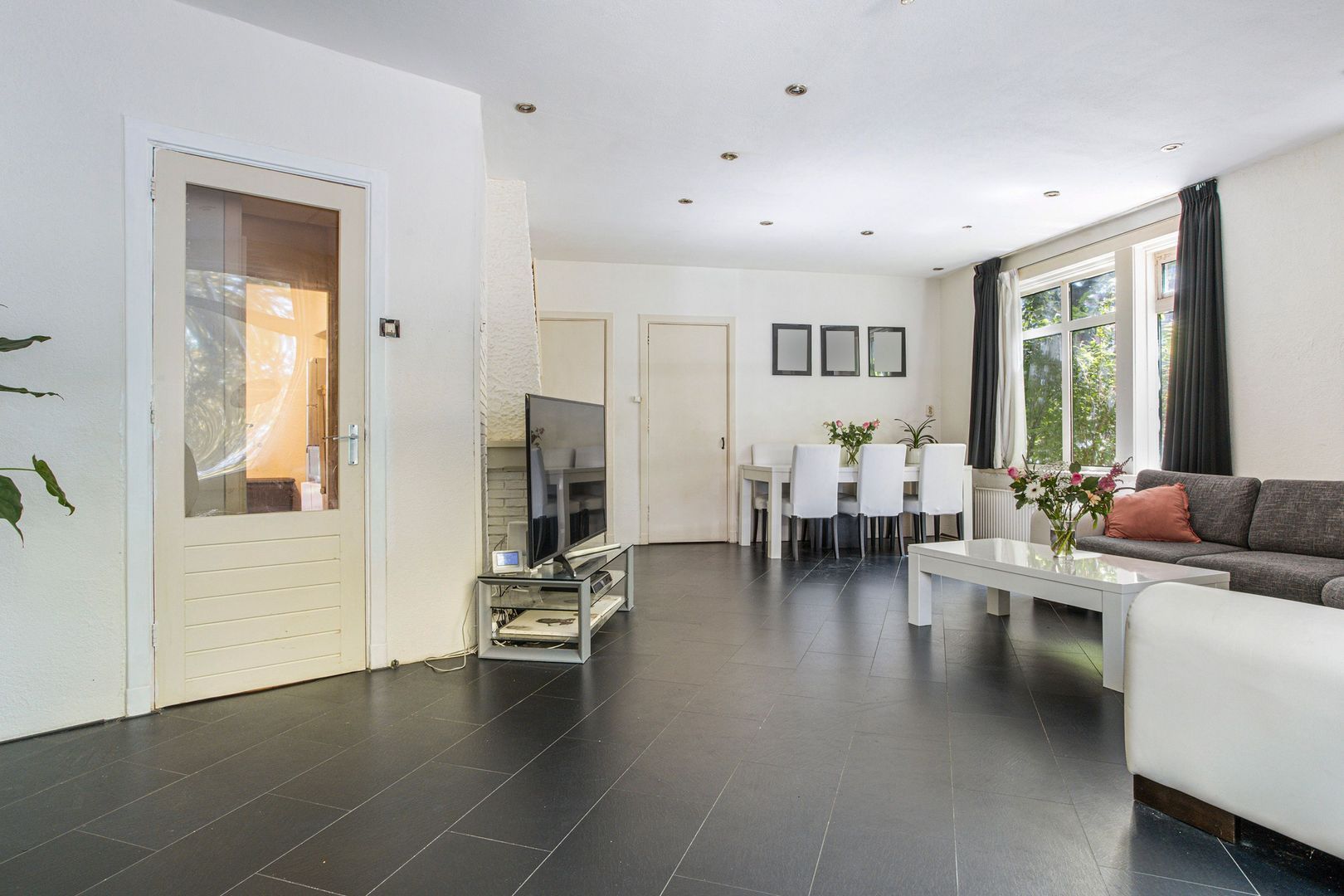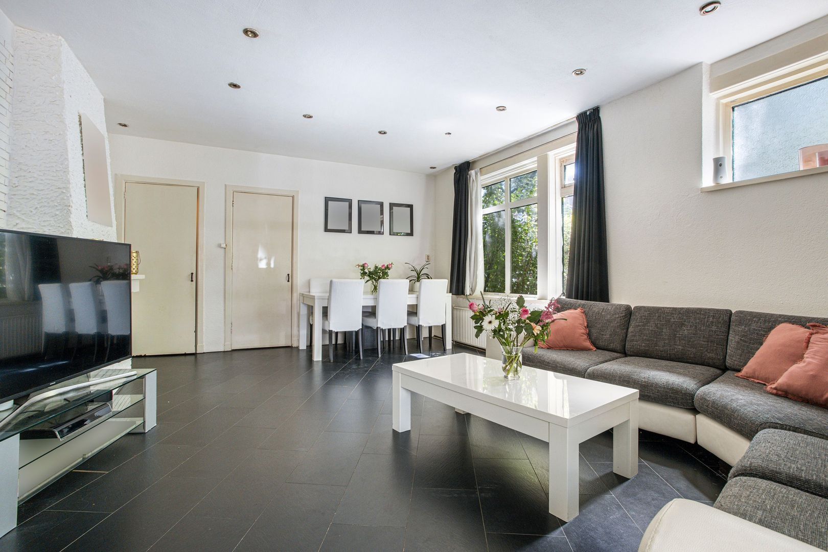 Zeer ruime ‘geknikte’ woonkamer (1) ca. 37m2 met fijn pleincontact en 2 grote vaste kasten.