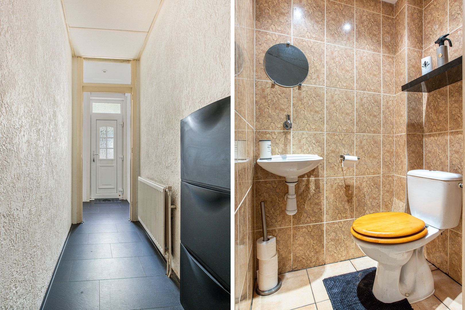 Entree, lange gang met toiletruimte met wc.