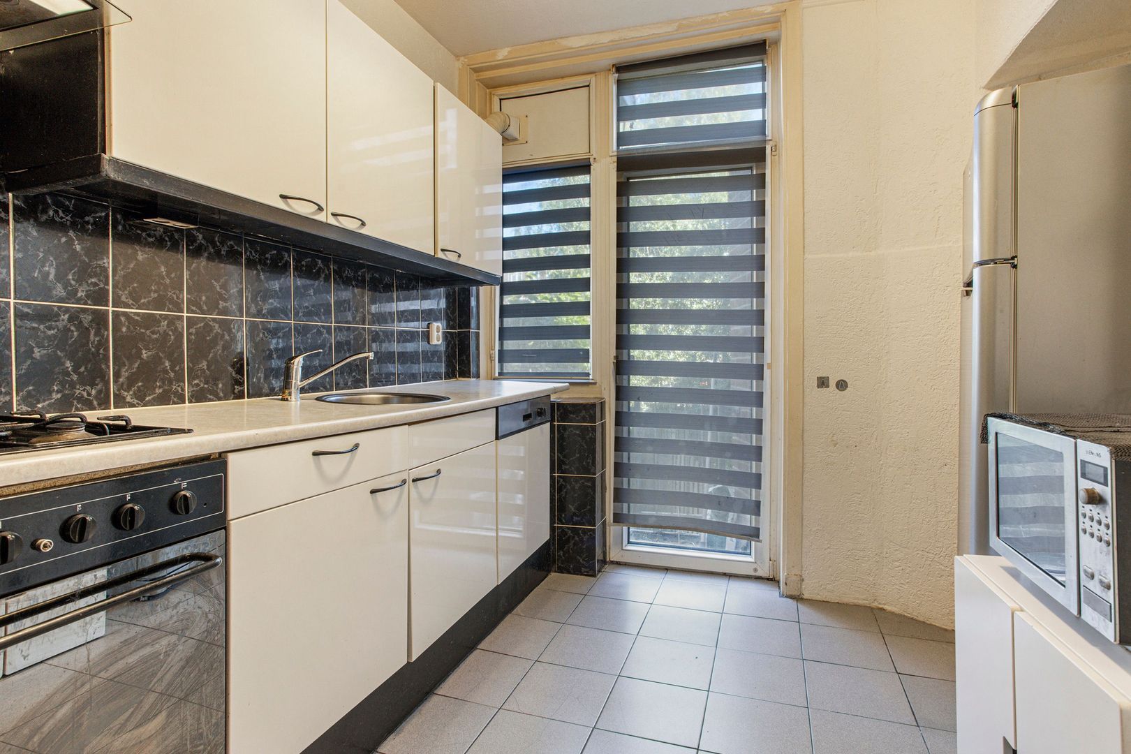 Keuken aan tuinzijde met keukenopstelling met apparatuur en een deur naar de lager gelegen TUIN.