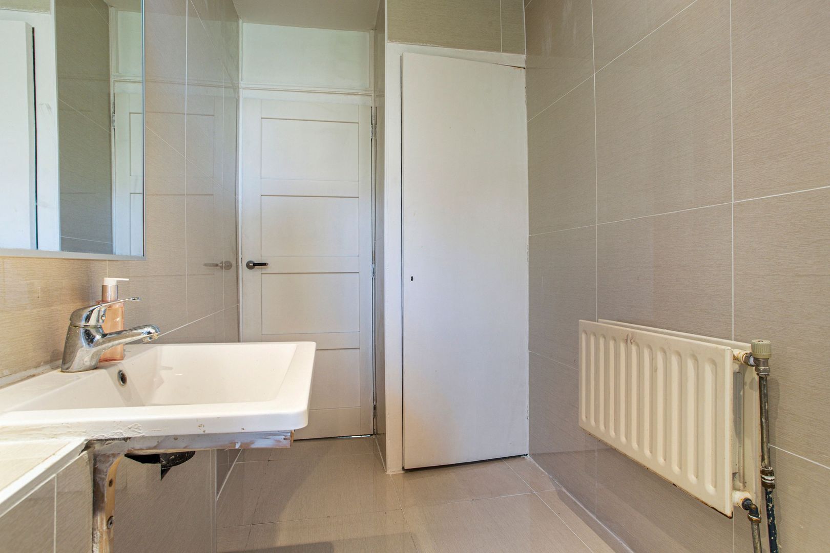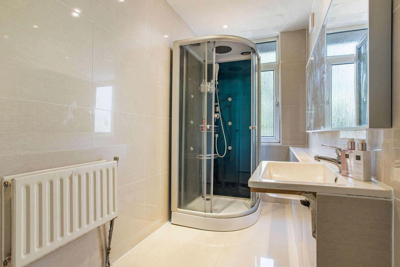 Badkamer voorzien van wastafel en douchecabine.