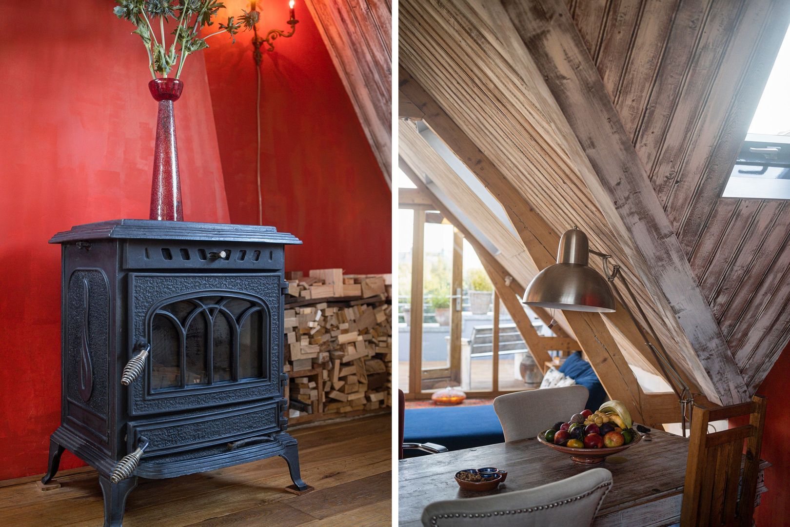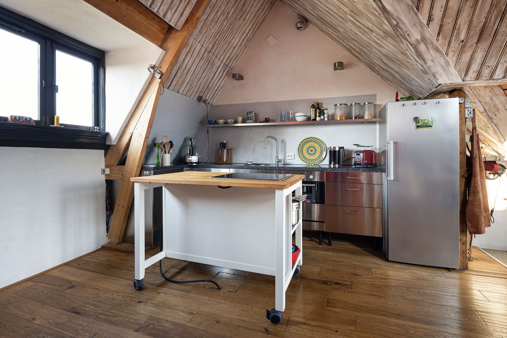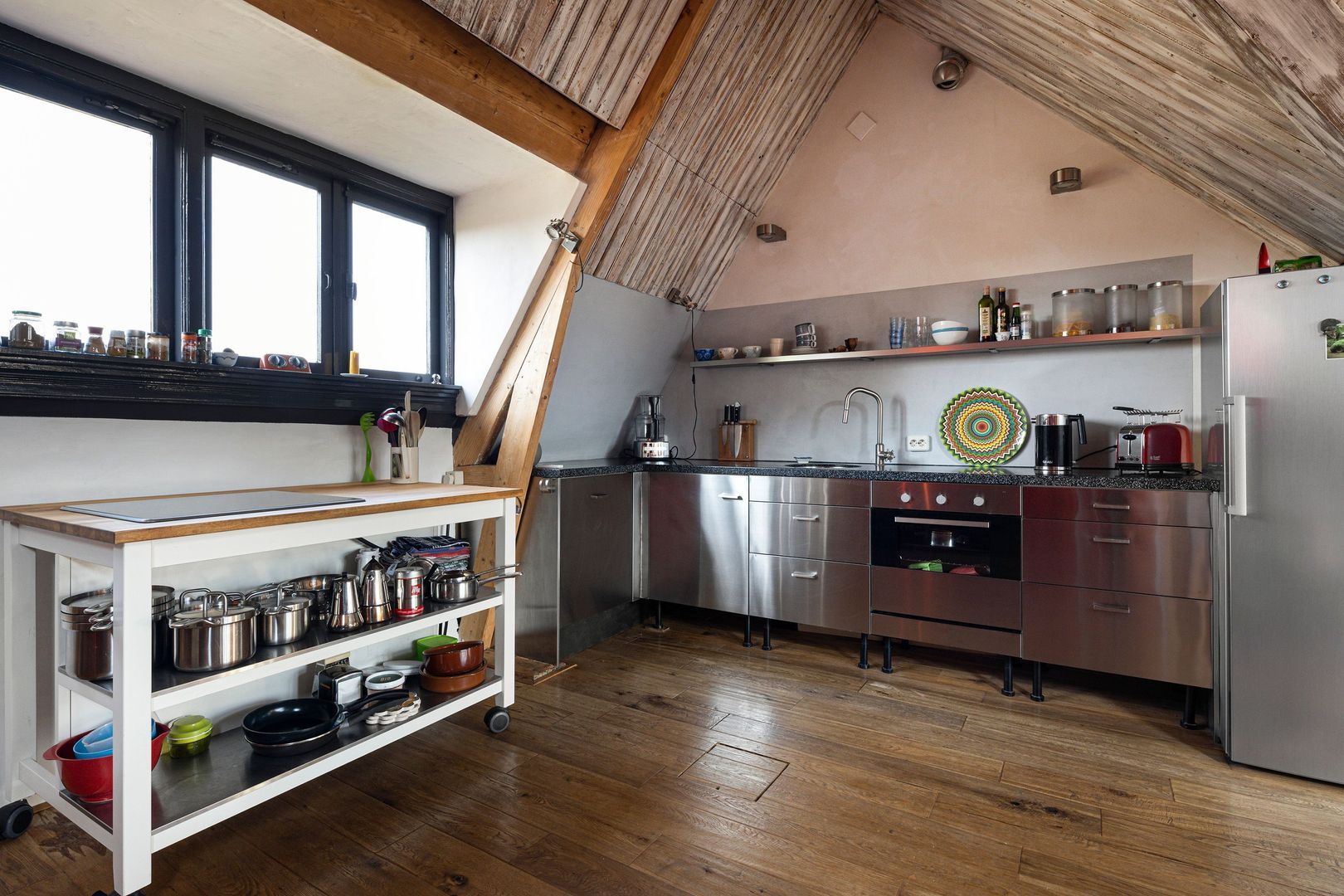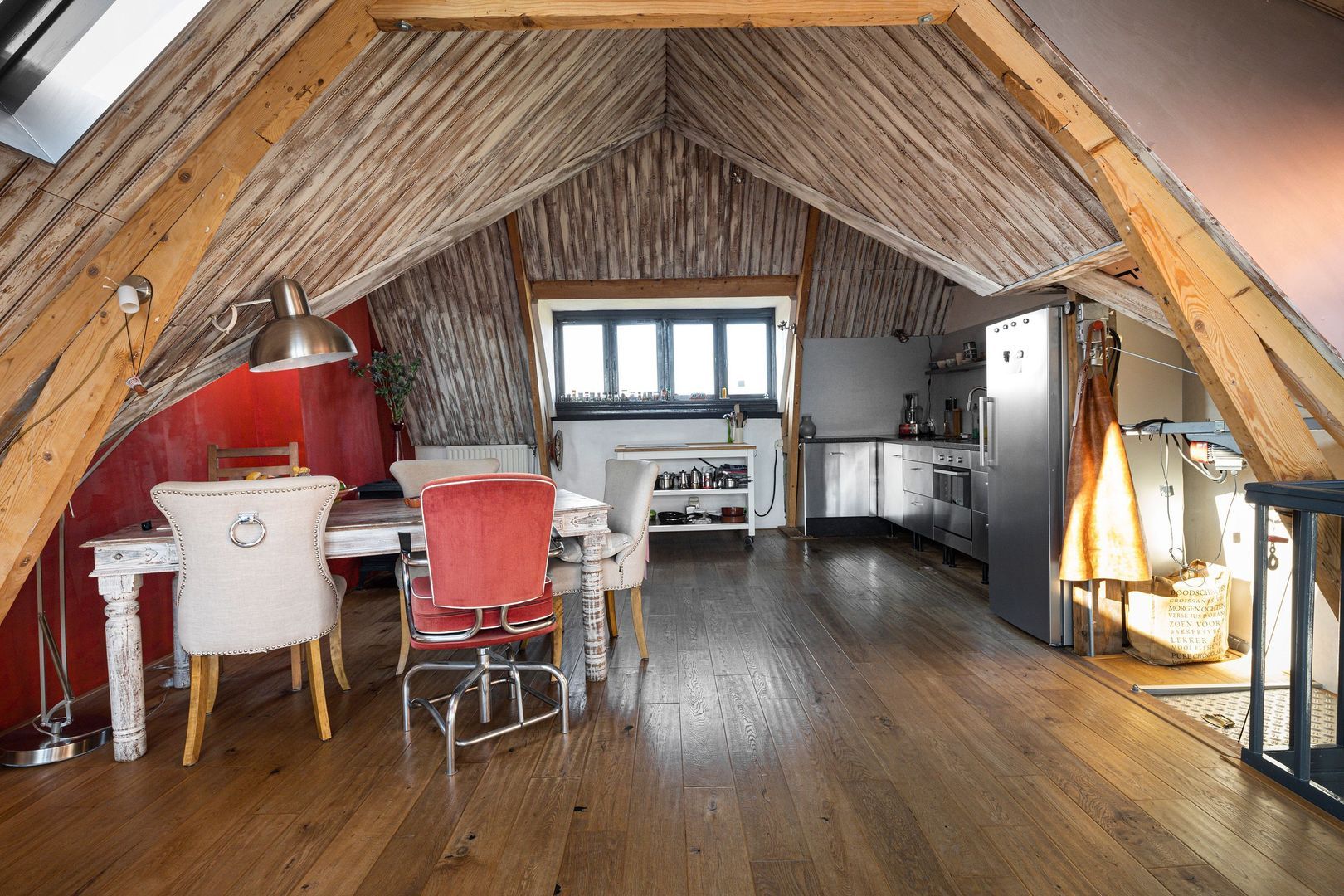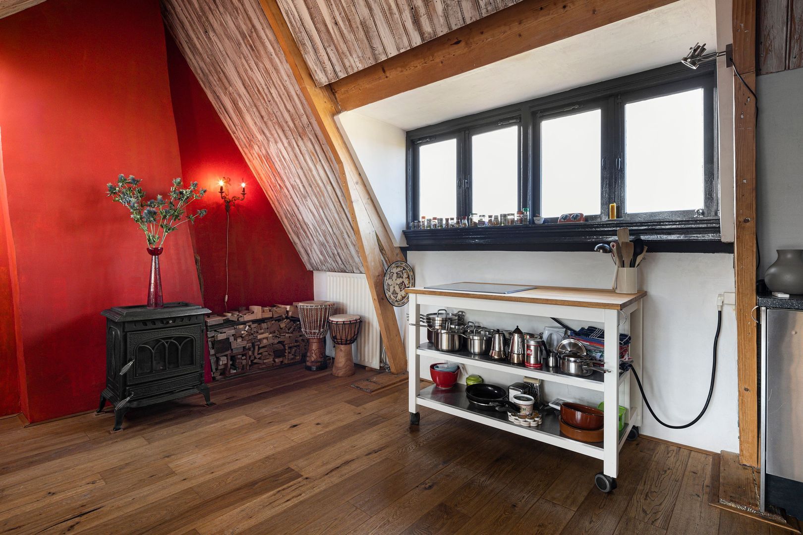 Opmerkelijke en onalledaagse LEEFRUIMTE ‘onder de nok’ (4) ca. 40 m2 met GLAZEN GEVEL met openslaande deuren naar het heerlijke TERRAS (ca. 16 m2). Deze ruimte beschikt over een uitgekiende keuken met een flexibel, verplaatsbaar keuken-eiland, een sfeervolle houtkachel en zelfs een ingenieuze ‘goederentakel’.
