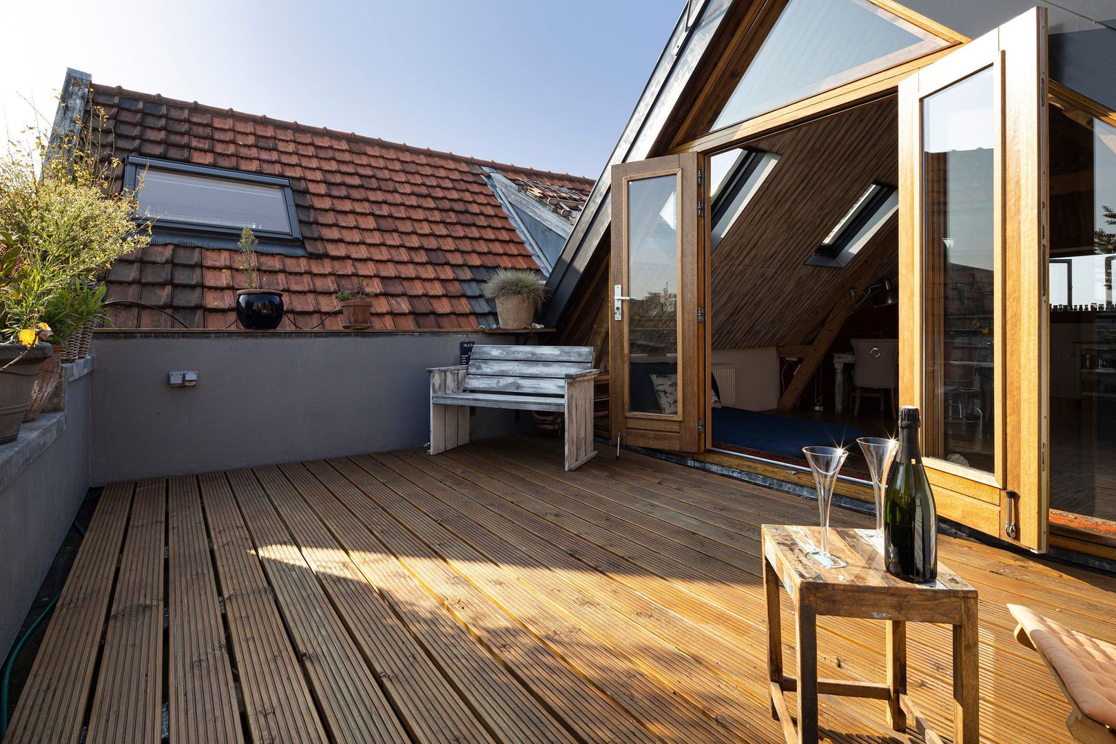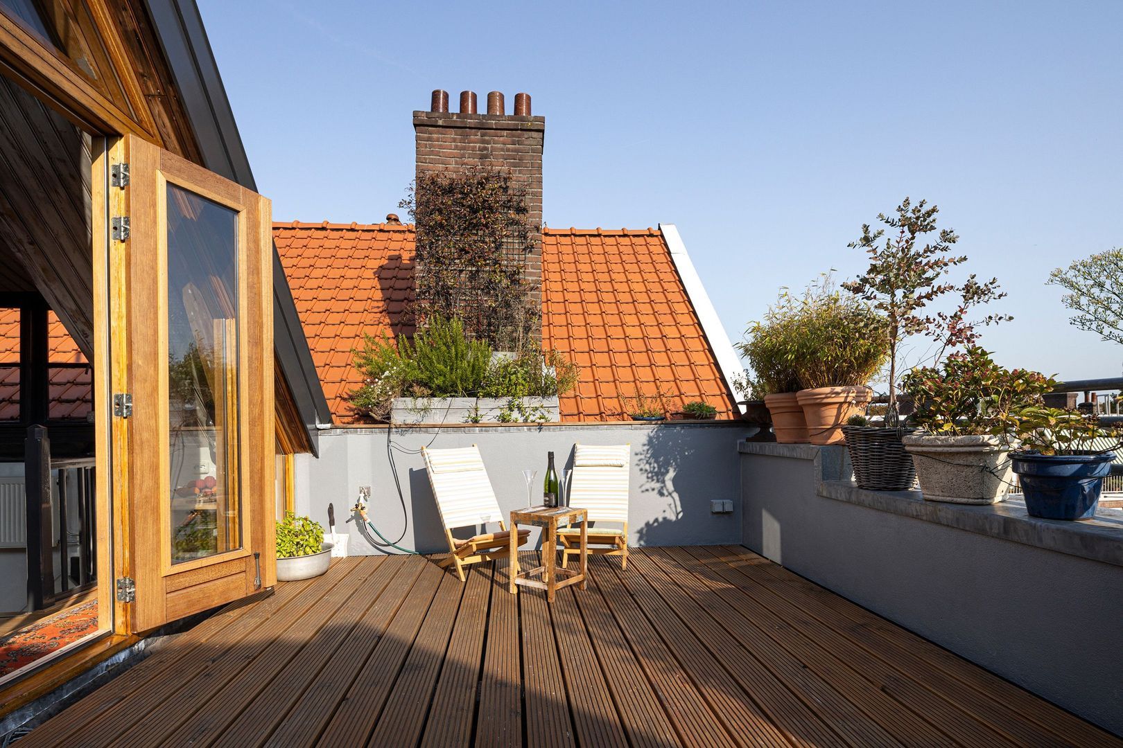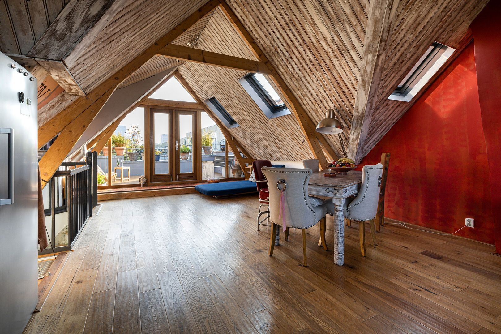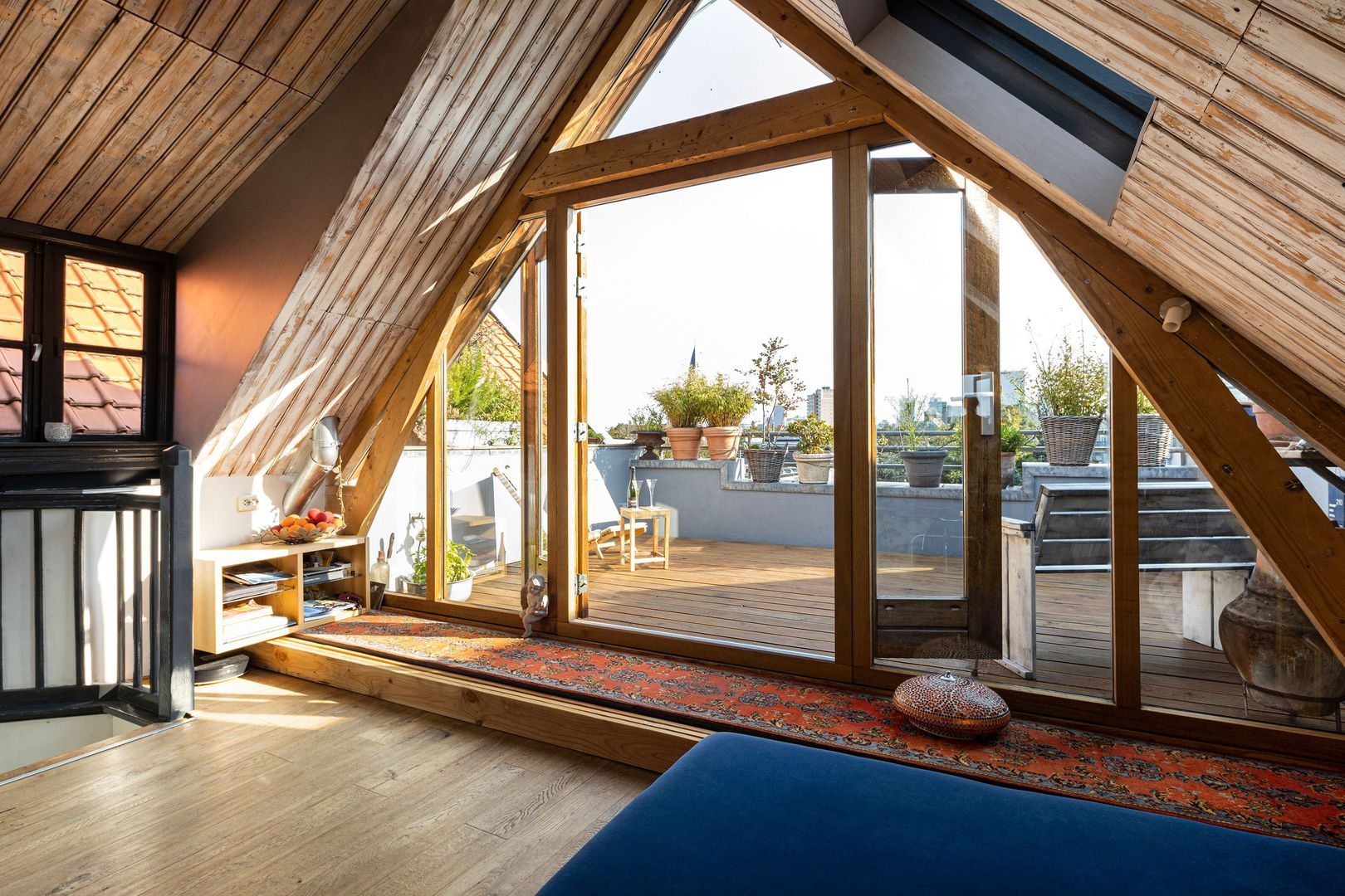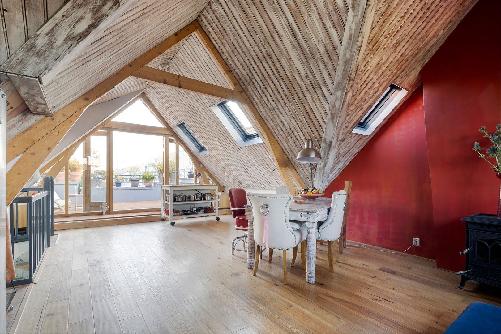 Opmerkelijke en onalledaagse LEEFRUIMTE ‘onder de nok’ (4) ca. 40 m2 met GLAZEN GEVEL met openslaande deuren naar het heerlijke TERRAS (ca. 16 m2). Deze ruimte beschikt over een uitgekiende keuken met een flexibel, verplaatsbaar keuken-eiland, een sfeervolle houtkachel en zelfs een ingenieuze ‘goederentakel’.