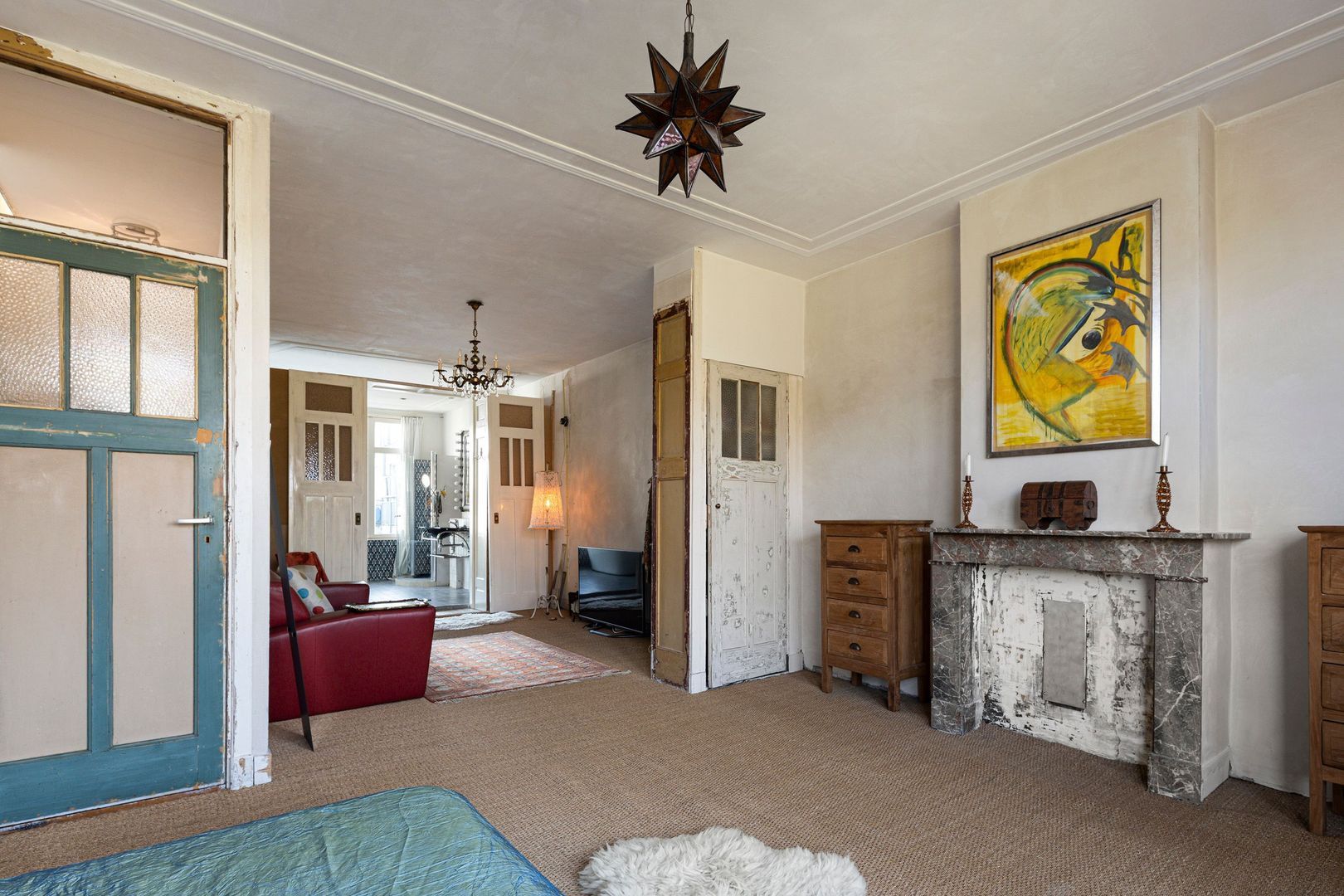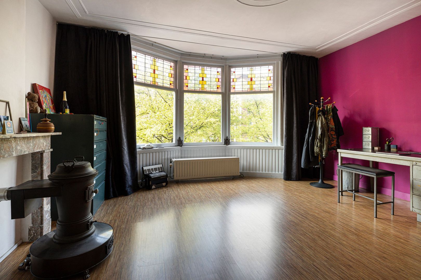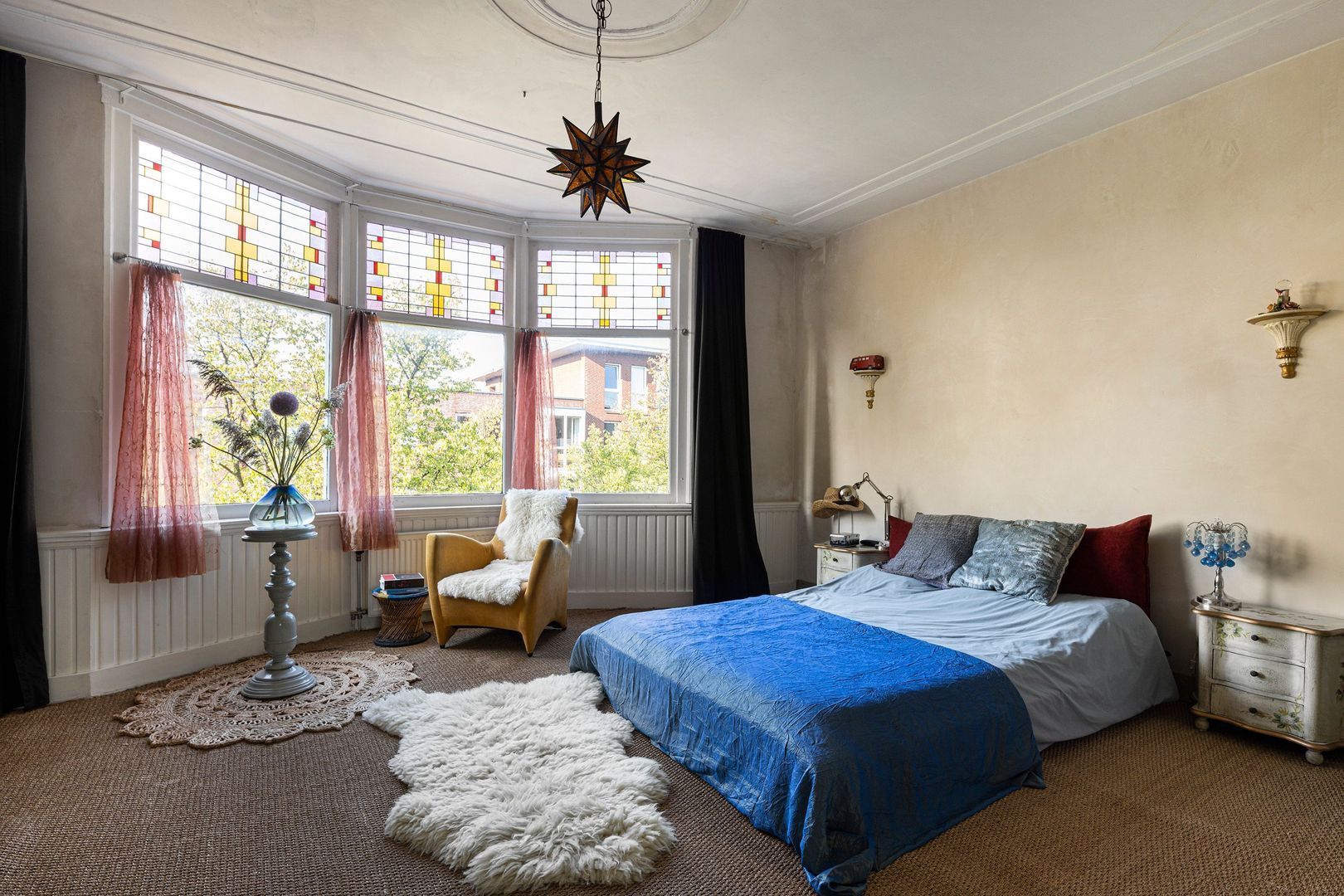 Grote voor/middenkamer (3), nu in gebruik als slaapkamer met (wederom) een grote erker met raampartij met veel en rustig licht uit het Noorden. Er is een fraaie oorspronkelijke schouw.