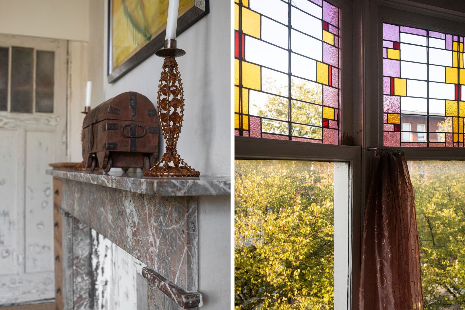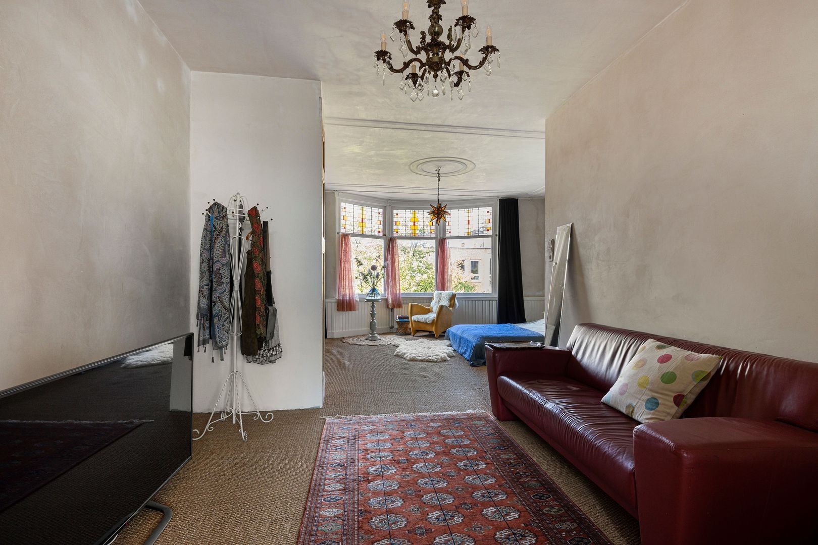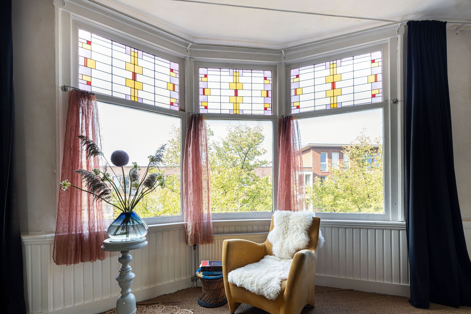Grote voor/middenkamer (3), nu in gebruik als slaapkamer met (wederom) een grote erker met raampartij met veel en rustig licht uit het Noorden. Er is een fraaie oorspronkelijke schouw.