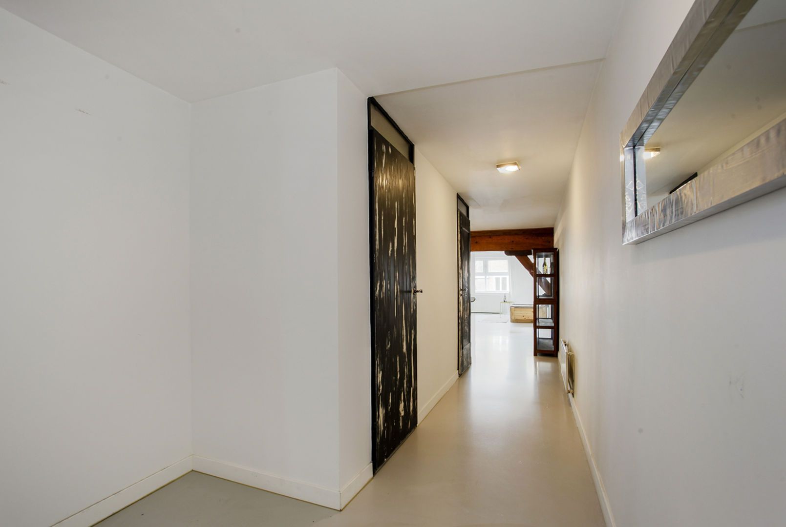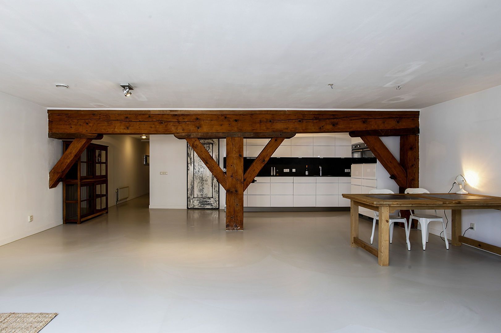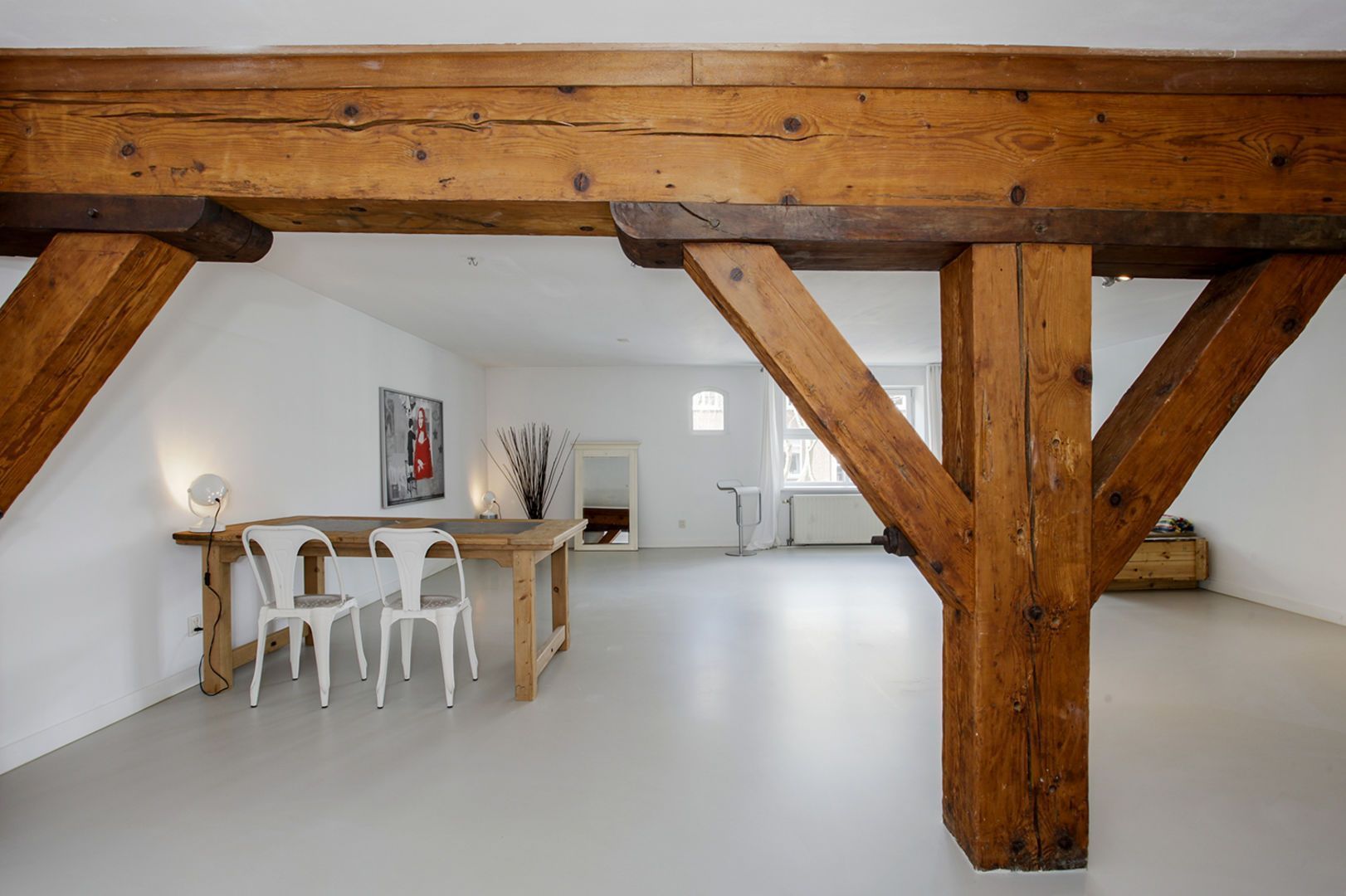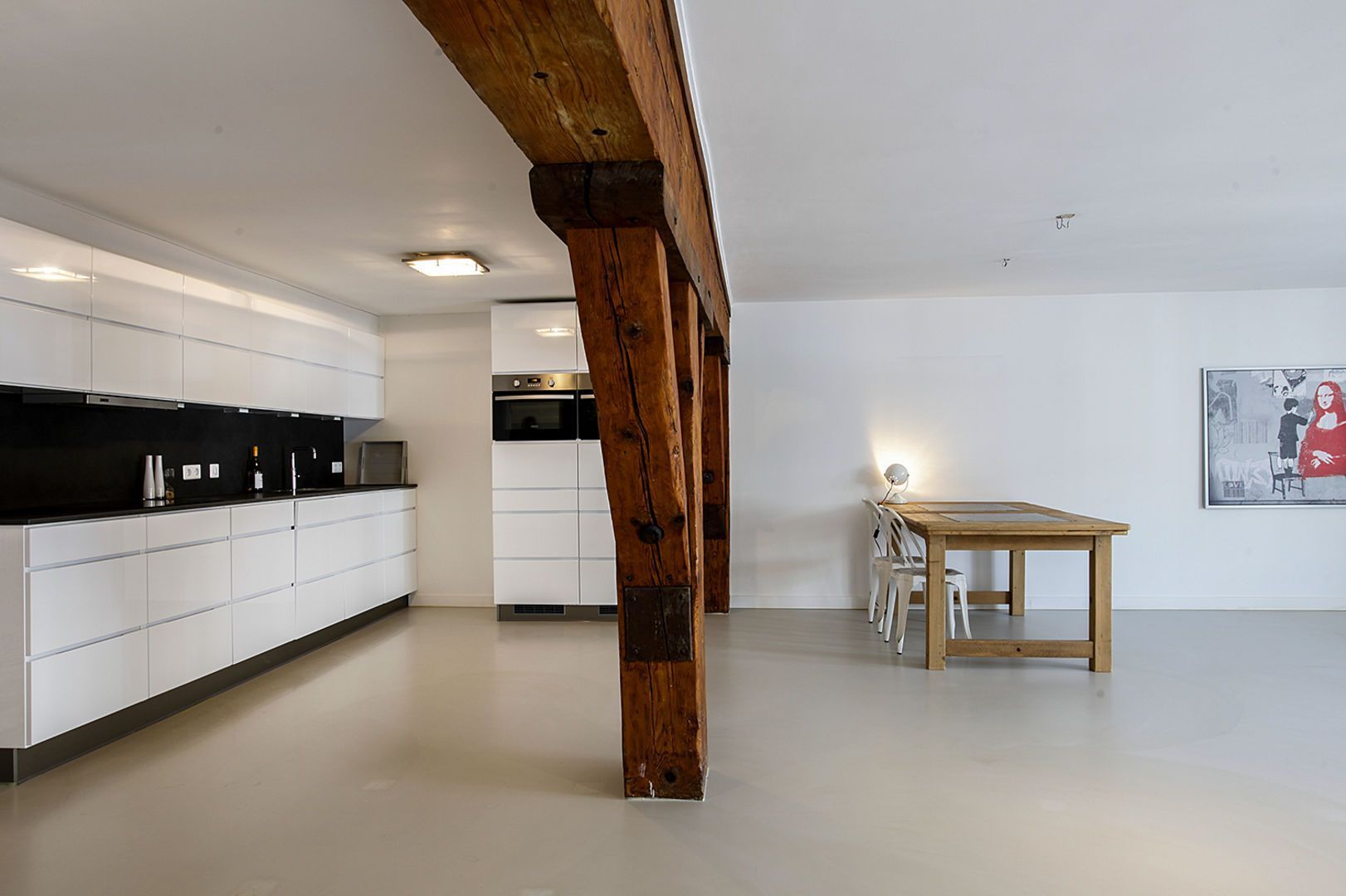 In het appartement zijn oorspronkelijke balken in het zicht gebleven.