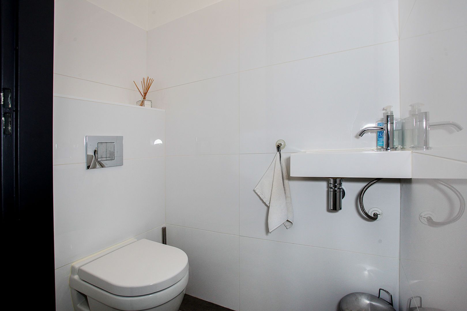 Gang met berging/garderobe en toiletruimte met hangcloset en wasbakje.