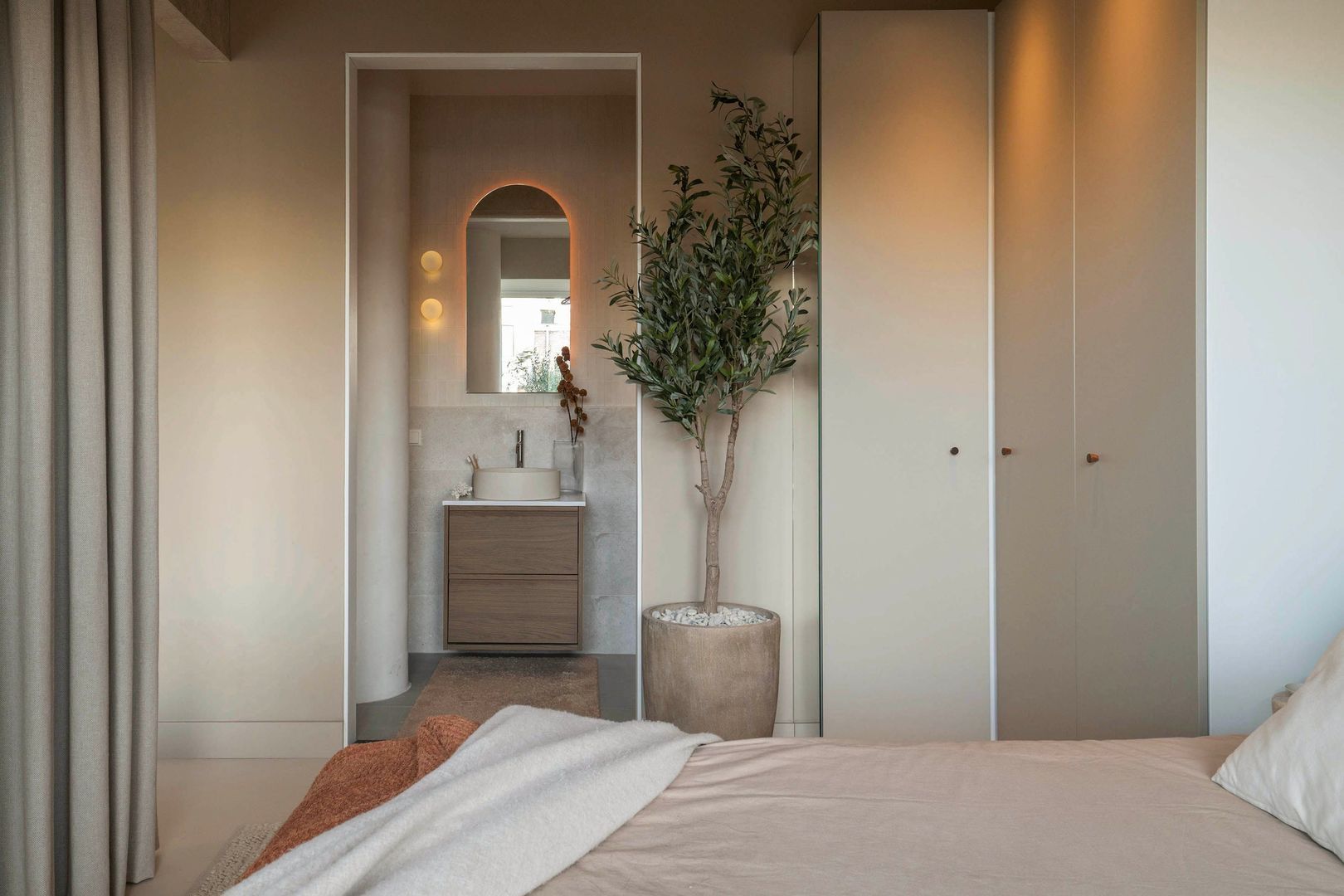 Via een open verbinding te bereiken slaapkamer (2) ca. 10m², met wederom een geheel glazen gevel waarin een deur naar het terras.  Deels ‘open’ badkamer voorzien van een douche en wastafel met wastafelmeubel.