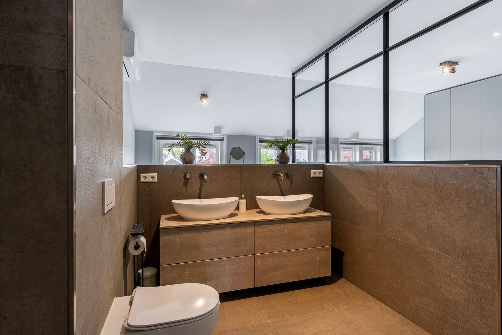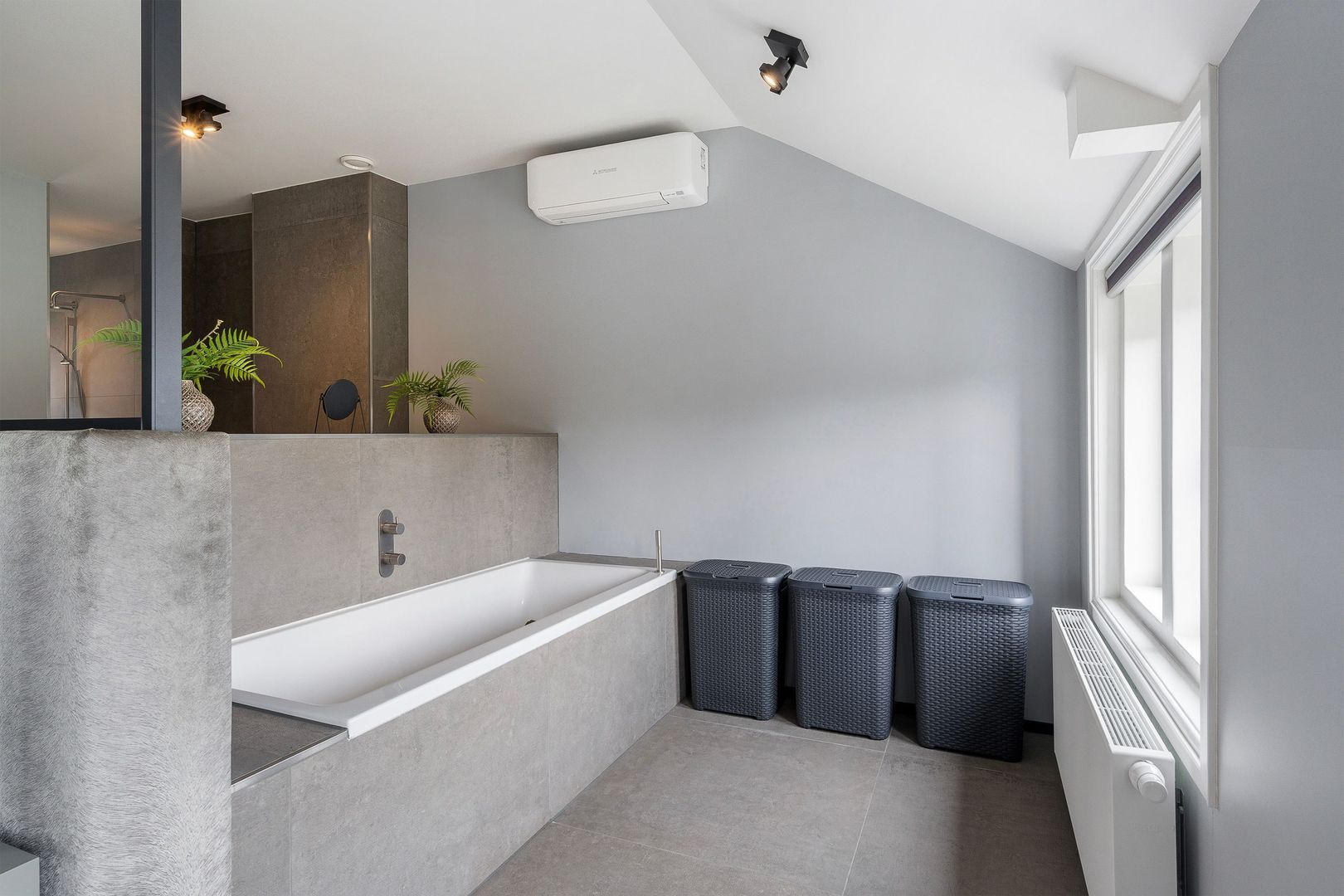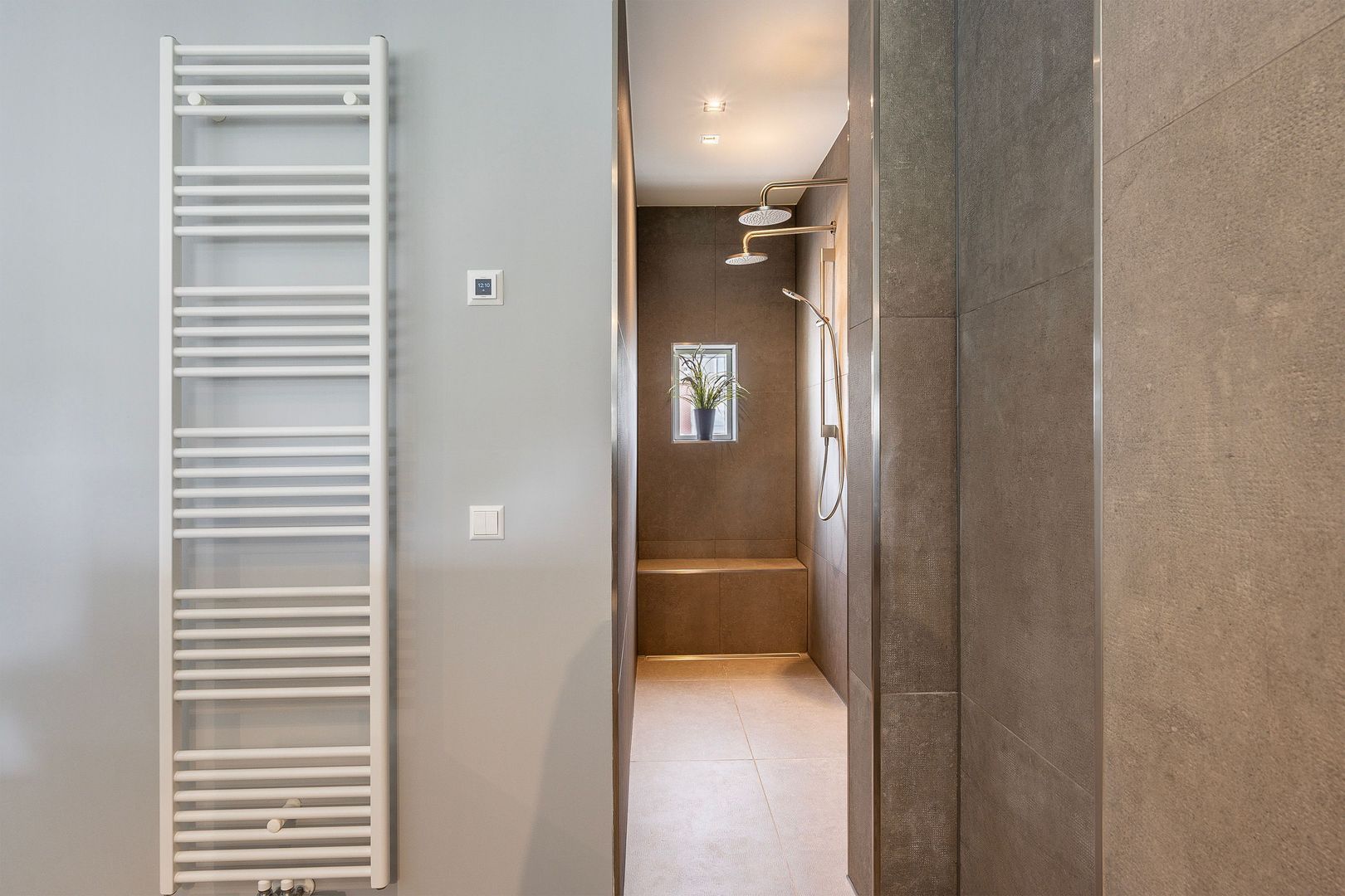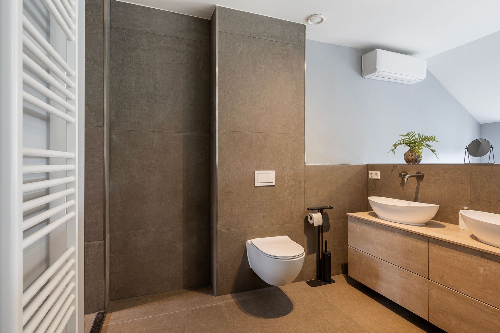 Badkamer met 2 regendouches, een ligbad, een 2e toilet, een dubbele wastafel met