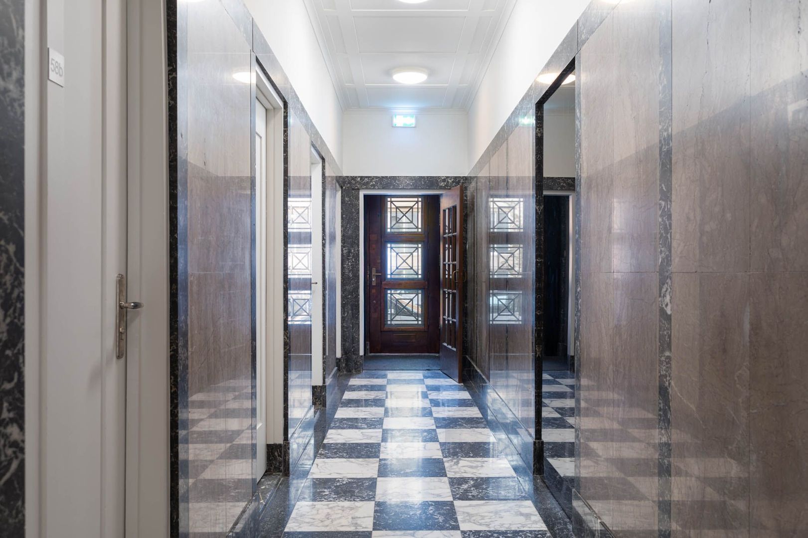Entree; fraaie, brede marmeren gang en hall met trappenhuis en lift.